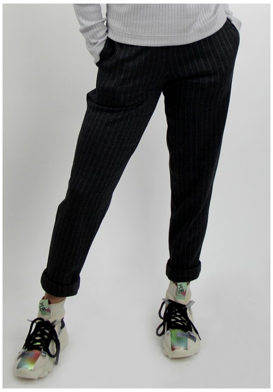 Брюки второго слоя, зауженые книзу, с высоким подгибом для отворота. Передняя половинка брюк с цельнокроеным поясом и карманом в боковом шве. По задним половинкам брюк пояс притачной. В пояс проложена широкая резиновая тесьма.