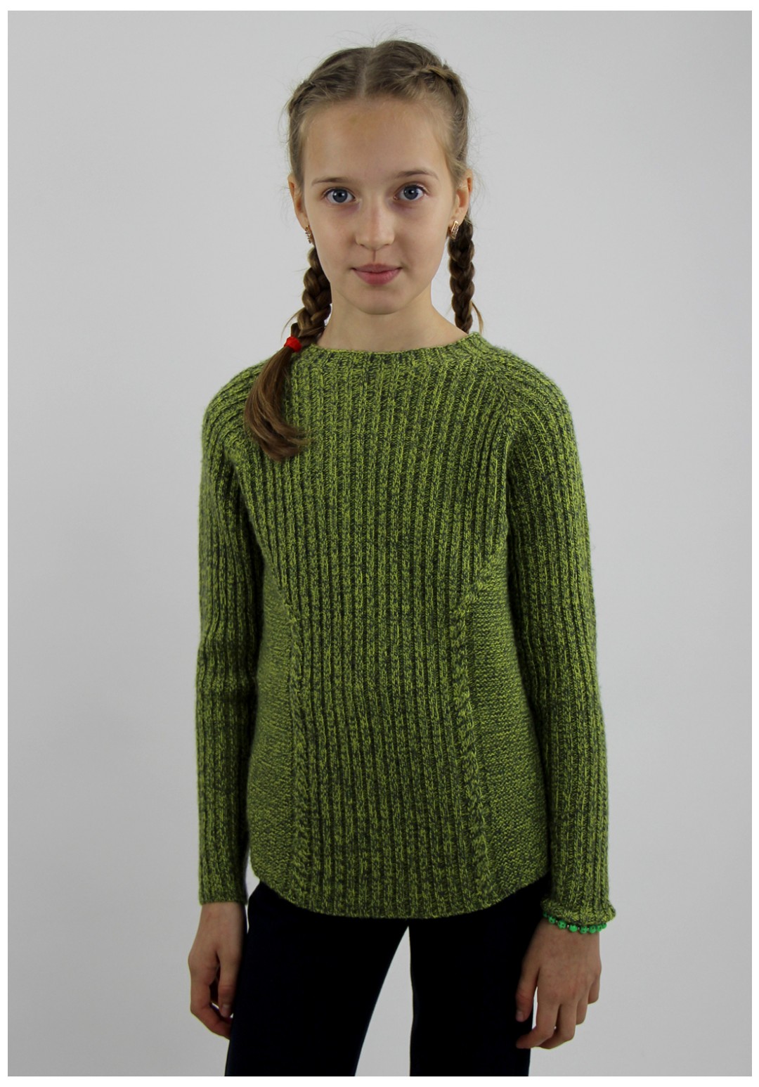 Джемпер второго слоя одежды. Цельновывязанный с рукавом реглан. Круглый вырез горловины заработан ластиком 2х2 высотой в гот. виде 2,5см+-0,2см.