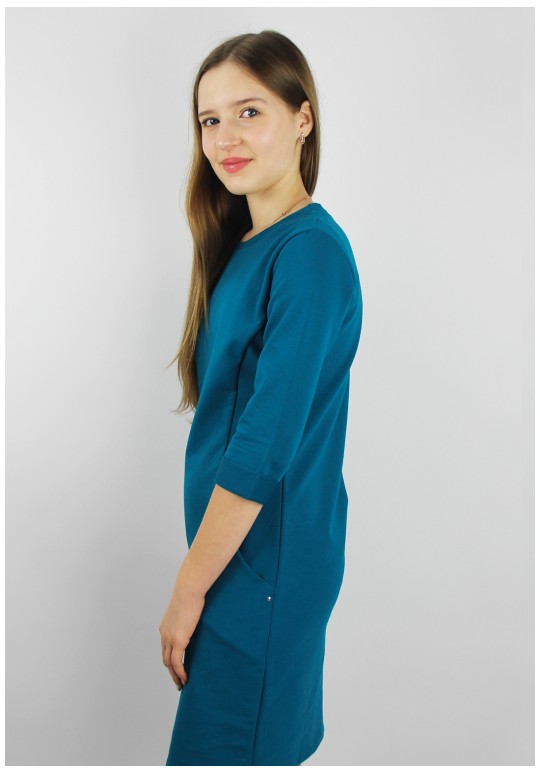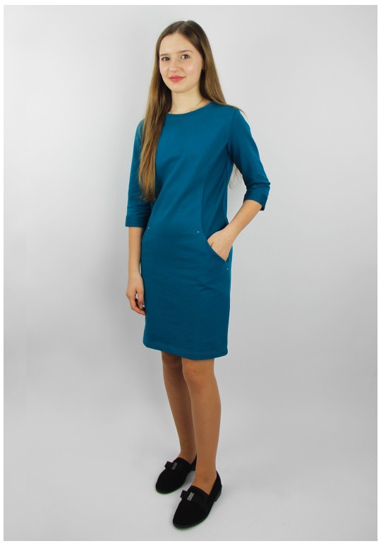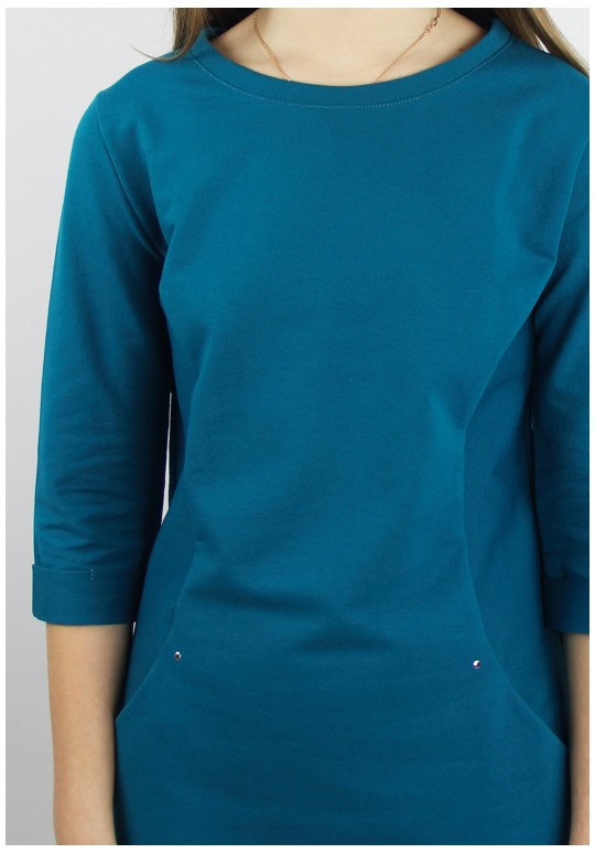Платье полуприлегающего силуэта, расклешонное к низу, с втачным рукавом длиной за линию локтя. Рукав с отворотом, на отвороте выполнены закрепки. В боковых деталях переда обработаны карманы. На карманах по 2 термостразы. Горловина - лодочка. Длина платья до середины бедра.