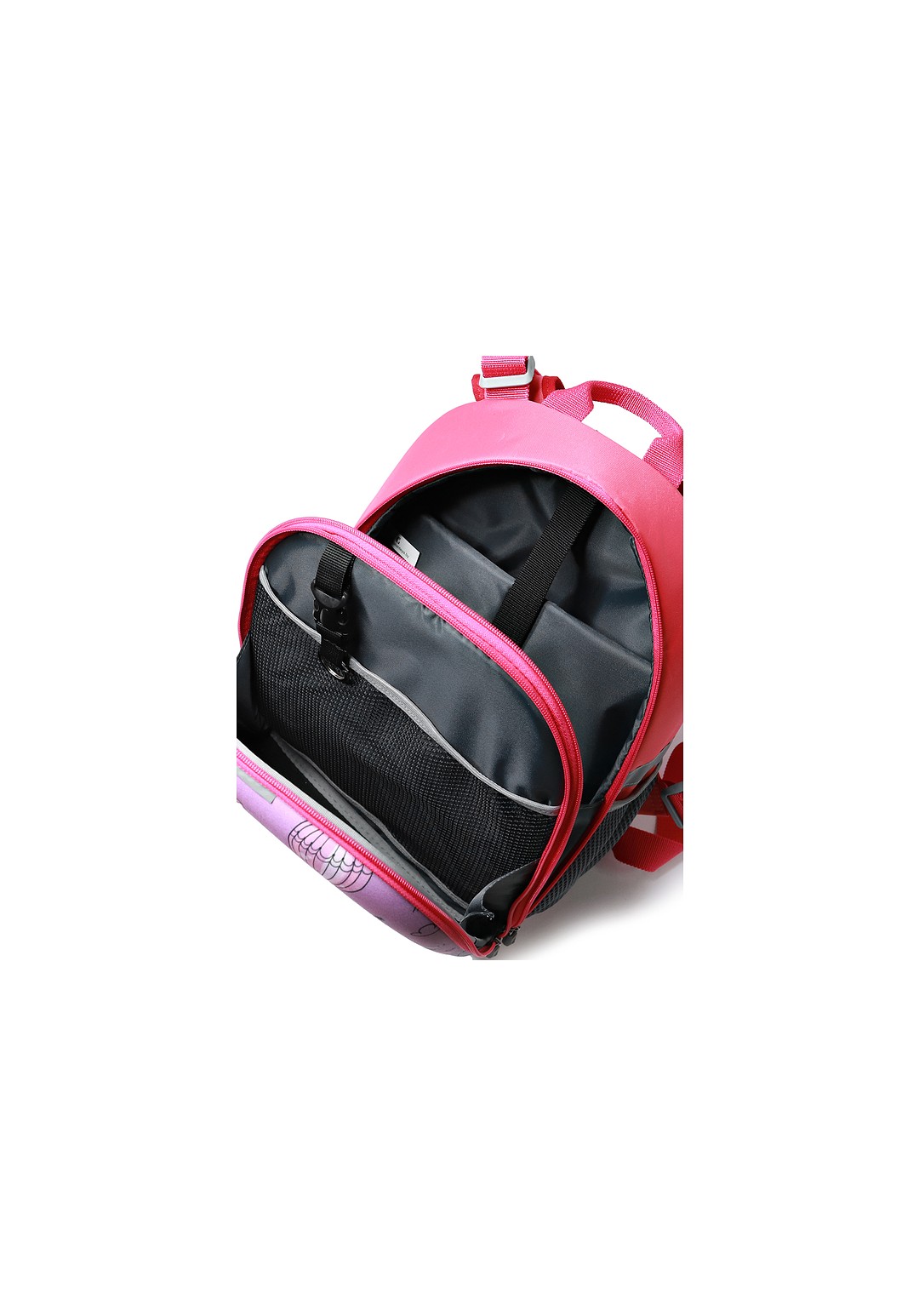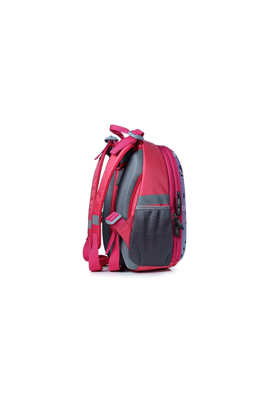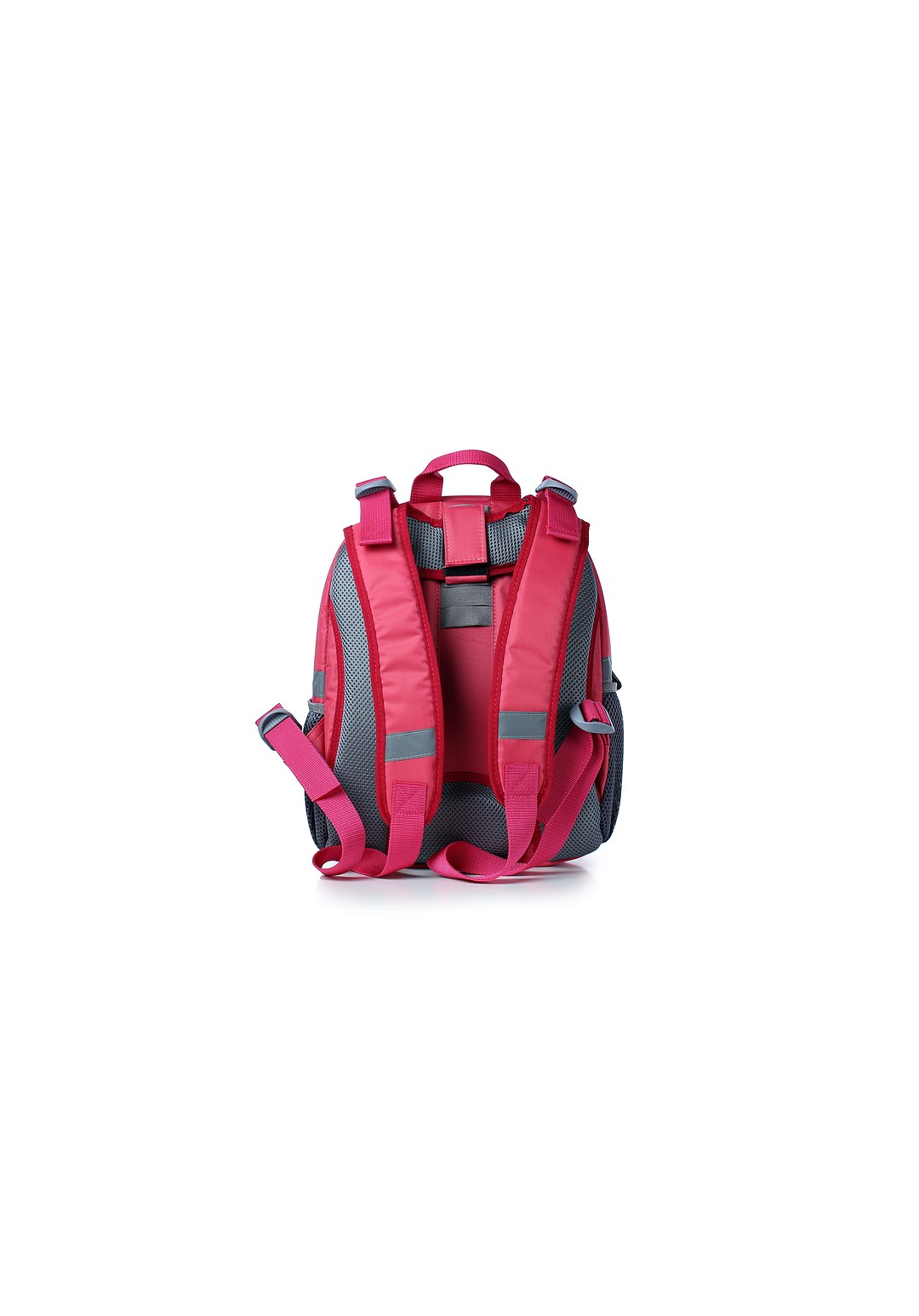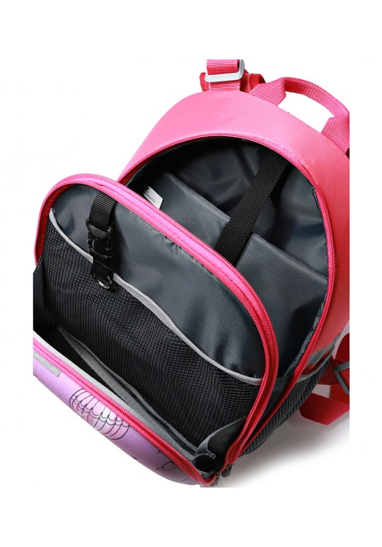 Рюкзак из синтетической ткани с формованной передней стенкой, на два отделения, закрывающимися на застежку-молнию, с двумя регулирующимися плечевыми ремнями максимальной длины 940+-10мм, с полужесткой задней стенкой, с мягкими накладками на задней стенке, с окантовкой накладок и плечевых ремней, со светоотражающими элементами, с открытыми боковыми карманами из сетки, с окантовкой верхнего края боковых карманов эластичной лентой. Фурнитура - черный никель, пластмассовая. Рюкзак на подкладке, с открытым уплотненным карманом - перегородкой, закрывающимся на ленту контакт, с открытым карманам на резинке, с держателем, с окантовкой швов.