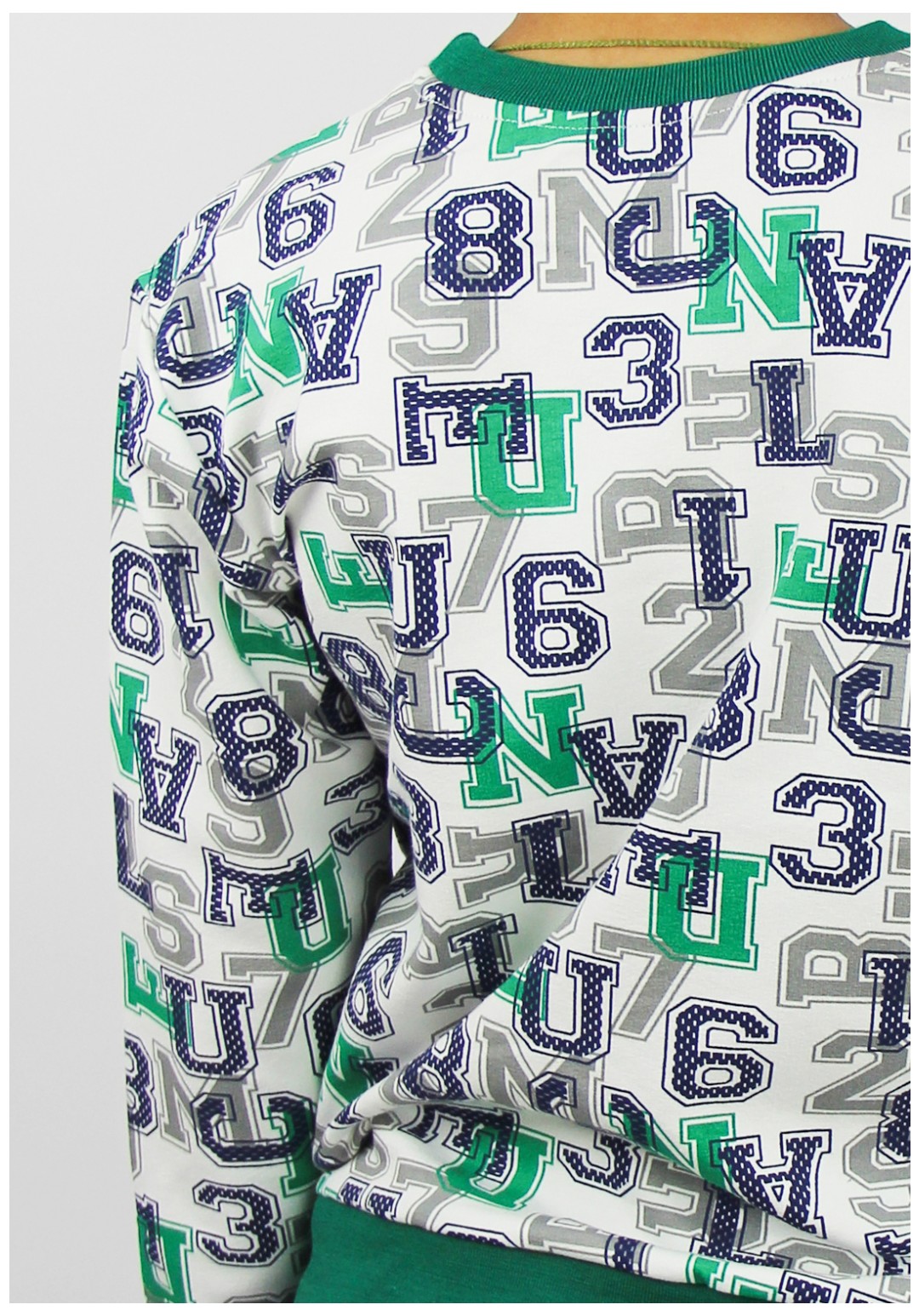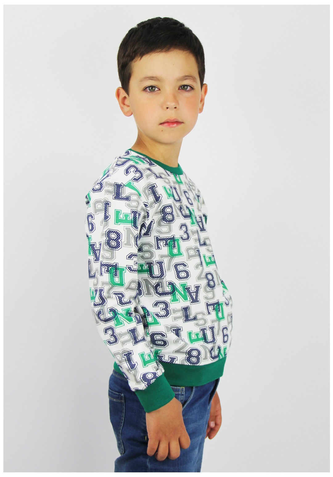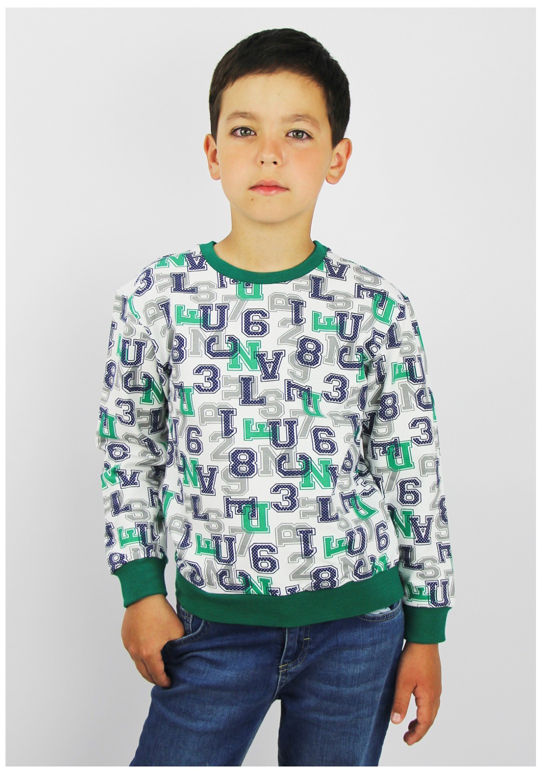 Джемпер прямого силуэта с длинным рукавом рубашечного покроя. Низ джемпера с притачным поясом, низ рукава с притачными манжетами. Горловина обработана притачной бейкой, росток закрыт контрасной бейкой.