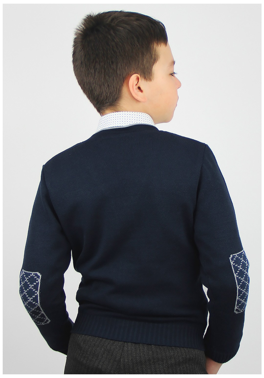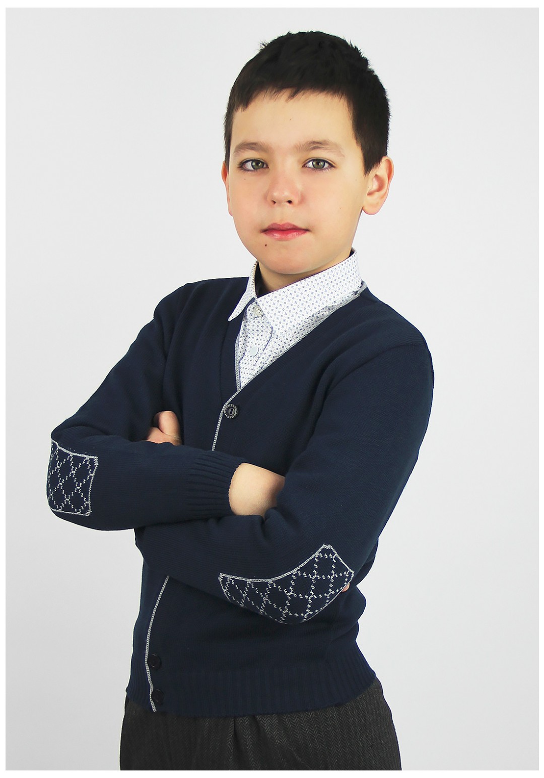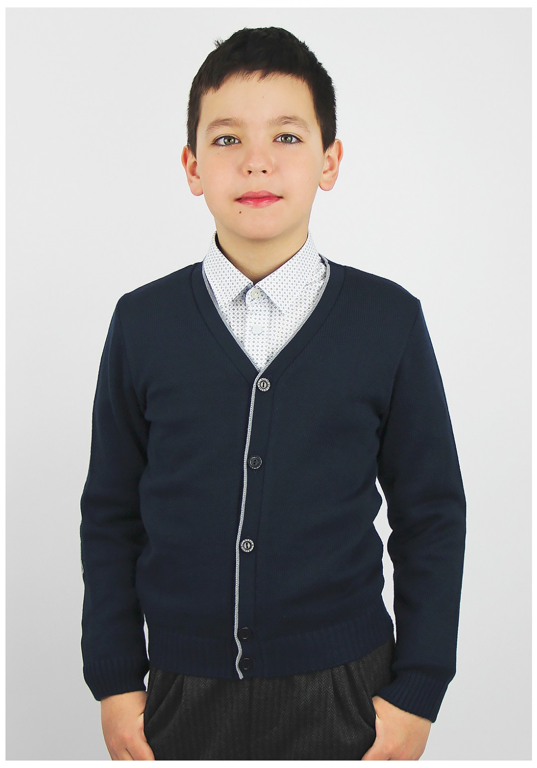 Изделие второго слоя одежды. Притачная бейка высотой 2,5см. По краю бейки проложена полоска контрастного цвета.На рукаве вывязан  рисунок (интарсия ). Количество пуговиц 5+1