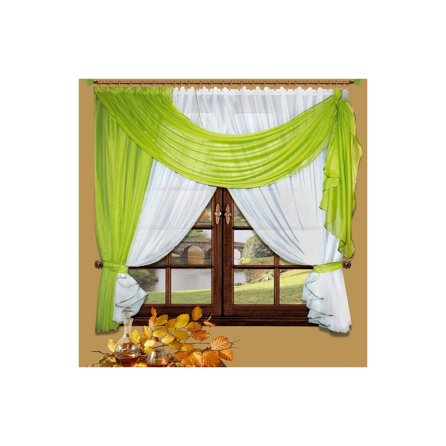 Эта штора, вне всякого сомнения, способна привлечь к себе внимание. Её простой, но эффектный декор сделает окно на Вашей кухне нарядным и, в целом, добавит интерьеру торжественности. Пришитая к одной шторной ленте, модель избавит Вас от лишних операций при развешивании её на карнизе и, соответственно, снятии. А благодаря двум контрастным прихватам, полотна вуали разводятся и фиксируются у краёв, впуская в помещение солнечный свет и открывая доступ к подоконнику.