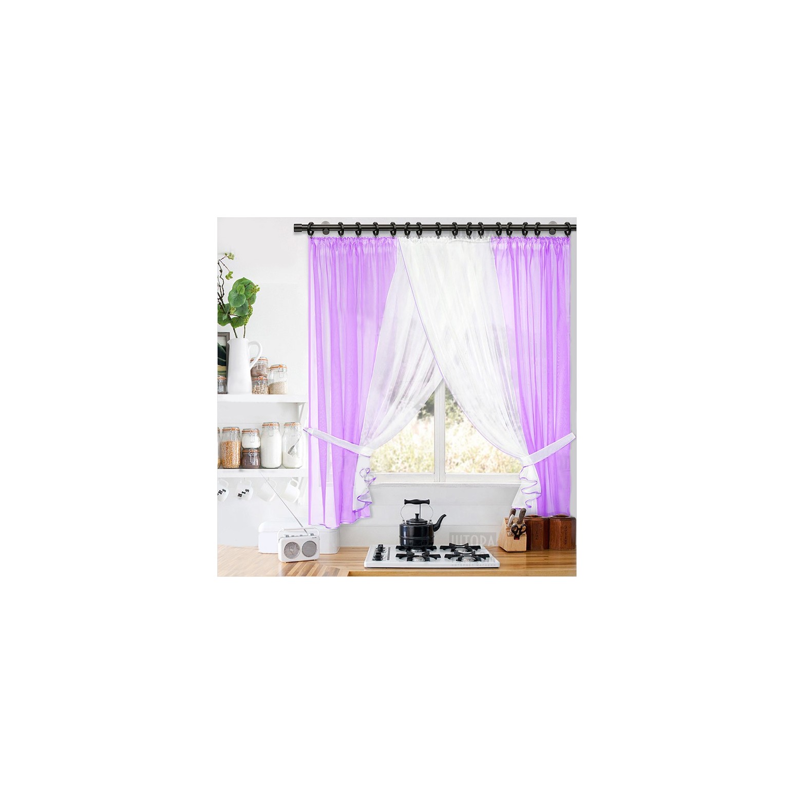 На первый взгляд может показаться, что представленная штора состоит из двух самостоятельных частей, но это не так. Комплект представляет собой пришитые внахлёст к одной шторной ленте два лёгких полотнища, скомбинированных из цветной и белой вуали. Благодаря внушительной ширине, модель пышно драпируется и замечательно украсит как маленькое, так и большое окно.