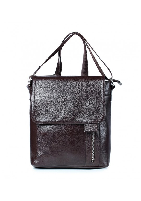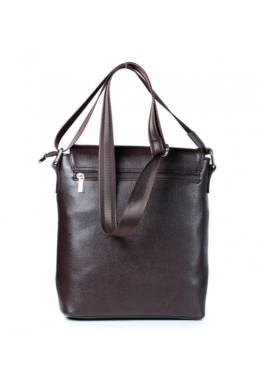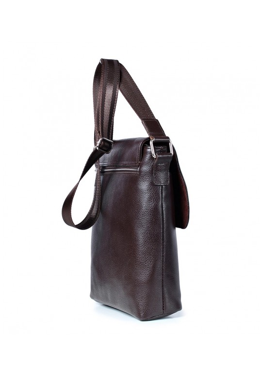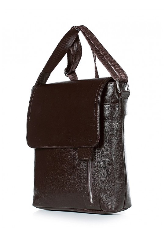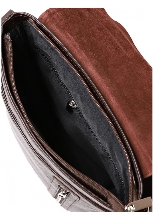 Сумка из натуральной кожи, закрывается на застежку-молнию и клапаном на замок-магнитку, с декоративной строчкой и цупфером на клапане. На задней стенке карман, закрывающийся на застежку-молнию. С регулирующимся по длине плечевым ремнем, с боковыми держателями на пряжке, с открытым объемным карманом и карманом, закрывающимся на застежку-молнию на передней стенке. Сумка на подкладке, с подвесным карманом, закрывающимся на застежку-молнию.