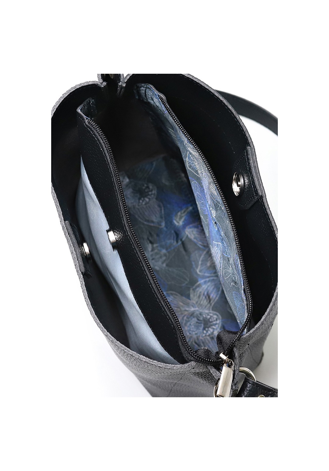 Сумка на три отделения. Основное отделение закрывается на застежку-молнию, с удлиненной ручкой. На задней стенке карман, закрывающийся на застежку-молнию. Цвет фурнитуры - никель. Сумка частично на подкладке.
