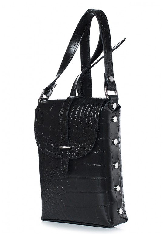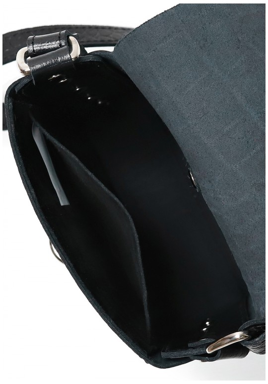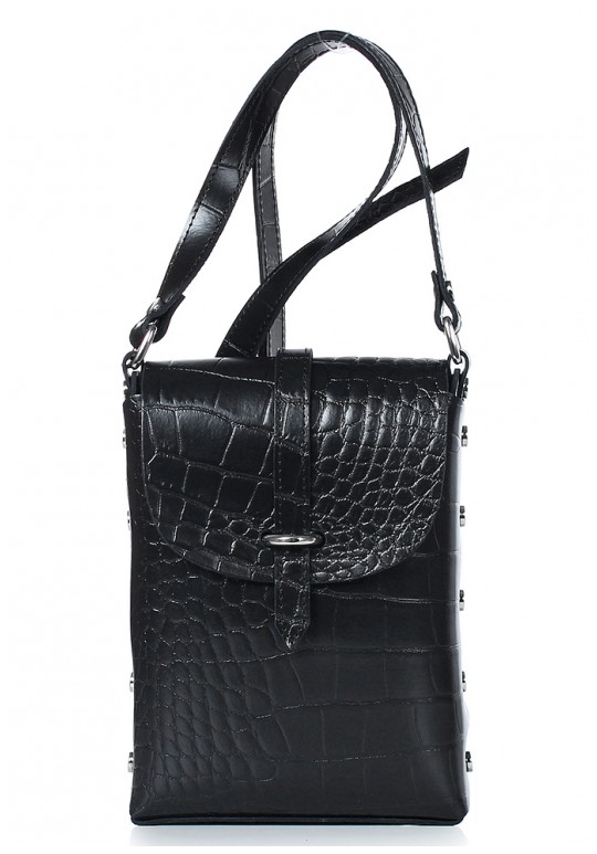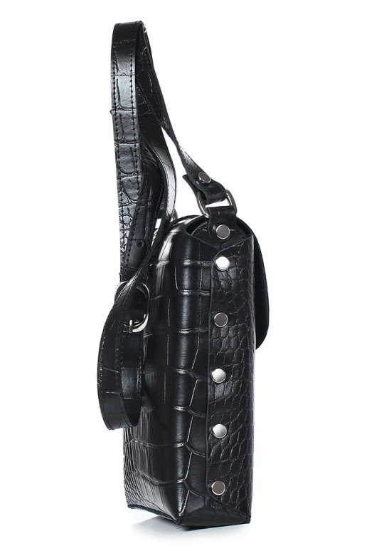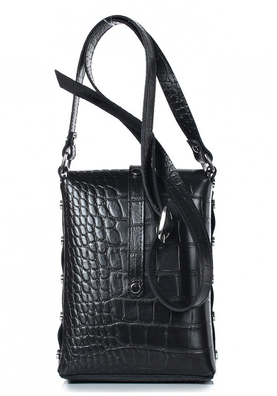 Сумка на одно отделение, закрывающееся клапаном посредствам малого клапана, протянутого через металлическую шлевку, с несъемной регулирующейся ручкой-ремнем, с боковыми держателями ручки-ремня, с декоративными заклепками.