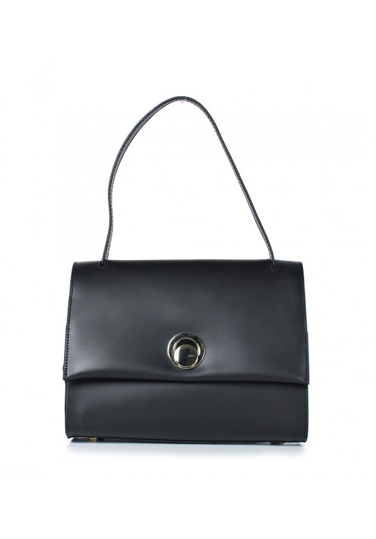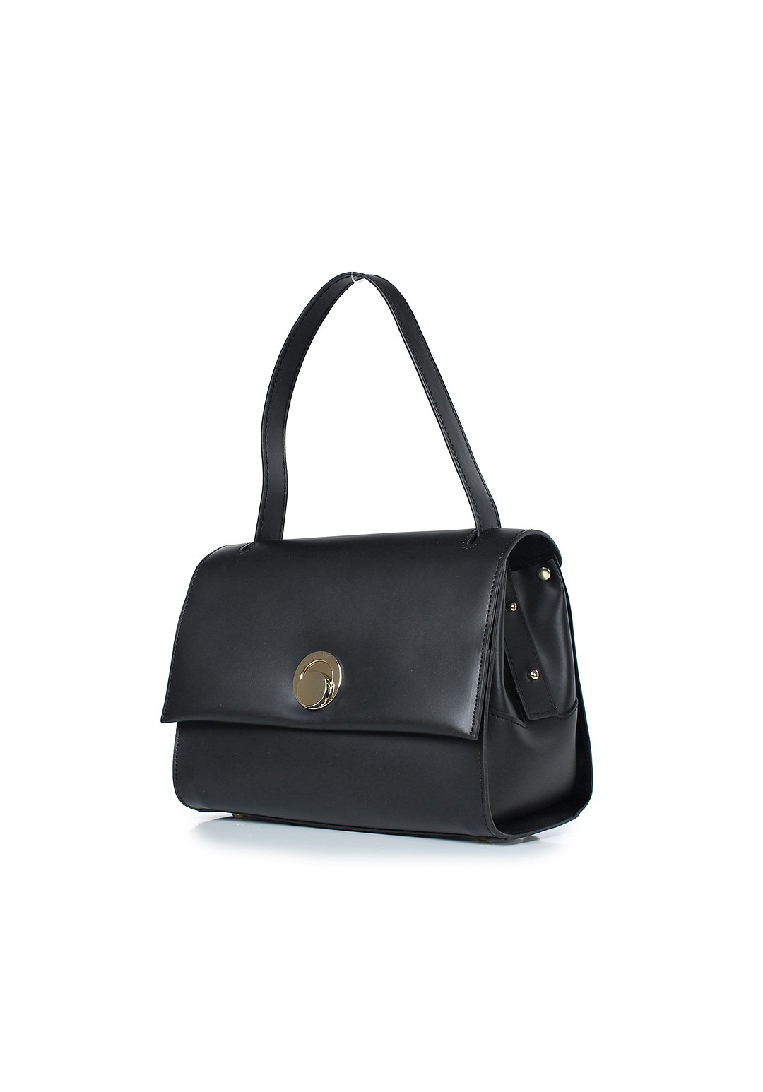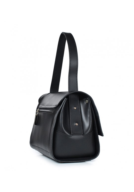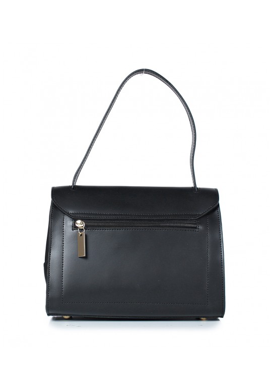 Сумка на одно отделение, закрывающееся клапаном на замок, с одной короткой ручкой. На задней стенке карман, закрывающийся на застежку-молнию. С пуклями на дне. Сумка частично на подкладке, с подвесным карманом.