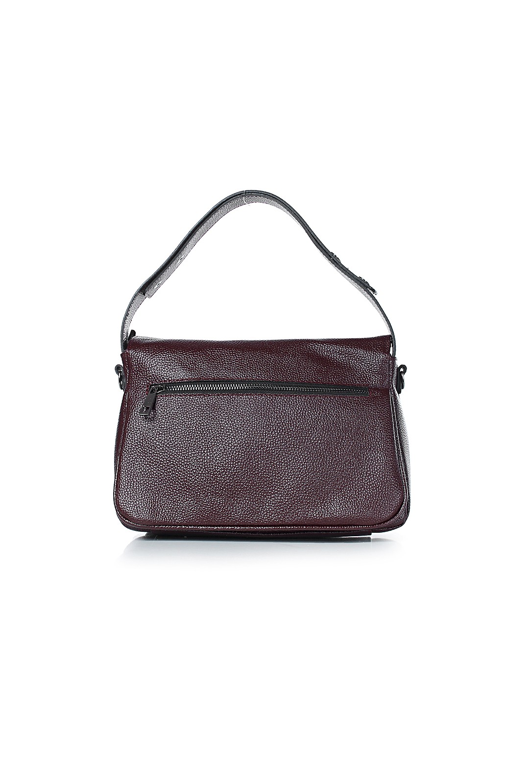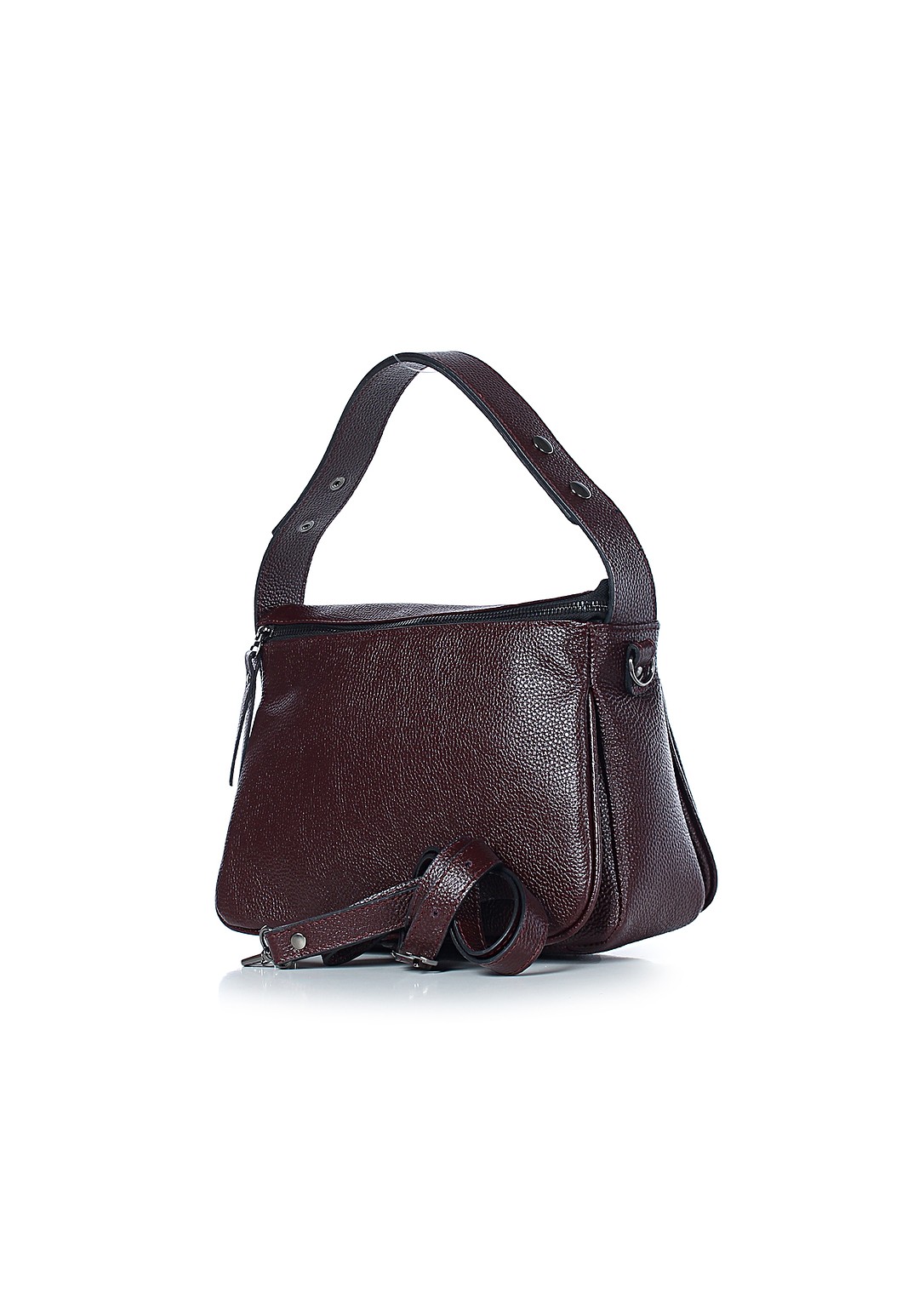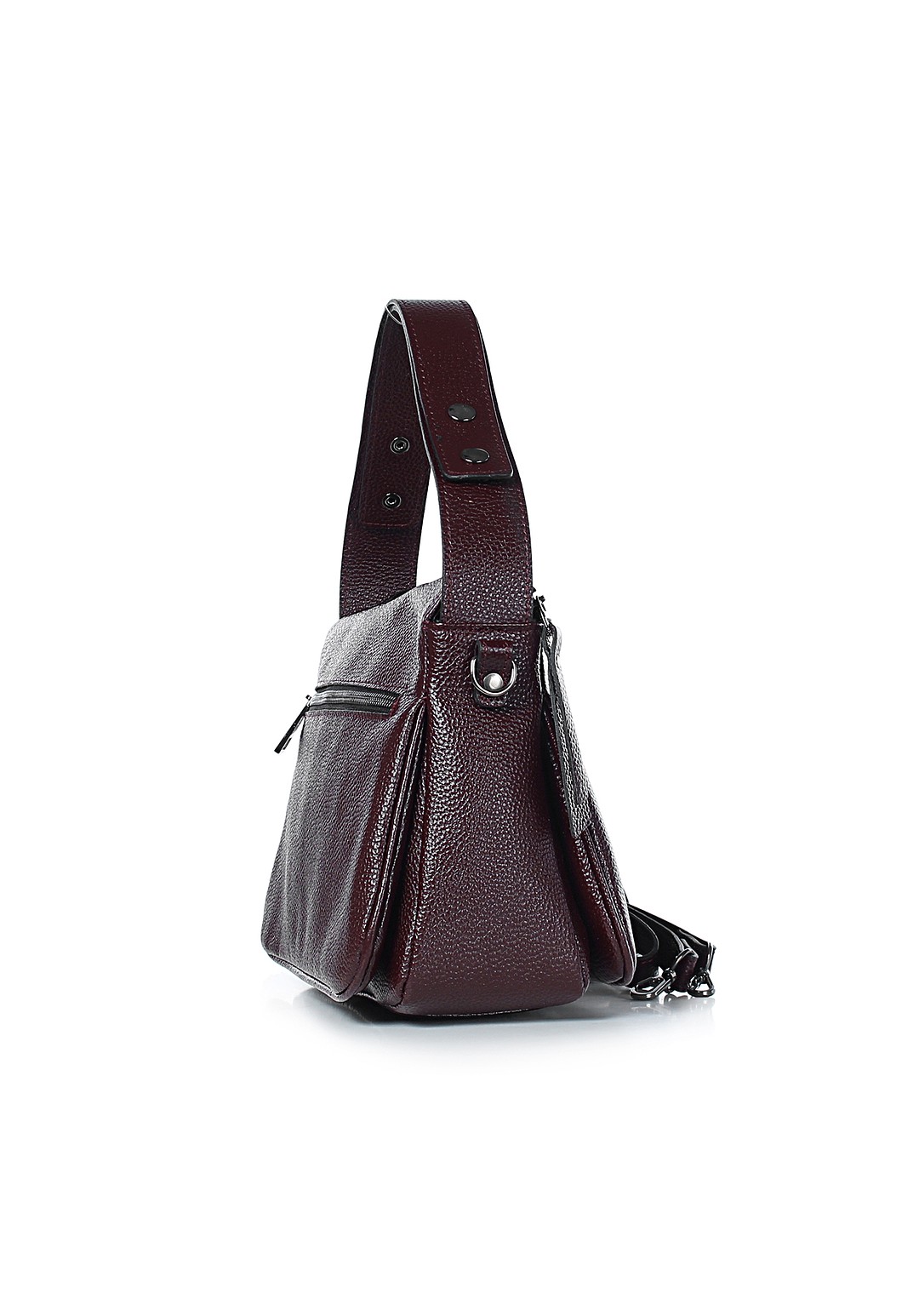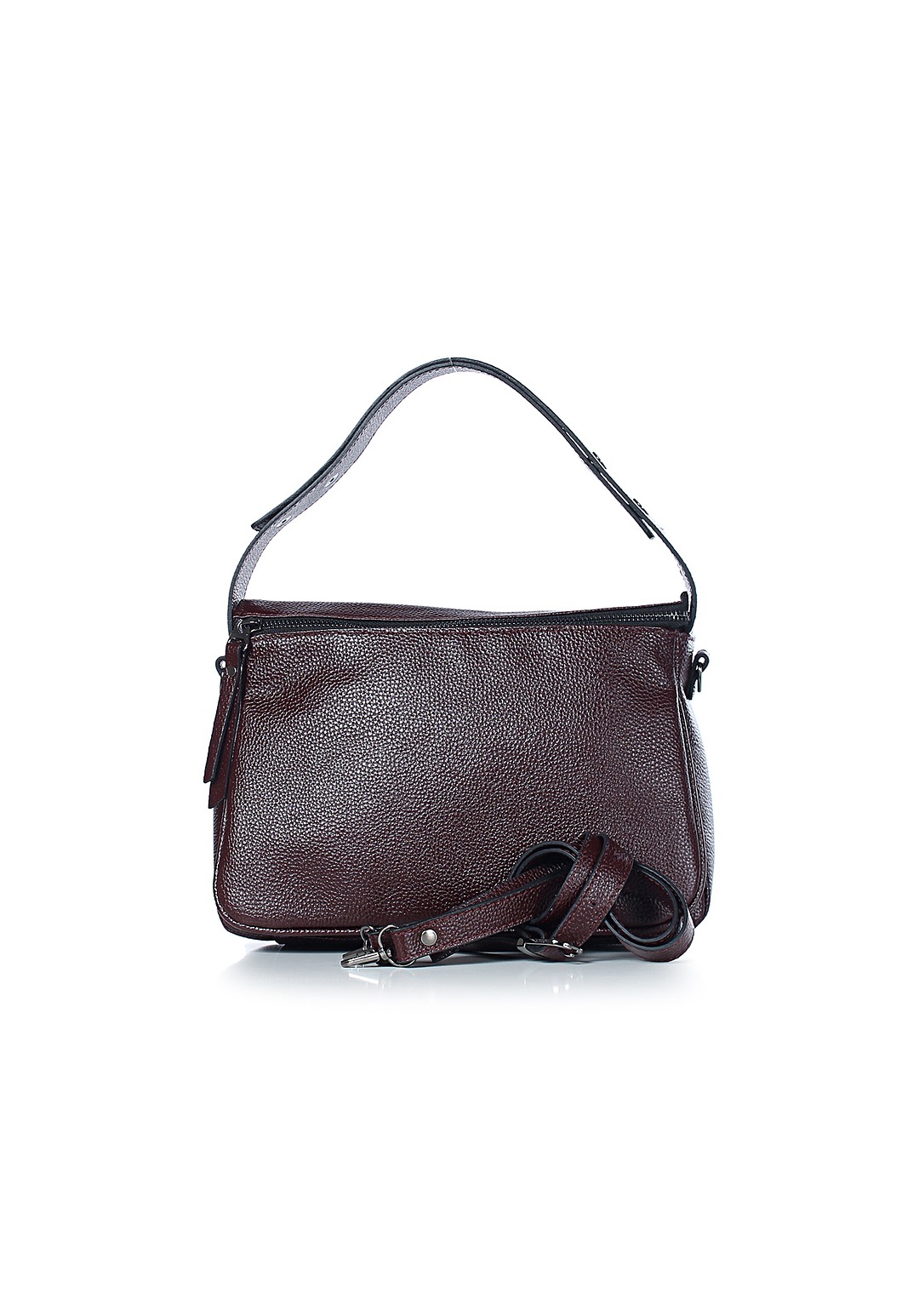 Сумка на одно отделение, закрывающееся на застежку-молнию, с ручкой, регулирующейся при помощи кнопок, со съемной регулирующейся ручкой-ремнем, с карманом на задней стенке.