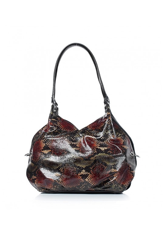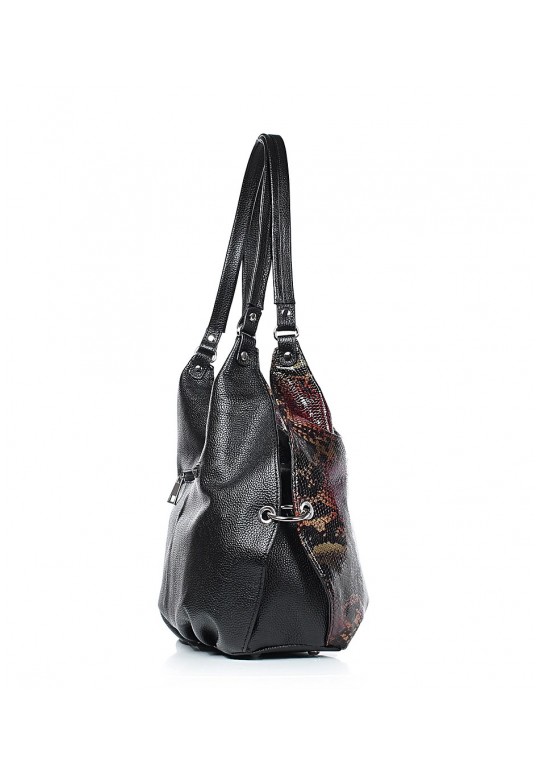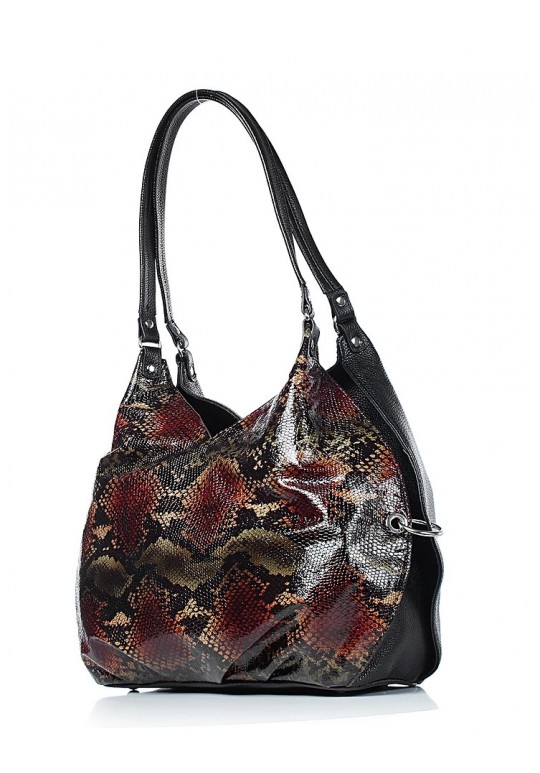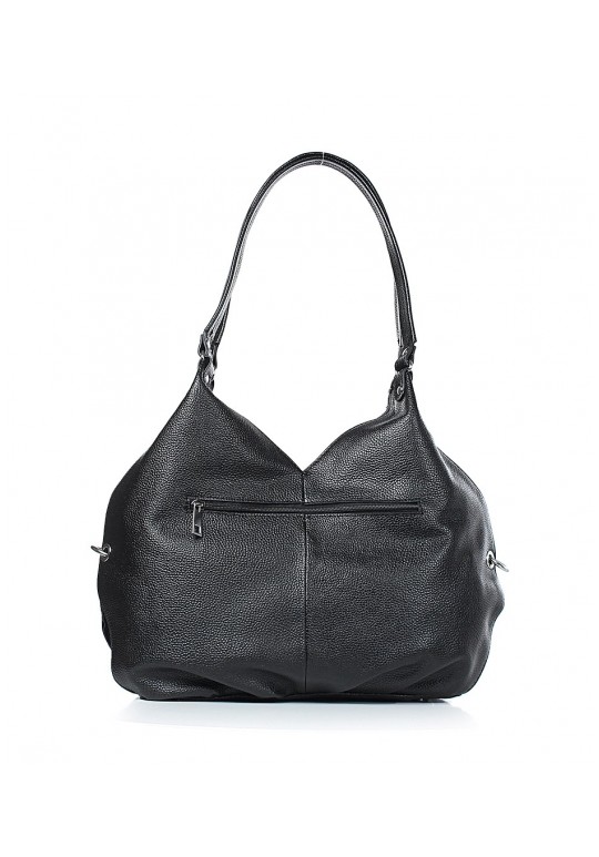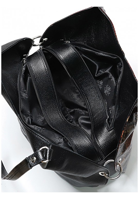 Вместительная женская сумка мягкой формы. Имеет три отделения, закрывающиеся на застежку-молнию, карман на задней стенке, закрывающийся на застежку-молнию, и два кармана внутри. Сумка с двумя несъемными нерегулирующимися ручками, благодаря которым носится на плече. Сумка на подкладке.
