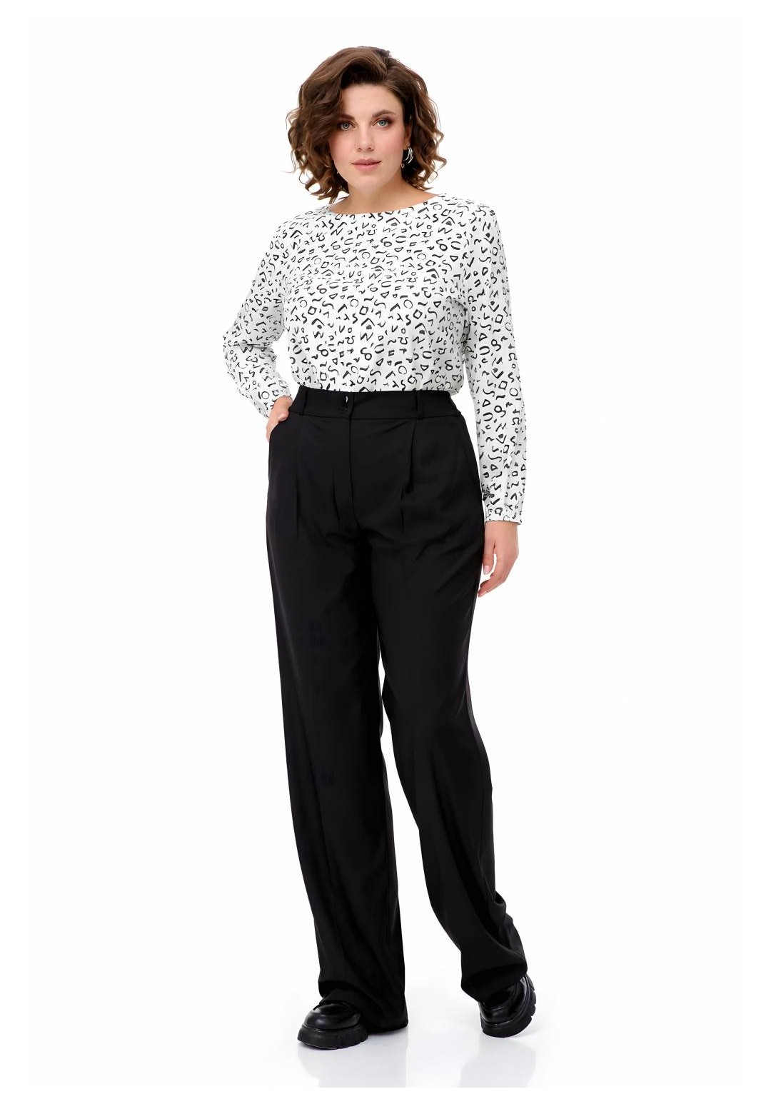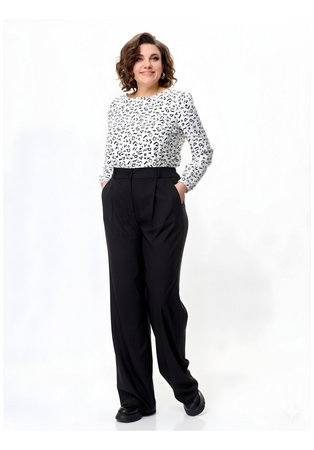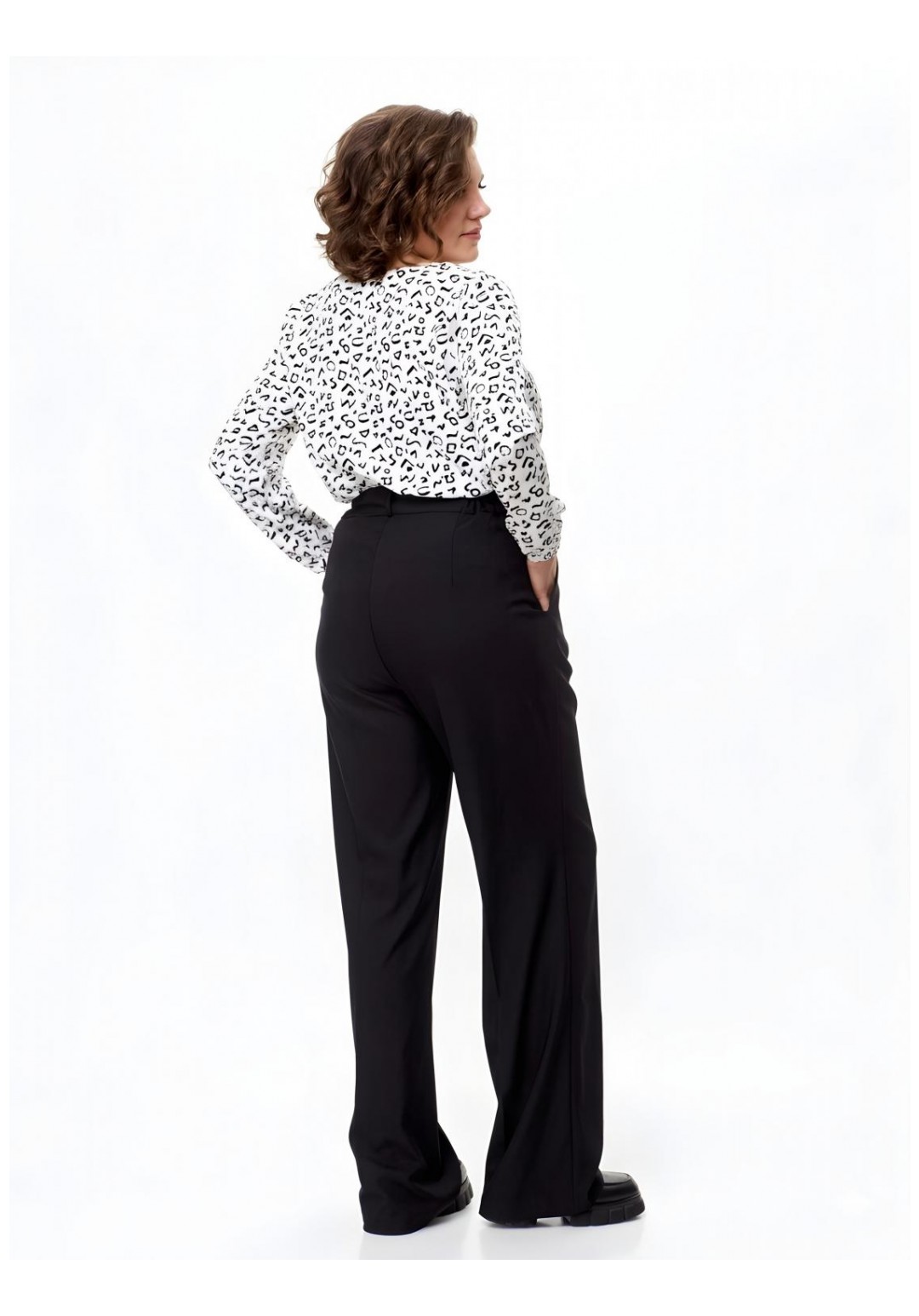Брюки палаццо Abbi (арт. 2005), черный Эстетика и комфорт Черные брюки палаццо от бренда Abbi — воплощение современной классики и безупречного стиля. Модель выполнена из облегченной смесовой ткани лилу, которая идеально сочетает в себе дышащие свойства хлопка, мягкость вискозы и эластичность для комфортной посадки. Свободный силуэт в сочетании с глубоким черным цветом делает эти брюки универсальной базой: они одинаково гармонично дополнят строгий офисный образ с жакетом или элегантный вечерний аутфит с шелковой блузой. Конструктивные особенности: • Силуэт: Широкие брюки палаццо с эффектными заутюженными кантами (стрелками), которые визуально вытягивают силуэт и удлиняют ноги. • Детали кроя: Изящная мягкая складка спереди плавно переходит в переднюю стрелку, придавая образу графичность и строгость. • Посадка: Пояс дополнен шлевками для ремня. Эластичная вставка (резинка) в задней части пояса гарантирует идеальное прилегание по талии и комфорт в движении в течение всего дня. • Функциональность: Прорезные боковые карманы; надежная застежка на классическую молнию и две пуговицы. Параметры модели на фото: • Рост: 172 см. • Размер изделия на модели: 54. Состав: 60% хлопок, 35% вискоза, 5% эластан. Ткань: Облегченная костюмная ткань лилу. ________________________________________ Таблица фактических замеров изделия Размер ОТ (обхват талии), см ОБ (обхват бедер), см ДИ (длина по внешн./внутр. шву), см 44 68–70 98–100 119 / 89 46 72–74 102–104 119 / 89 48 76–78 106–108 119 / 89 50 80–82 110–112 119 / 89 52 84–86 114–116 119 / 89 54 86–87 118–120 119 / 87 56 88–90 122–124 119 / 88 ________________________________________ Совет стилиста: Для создания актуального монохромного образа сочетайте брюки с укороченным топом или заправленной внутрь свободной рубашкой. Обувь на каблуке максимально усилит эффект бесконечных ног, а лоферы на толстой подошве добавят образу расслабленности. Видеоролик с примеркой: https://www.youtube.com/watch?v=jX1LOIr7SWU&sttick=0