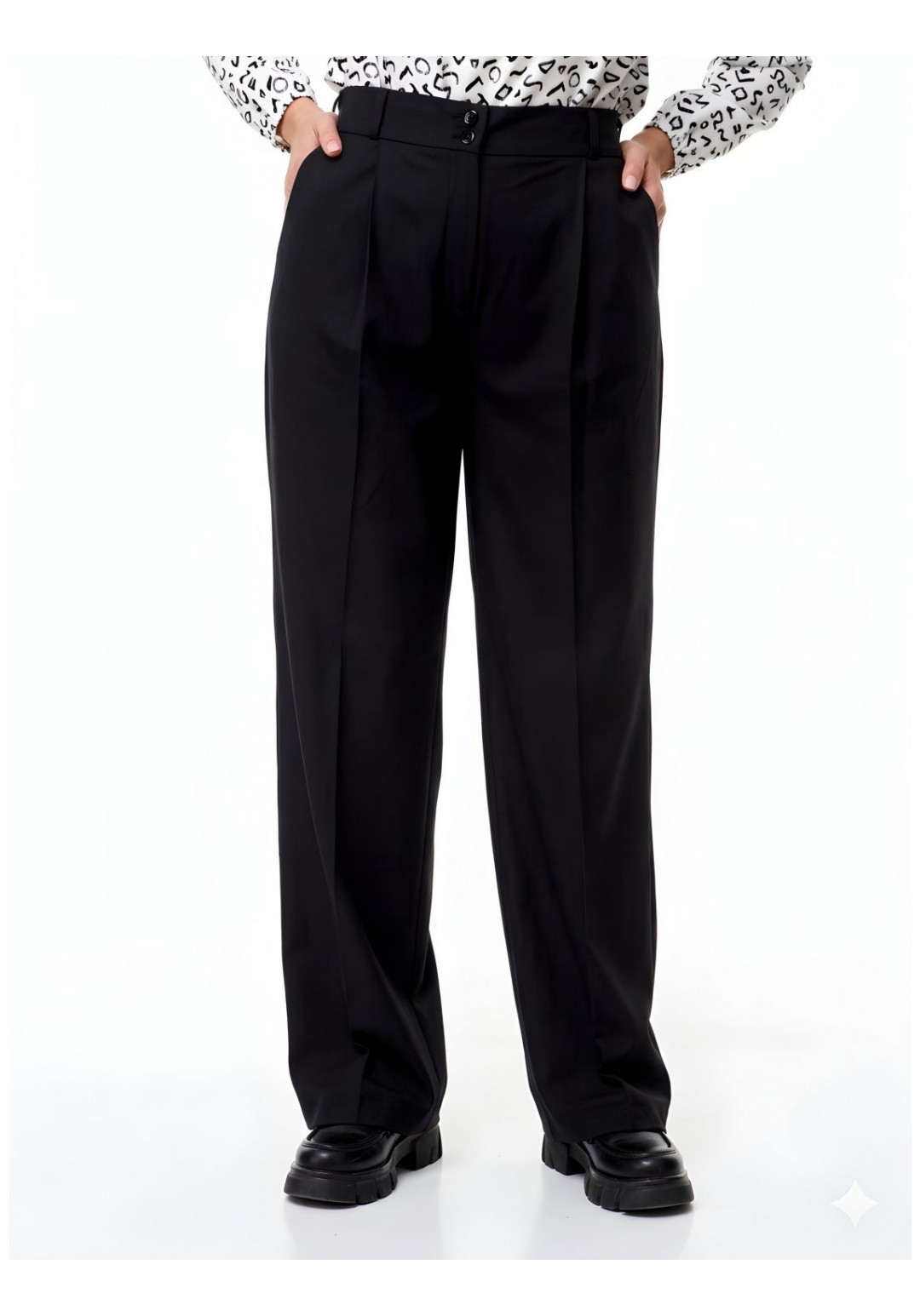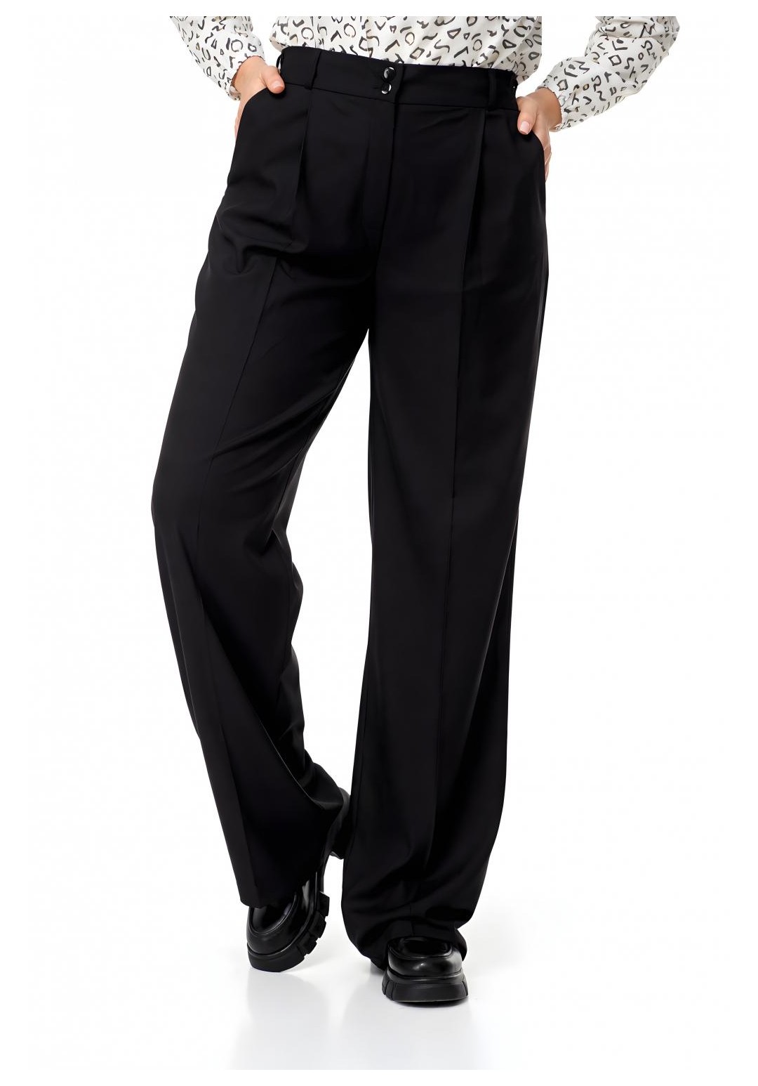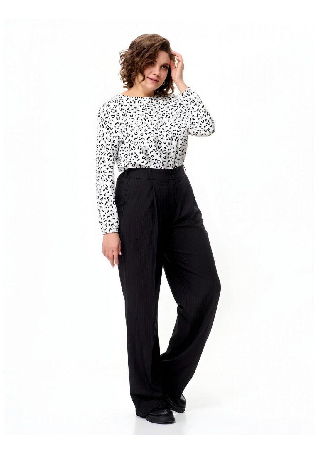 Брюки палаццо Abbi (арт. 2005), черный Эстетика и комфорт Черные брюки палаццо от бренда Abbi — воплощение современной классики и безупречного стиля. Модель выполнена из облегченной смесовой ткани лилу, которая идеально сочетает в себе дышащие свойства хлопка, мягкость вискозы и эластичность для комфортной посадки. Свободный силуэт в сочетании с глубоким черным цветом делает эти брюки универсальной базой: они одинаково гармонично дополнят строгий офисный образ с жакетом или элегантный вечерний аутфит с шелковой блузой. Конструктивные особенности: • Силуэт: Широкие брюки палаццо с эффектными заутюженными кантами (стрелками), которые визуально вытягивают силуэт и удлиняют ноги. • Детали кроя: Изящная мягкая складка спереди плавно переходит в переднюю стрелку, придавая образу графичность и строгость. • Посадка: Пояс дополнен шлевками для ремня. Эластичная вставка (резинка) в задней части пояса гарантирует идеальное прилегание по талии и комфорт в движении в течение всего дня. • Функциональность: Прорезные боковые карманы; надежная застежка на классическую молнию и две пуговицы. Параметры модели на фото: • Рост: 172 см. • Размер изделия на модели: 54. Состав: 60% хлопок, 35% вискоза, 5% эластан. Ткань: Облегченная костюмная ткань лилу. ________________________________________ Таблица фактических замеров изделия Размер ОТ (обхват талии), см ОБ (обхват бедер), см ДИ (длина по внешн./внутр. шву), см 44 68–70 98–100 119 / 89 46 72–74 102–104 119 / 89 48 76–78 106–108 119 / 89 50 80–82 110–112 119 / 89 52 84–86 114–116 119 / 89 54 86–87 118–120 119 / 87 56 88–90 122–124 119 / 88 ________________________________________ Совет стилиста: Для создания актуального монохромного образа сочетайте брюки с укороченным топом или заправленной внутрь свободной рубашкой. Обувь на каблуке максимально усилит эффект бесконечных ног, а лоферы на толстой подошве добавят образу расслабленности. Видеоролик с примеркой: https://www.youtube.com/watch?v=jX1LOIr7SWU&sttick=0