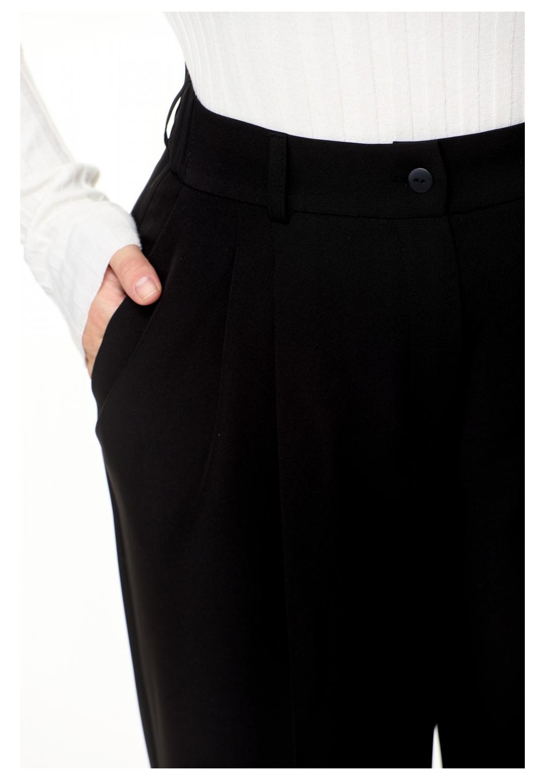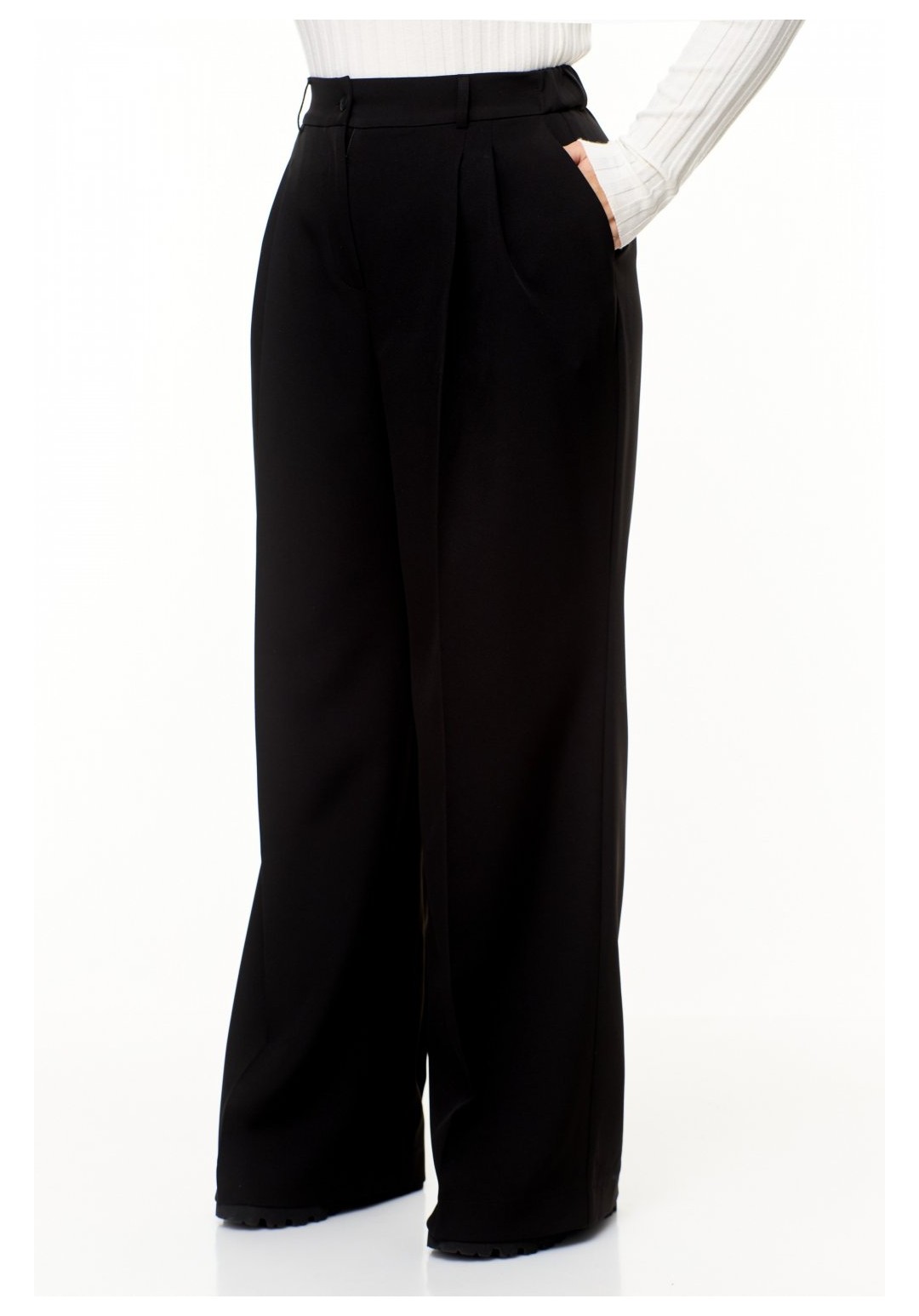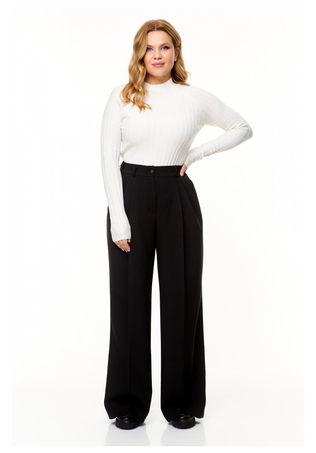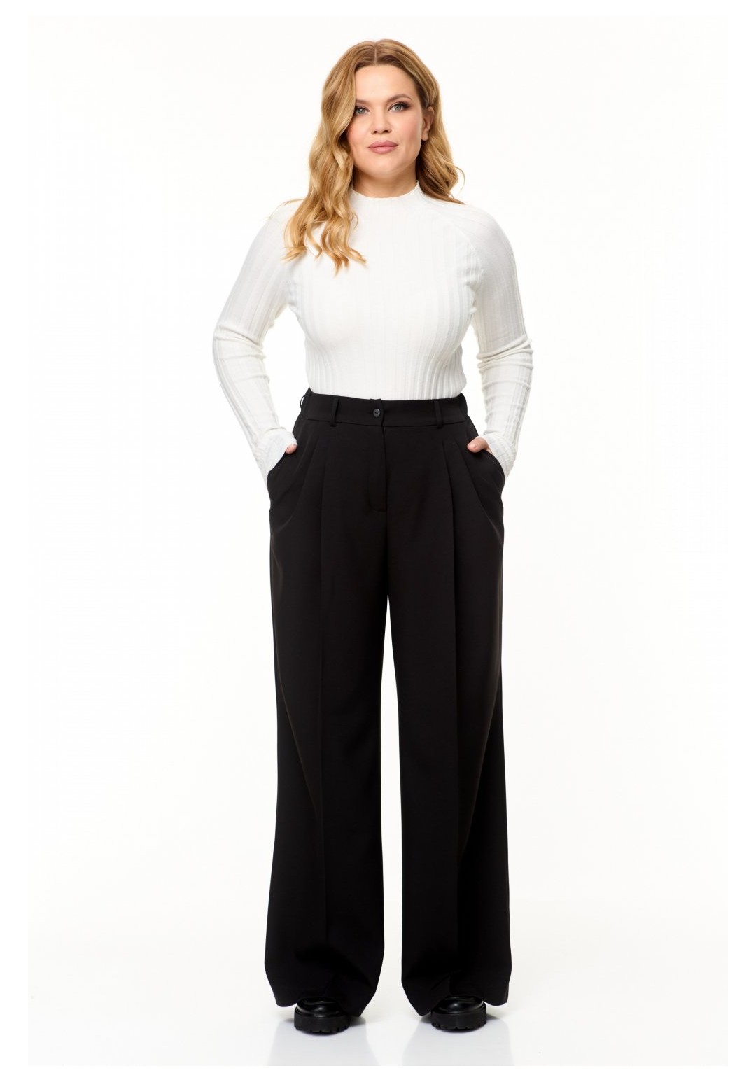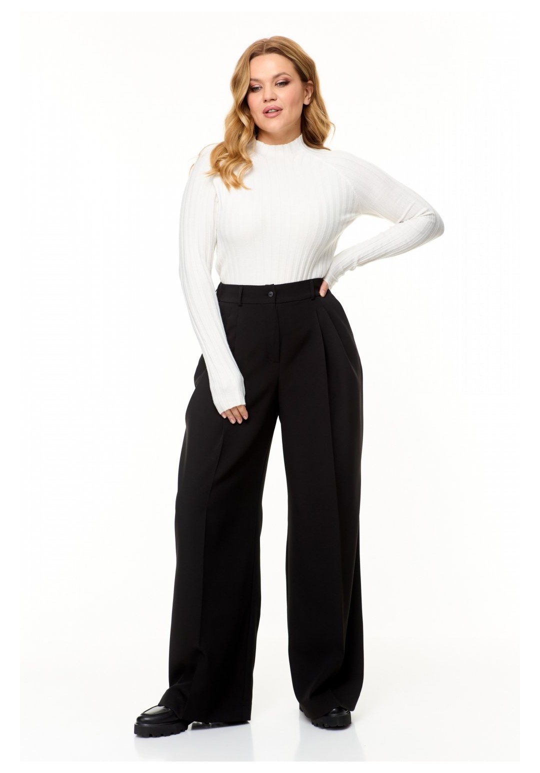 Женские брюки палаццо – отличный выбор для создания стильного и универсального образа. Эти черные брюки из смесовой ткани лилу, состоящей из хлопка и вискозы, подойдут как для повседневного ношения, так и для особых случаев. Дизайн изделия предусматривает две складки спереди, одна из которых переходит в переднюю стрелку, а также функциональные карманы и заутюженные на кант переднюю и заднюю части брюк. Пояс со шлевками позволяет носить брюки как с поясом, так и с ремнем, а эластичная резинка сзади обеспечивает комфортную посадку на талии. Застежка на молнию и пуговицу обеспечивает удобство в использовании. Брюки палаццо станут отличным дополнением гардероба любой женщины, которая ценит стиль и комфорт. Создавайте неповторимые образы и чувствуйте себя уверенно каждый день! На изображениях фотомодель с ростом 170 см. Размер фотомодели – 52. Фактические замеры готовых изделий, где: Рост фотомодели на изображениях – 170 см. Размер фотомодели – 52. ОТ – обхват по талии; ОБ – обхват по бедрам; ДИ – длина изделия; Размер 48 ОТ – 78; ОБ – 104; ДИ – 110 Размер 50 ОТ – 82; ОБ – 108; ДИ – 110 Размер 52 ОТ – 86; ОБ – 112; ДИ – 111 Размер 54 ОТ – 90; ОБ – 116; ДИ – 111 Размер 56 ОТ – 94; ОБ – 120; ДИ – 112 Размер 58 ОТ – 98; ОБ – 124; ДИ – 112 Размер 60 ОТ – 102; ОБ – 128; ДИ – 112 Размер 62 ОТ – 106; ОБ – 132; ДИ – 112