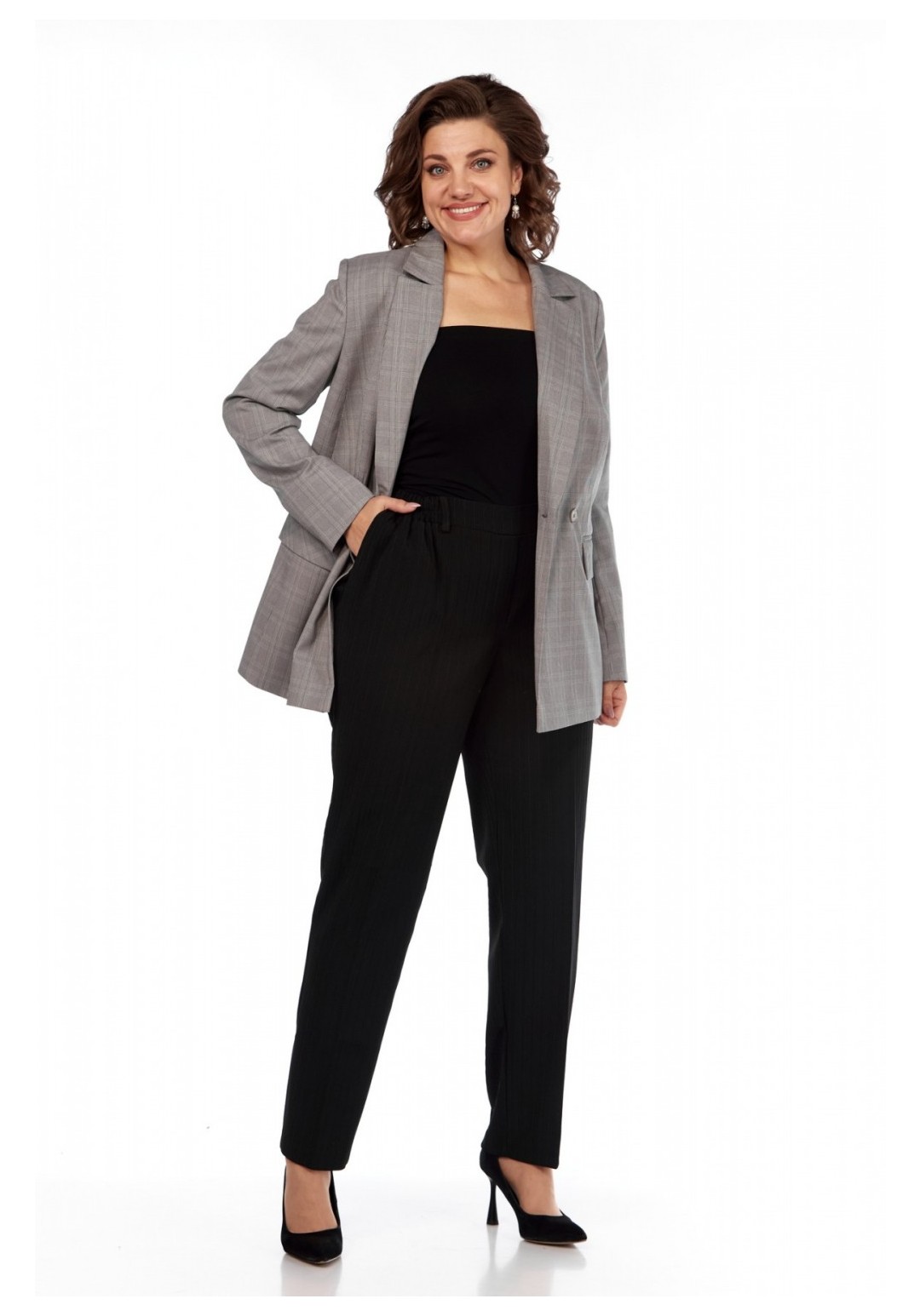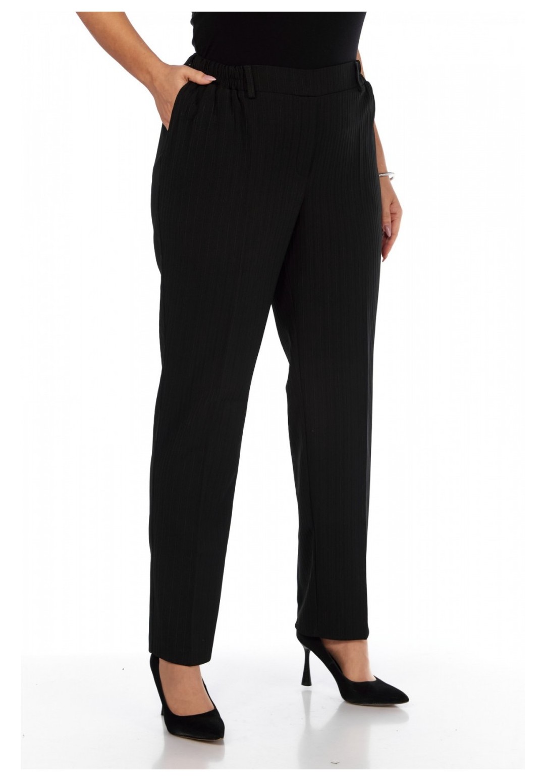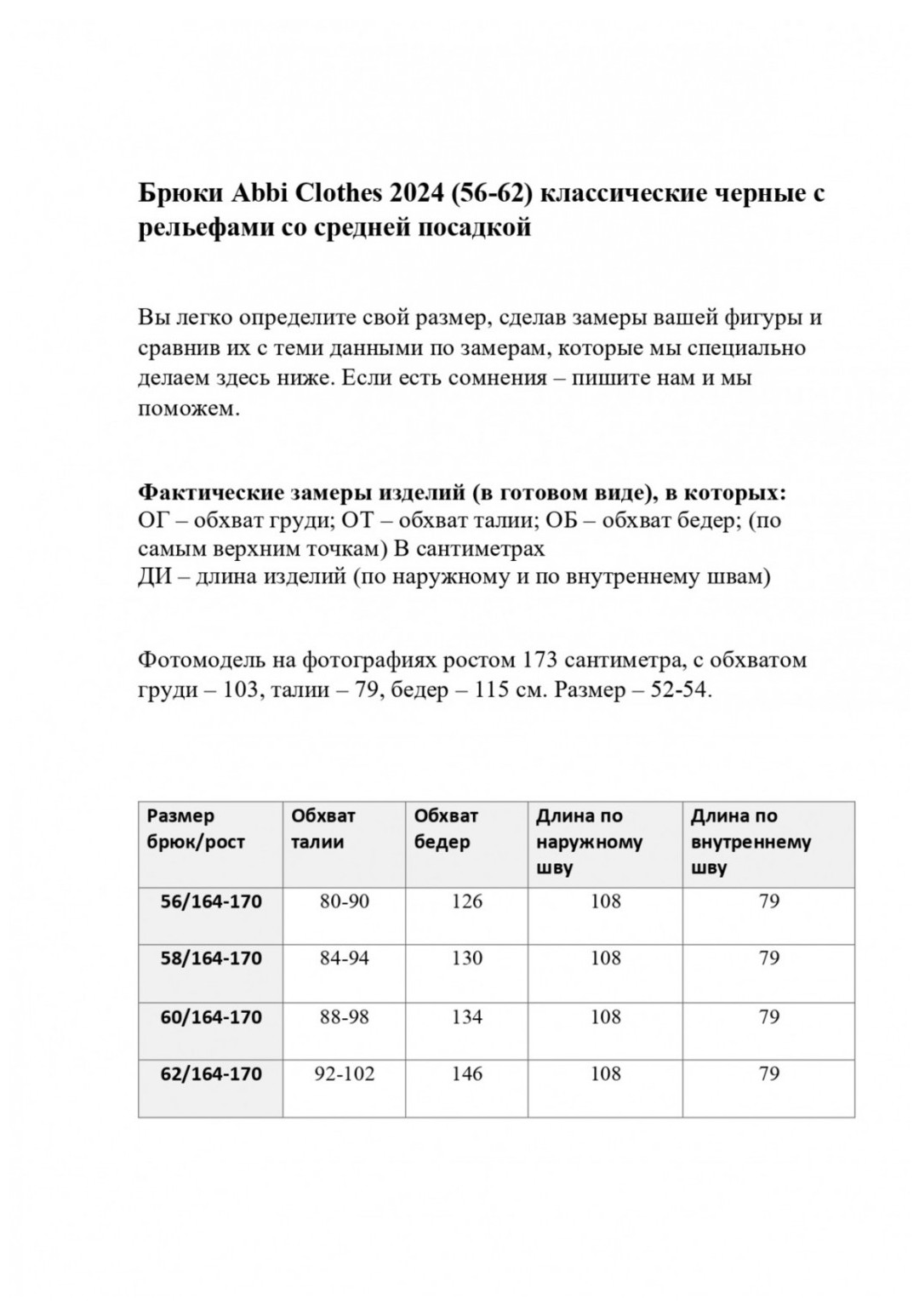Элегантные женские брюки со средней посадкой и с функциональными боковыми карманами, черного цвета. Притачной пояс на резинке без застежки позволяет одеть эти брюки на фигуру с любыми особенностями, важно только, чтобы по обхватам фигуры в поясе и по бедрам всё подходило. Длина брюк тоже универсальна тем, что они подойдут как с высоким и средним ростом, так и с ростом примерно в 164 сантиметра, при условии, что низ придется подшить в ателье. Они выполнены из смесовой плотной ткани с продольными рельефами по ткани, похожими на полоски, придающими оригинальность и элегантность. Незаменимы в межсезонье, можно одевать зимой. В то же время можно комфортно себя чувствовать в офисе. Ткань достаточно плотная и совсем немного эластичная. Текстильная, костюмно-плательная, практически не мнется, не требует особого ухода, кроме как стирки при температуре до 60 градусов. Особенности модели: - средняя посадка. - функциональные карманы. - зауженный к низу крой. - пояс притачной с эластичной тесьмой (резинкой) от середины передних половинок и по спинке. - без застежки. - шлёвки для ремней или пояса. - ткань не мнется. За брюками легко ухаживать: деликатная стирка до 60 градусов, без отбеливателей, с легким отжимом, с легкой глажкой и сушкой в естественных условиях. При съемке в образе мы использовали жакет нашего бренда серых тонов с принтов в клетку. На снимках и на видео наша фотомодель ростом 173 см., параметрами фигуры для размера 52-54. Брюки на фотомодели – 54 размера. Вы точно определите свой размер, сделав замеры вашей фигуры по обхватам груди, талии и бедер, сравнив их с теми данными по замерам, которые мы делаем для наших изделий в описании и в фототаблице. Если есть сомнения по выбору размера, пишите нам параметры фигуры, мы подберем именно ваш размер. Ссылка на видеоролики на нашем канале: https://www.youtube.com/watch?v=9F9avtVY7T0 https://www.youtube.com/@AbbiClothes Фактические замеры изделий (в готовом виде), в которых: ОТ – обхват талии (резинка собрана/растянута); ОБ – обхват бедер; ДИ – длина изделий (по наружному и по внутреннему швам); Фотомодель на фотографиях ростом 173 сантиметра, с обхватом груди – 103, талии – 79, бедер – 115 см. Размер – 52-54. Размер 56 ОТ – 80-90; ОБ – 126; ДИ – 108/79 Размер 58 ОТ – 84-94; ОБ – 130; ДИ – 108/79 Размер 60 ОТ – 88-98; ОБ – 134; ДИ – 108/79 Размер 62 ОТ – 92-102; ОБ – 138; ДИ – 108/79