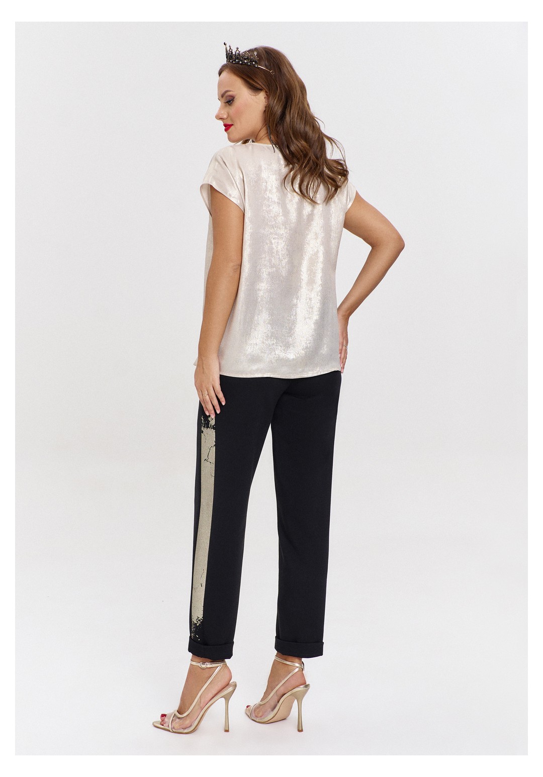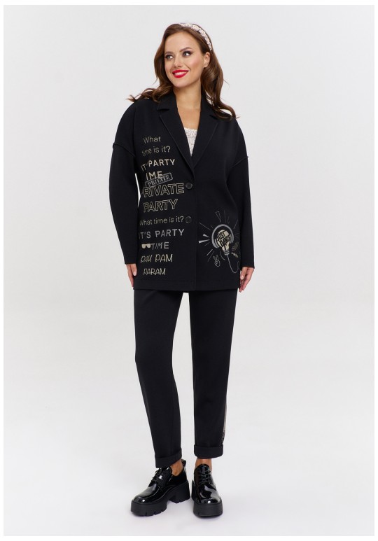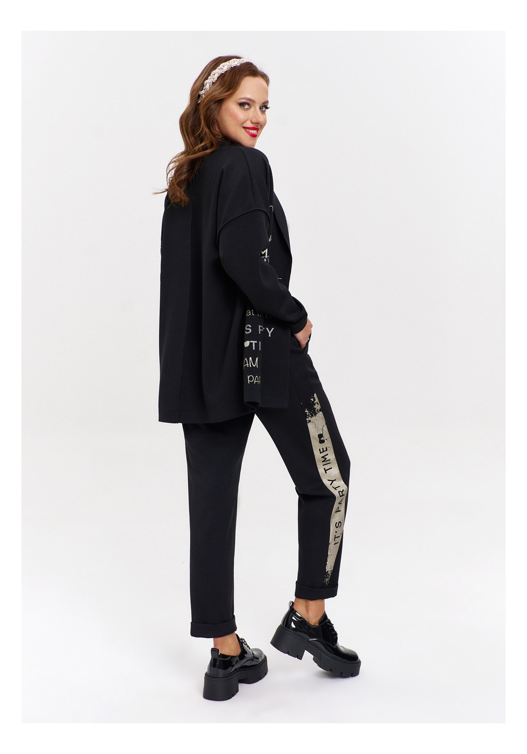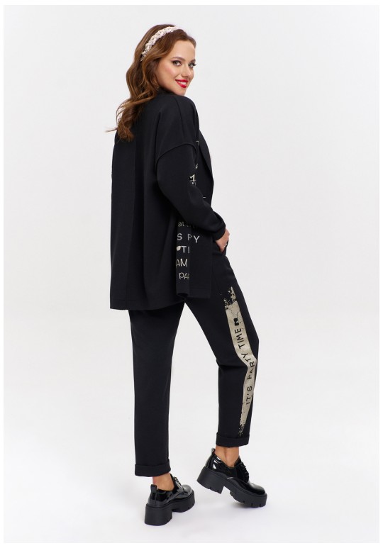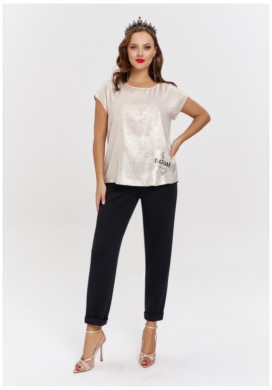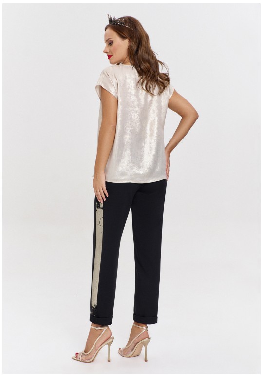 Джоггеры из трикотажа "дюпон", силуэтной формы "бананы", с карманами спереди и фигурной кокеткой сзади. Пояс с резинкой. В боковых швах лампасы с перламутровым принтом.