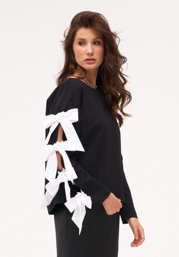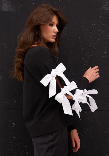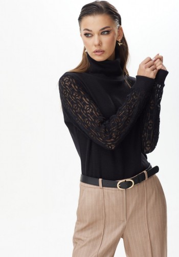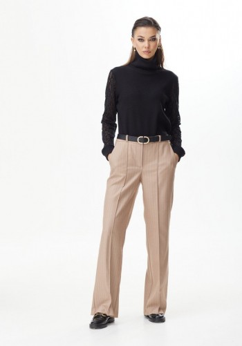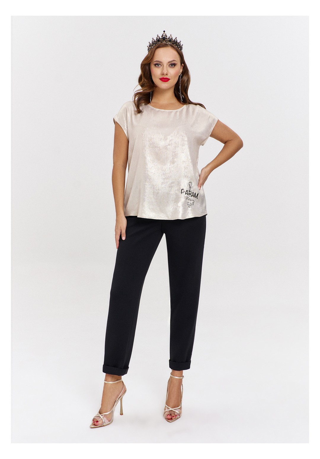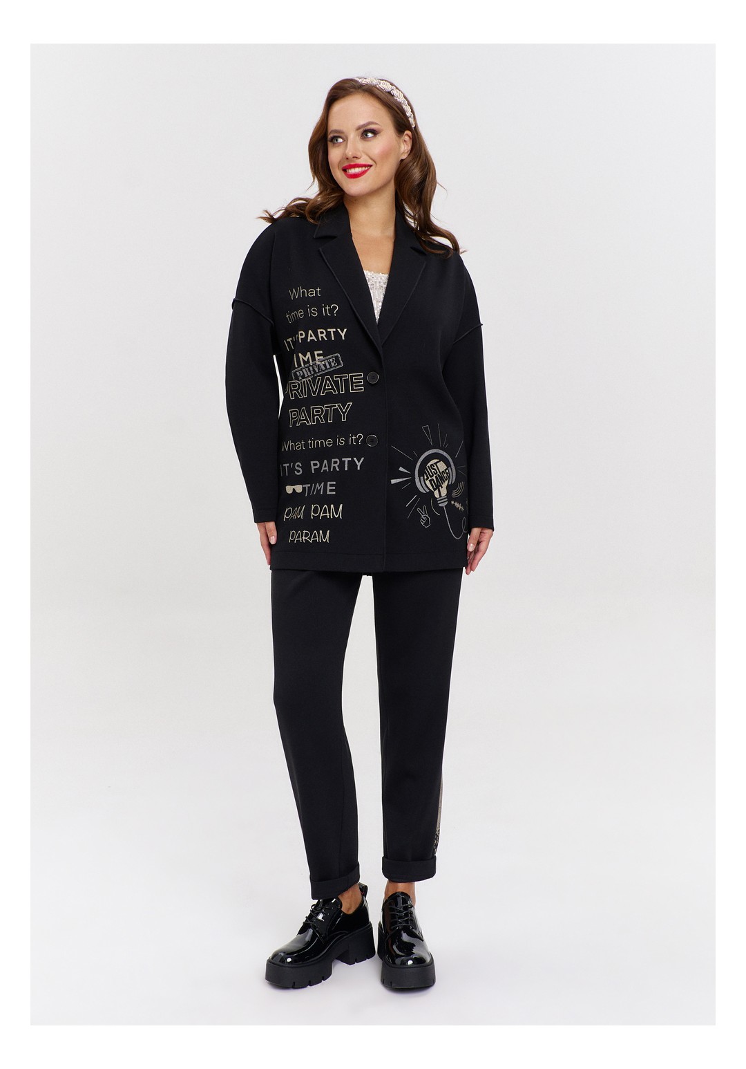 Джоггеры из трикотажа "дюпон", силуэтной формы "бананы", с карманами спереди и фигурной кокеткой сзади. Пояс с резинкой. В боковых швах лампасы с перламутровым принтом.