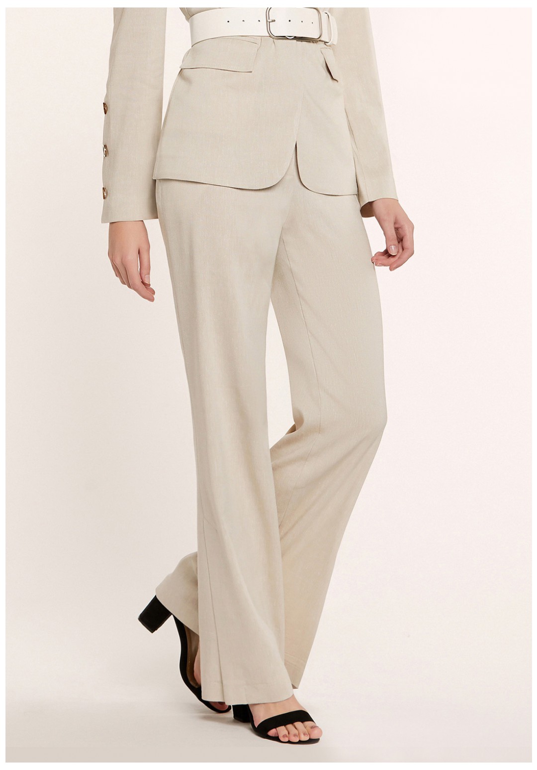 Брюки прямые на обтачке, с застежкой на молнию и кнопку. Задние части с горизонтальными карманами-обманками с листочками. В боковых швах обработаны карманы и шлицы.