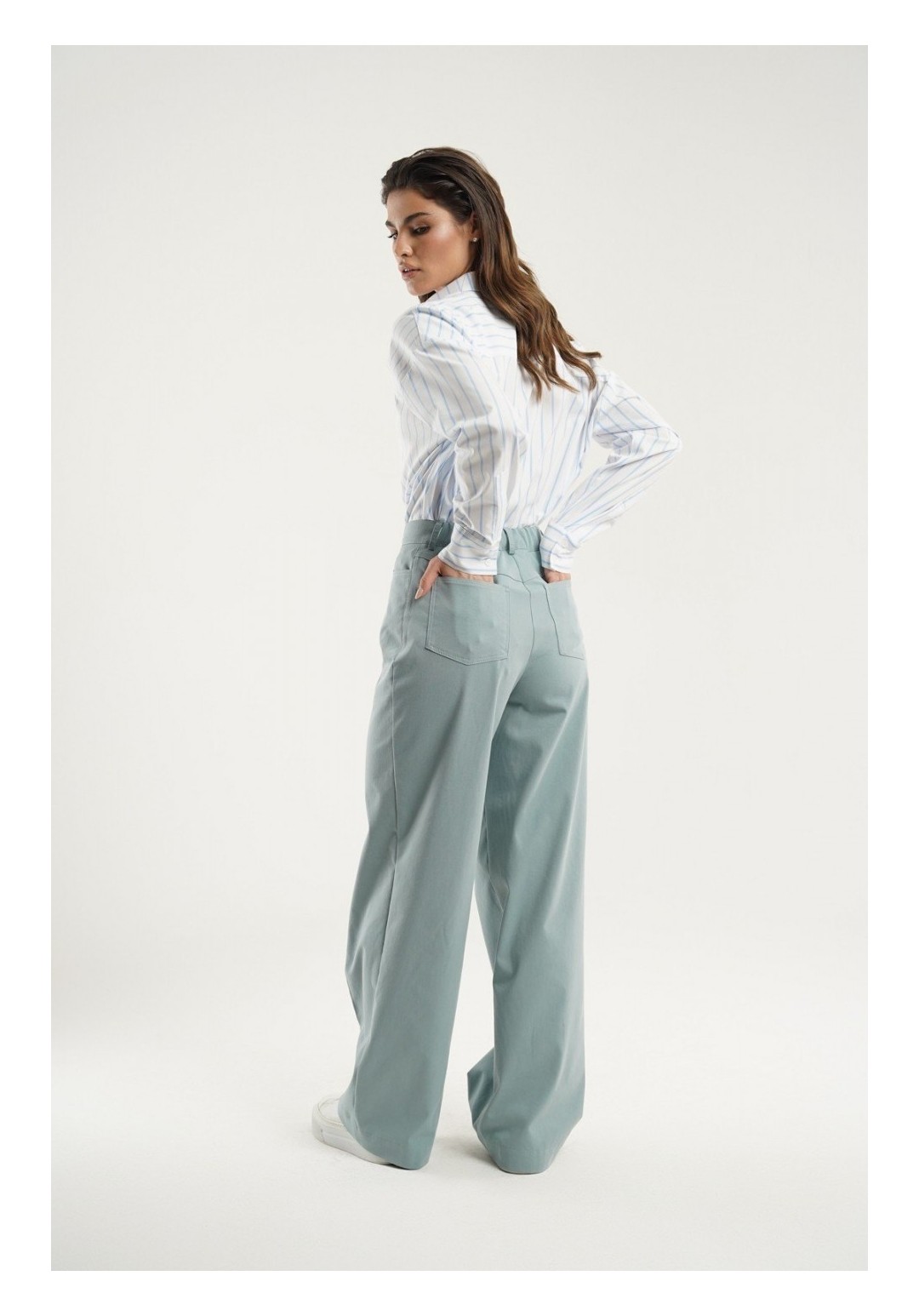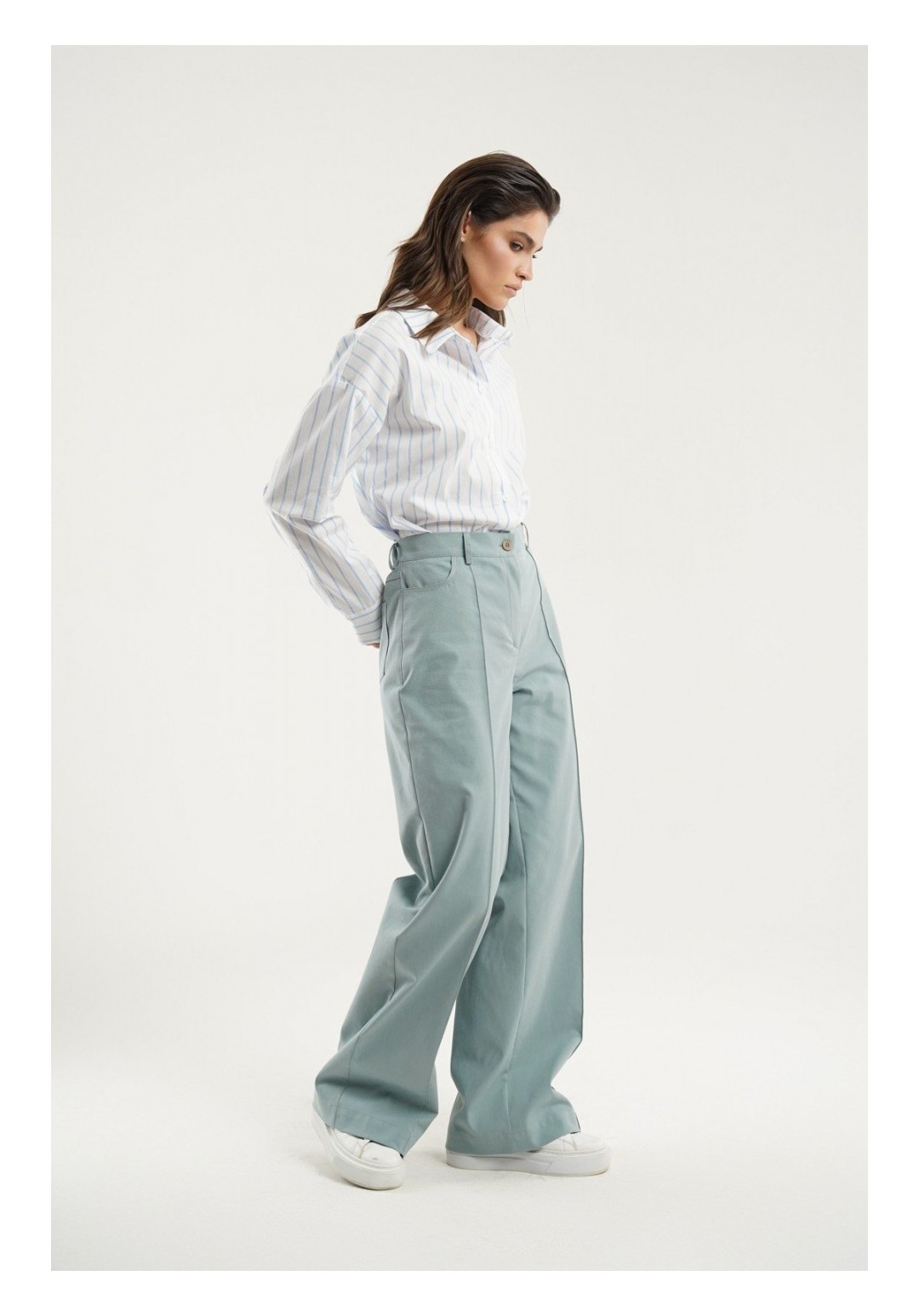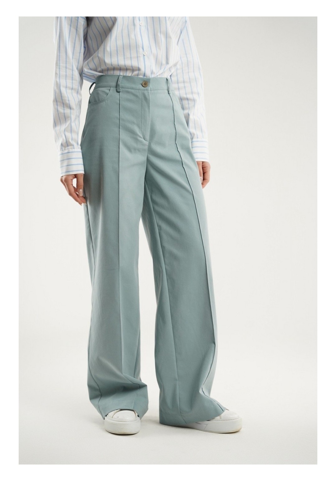 Эти стильные женские джинсовые брюки свободного кроя представлены в приятном пастельно-голубом цвете, который идеально подойдет для создания как повседневного, так и более элегантного образа. Модель выполнена с прямым кроем от бедра, что придает изделию классический и утонченный вид. Особенностью дизайна являются застроченные стрелки по переду, которые визуально удлиняют силуэт. В боковых швах расположены фигурные карманы, добавляющие удобства и практичности. На задней части брюк предусмотрены кокетки и накладные карманы, что делает модель более функциональной. Пояс отрезной, дополнен эластичной тесьмой для лучшей посадки. Застежка на молнию в сочетании с петлей и пуговицей обеспечивает легкость использования. Эти брюки станут идеальным выбором для тех, кто ценит комфорт и стиль в одном флаконе.