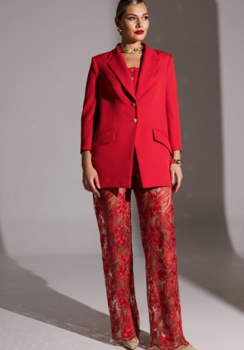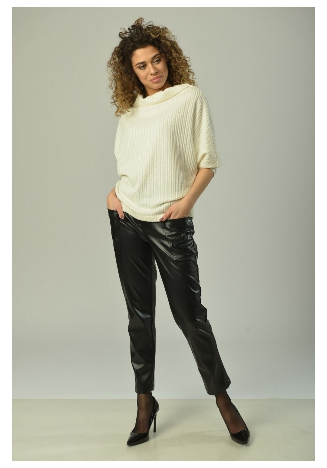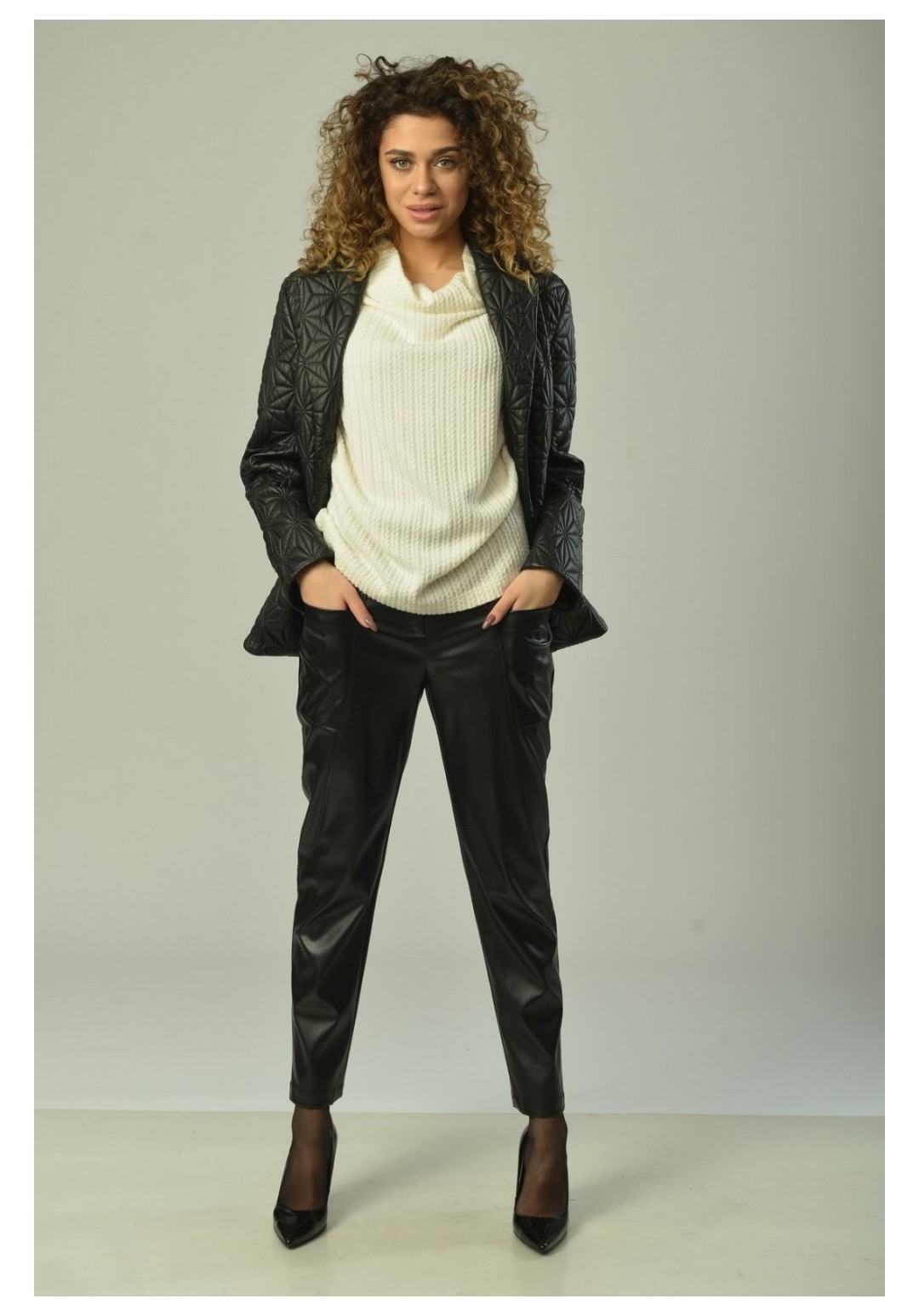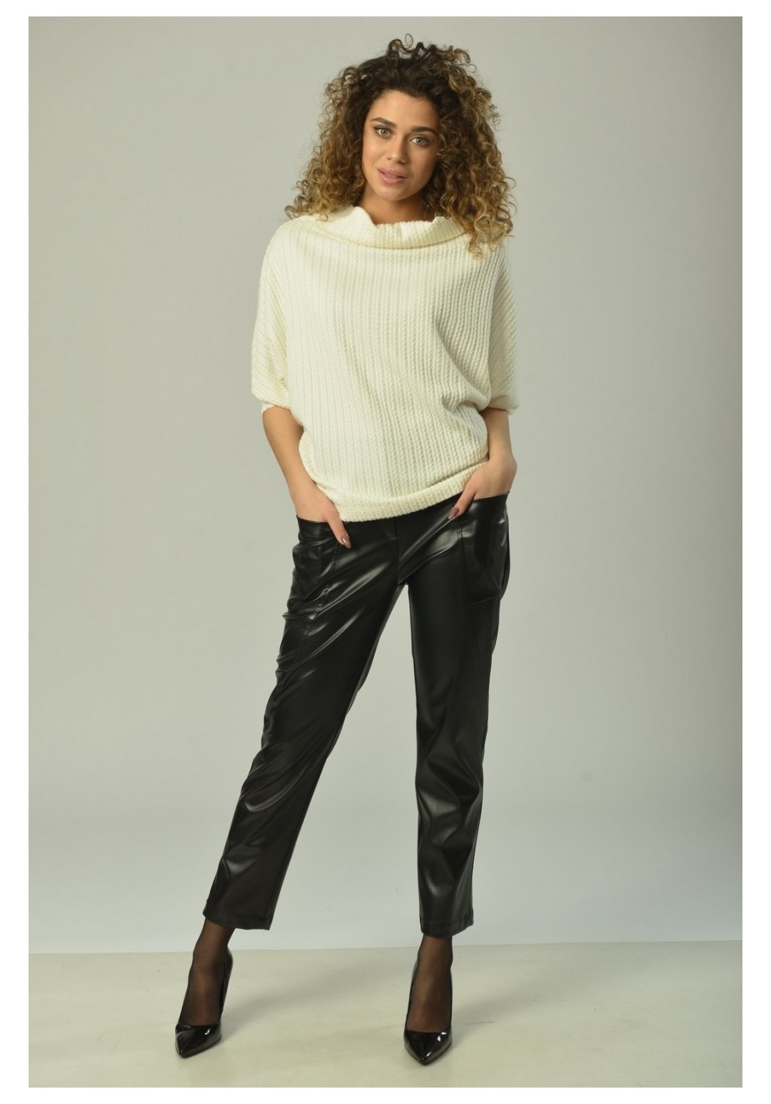 Брюки женские, прямого силуэта, с центральной застёжкой на тесьму-молнию и кнопки на поясе. На задней половинке рельефные швы от верха к боковому шву. На передней половинке рельефные швы от верха к боковому шву, в которых обработаны карманы. Верхний срез обработан поясом с резинкой на спинке. В качестве отделки фурнитура и детали. Длина изделия 97 см.
