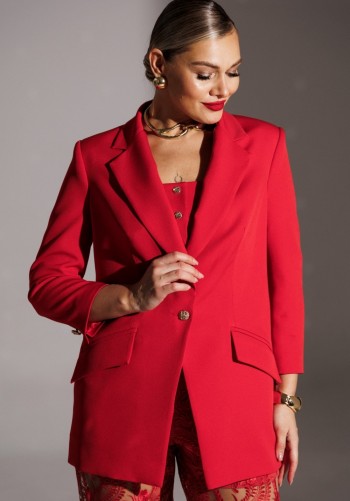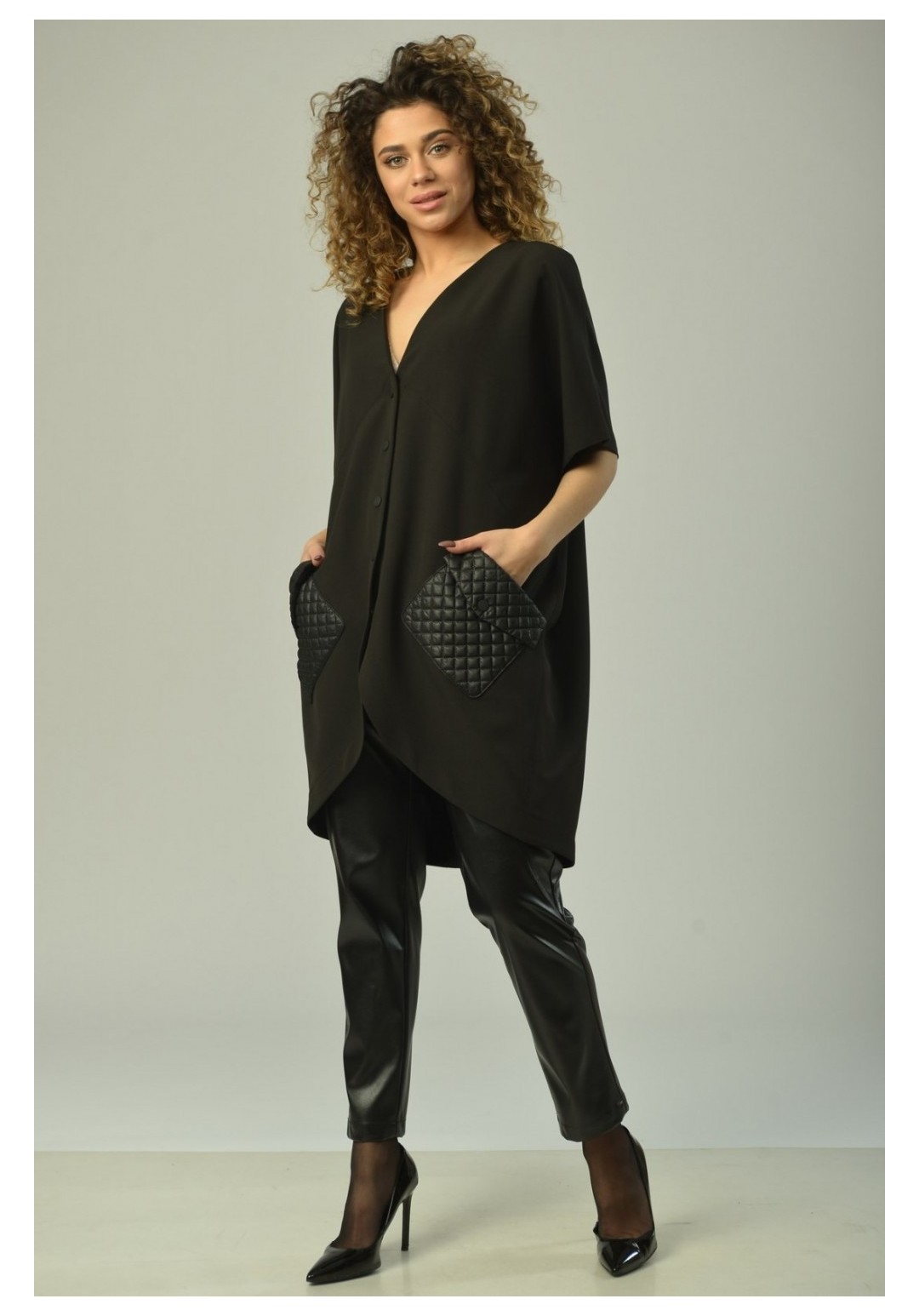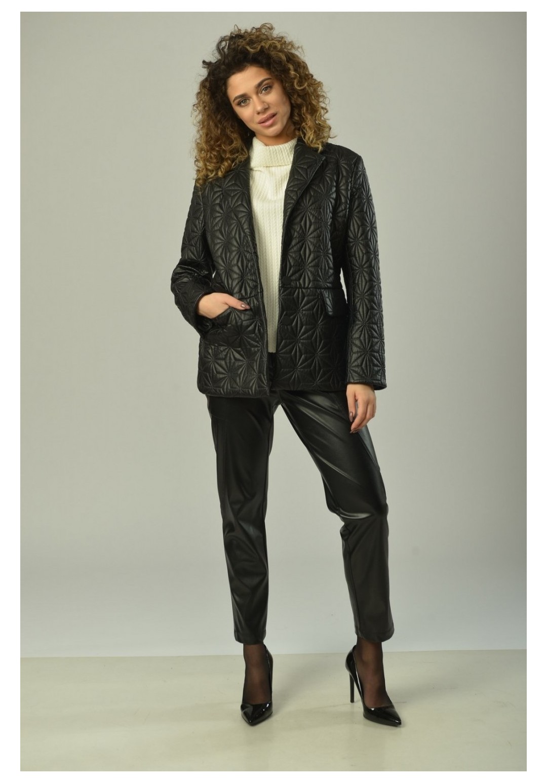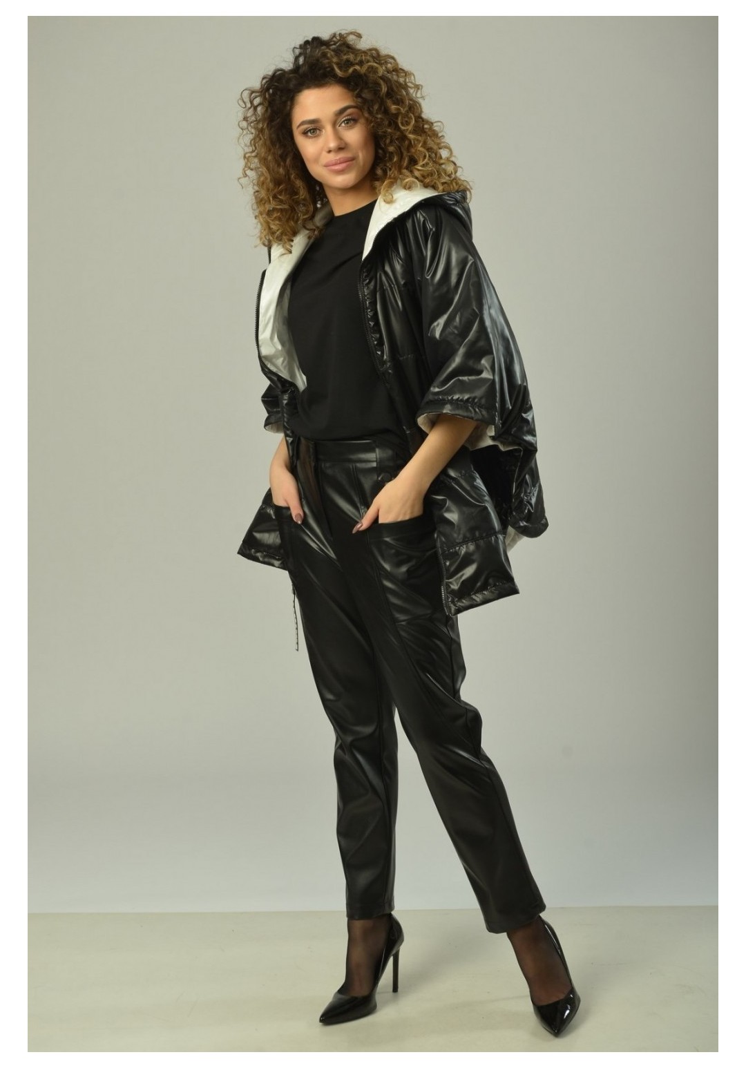 Брюки женские, прямого силуэта, с центральной застёжкой на тесьму-молнию и кнопки на поясе. На задней половинке рельефные швы от верха к боковому шву. На передней половинке рельефные швы от верха к боковому шву, в которых обработаны карманы. Верхний срез обработан поясом с резинкой на спинке. В качестве отделки фурнитура и детали. Длина изделия 97 см.