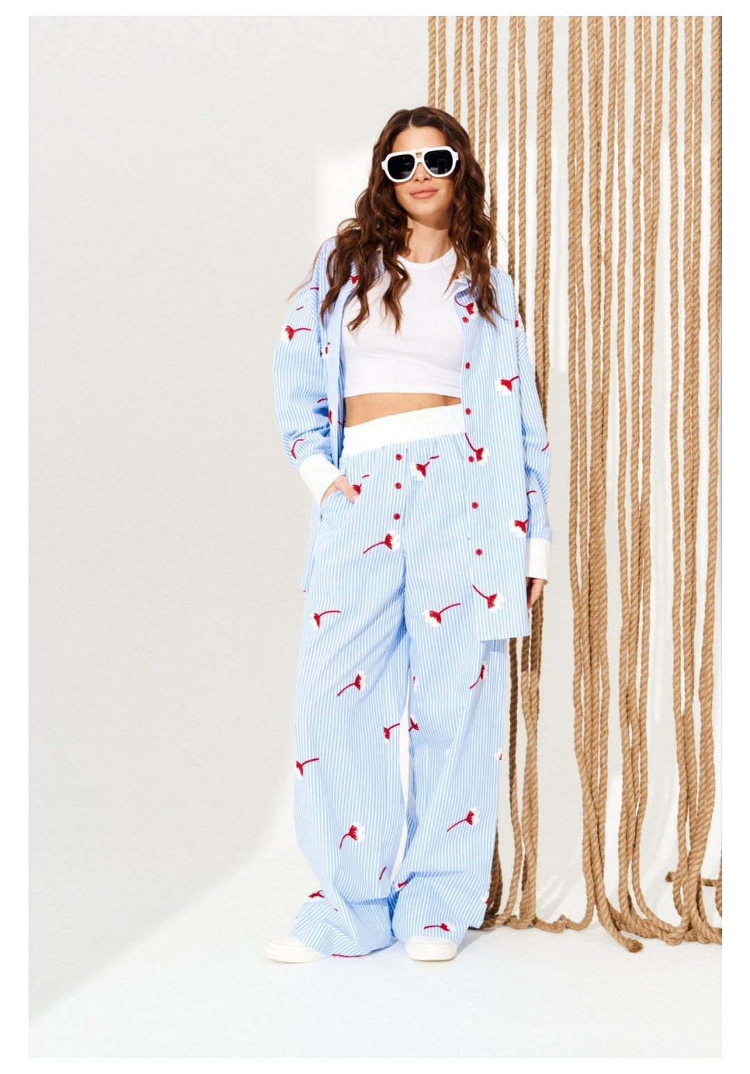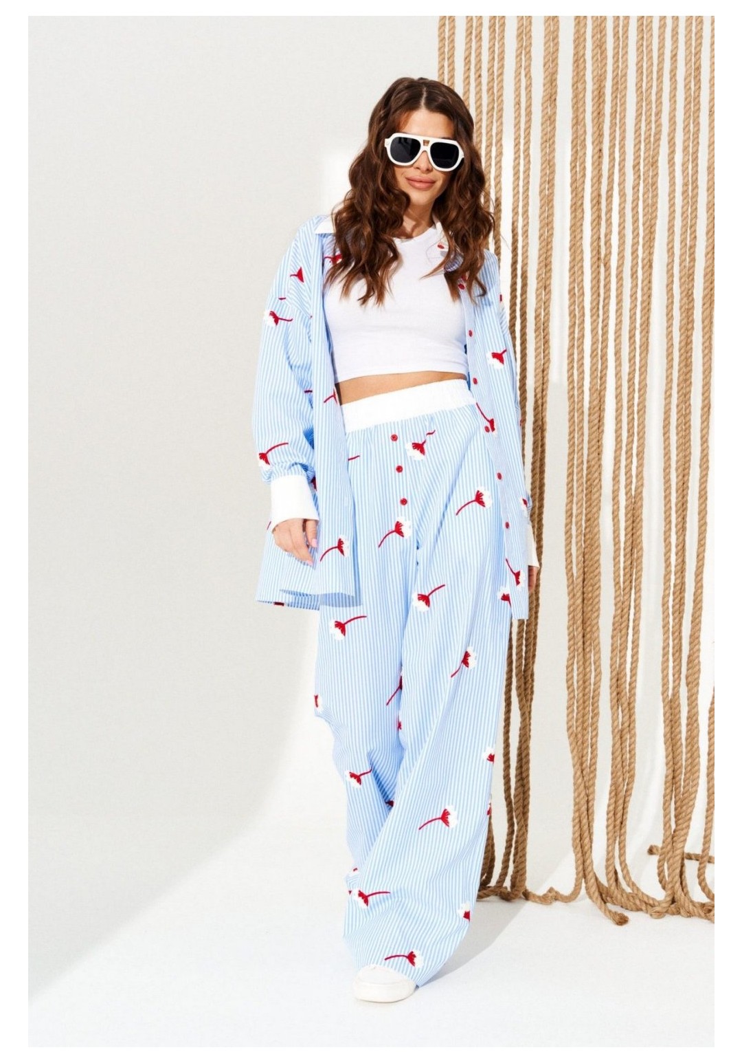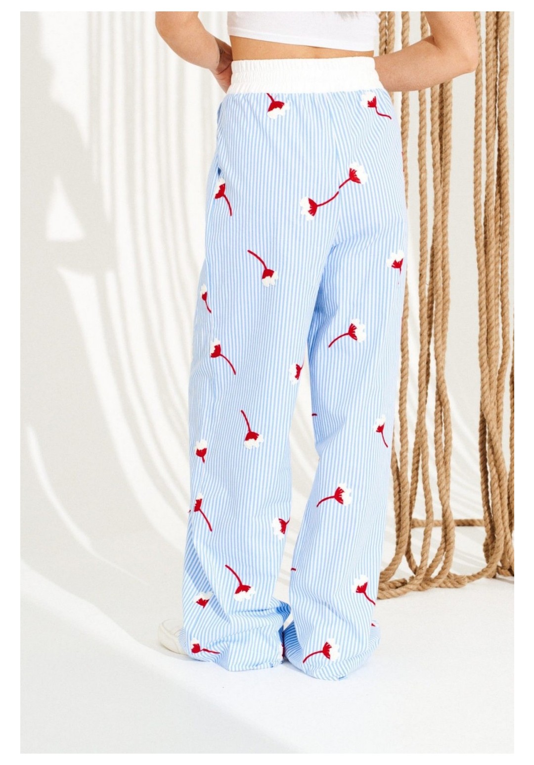 Брюки умеренного объема, прямого силуэта. На передних половинках выполнены боковые карманы с отрезным бочком и имитация гульфика с пуговицами. Пояс из контрастного материала, притачной, на резинке, с отделочными строчками. Длина на модели вдоль бокового шва с учетом пояса — 117 см (допустимое отклонение +/- 1 см)