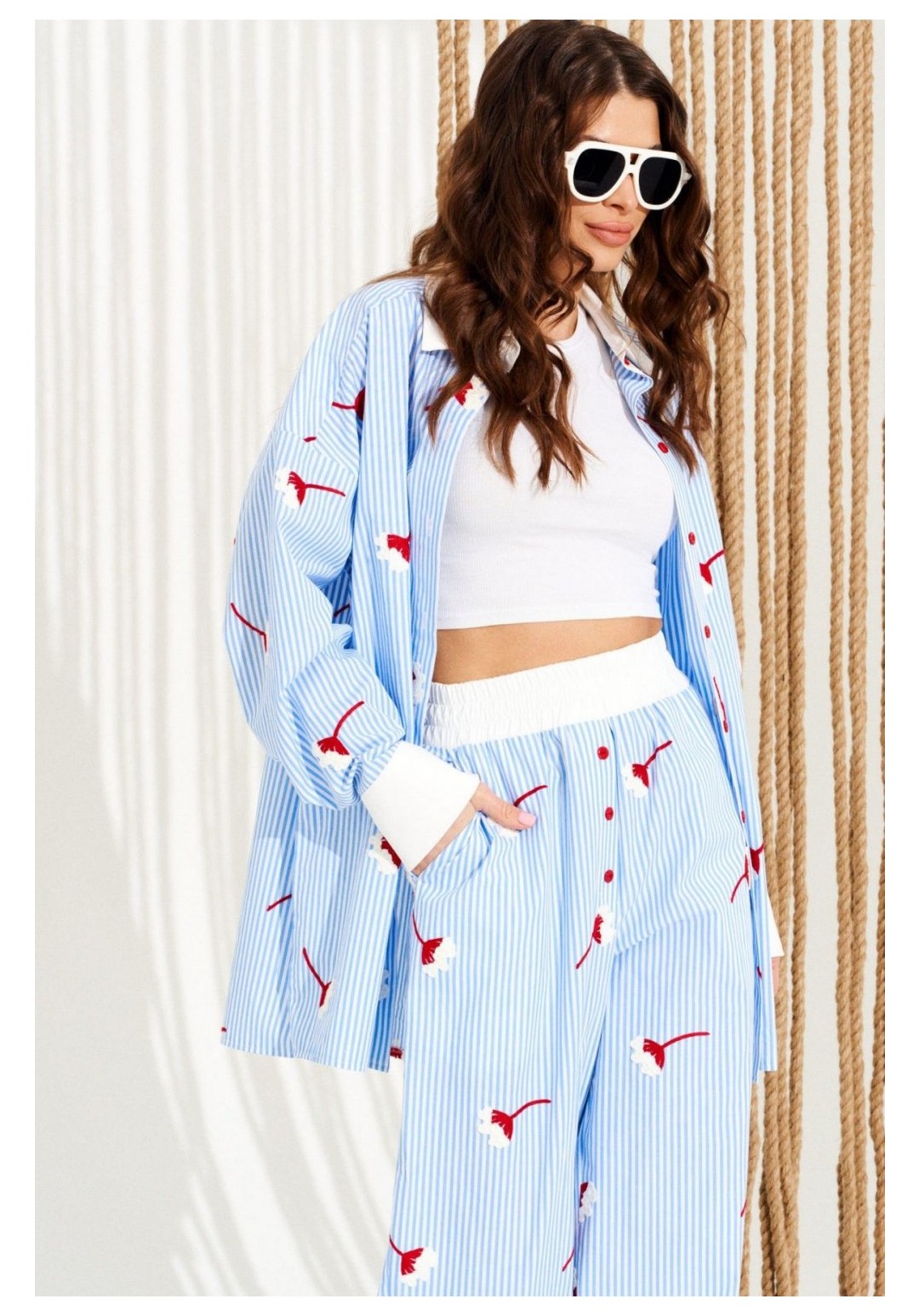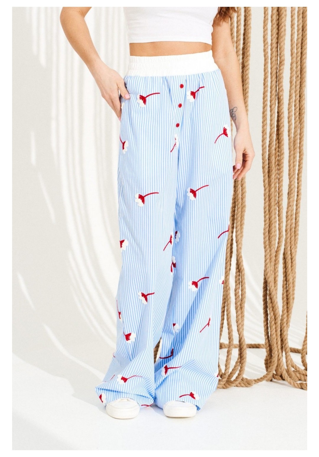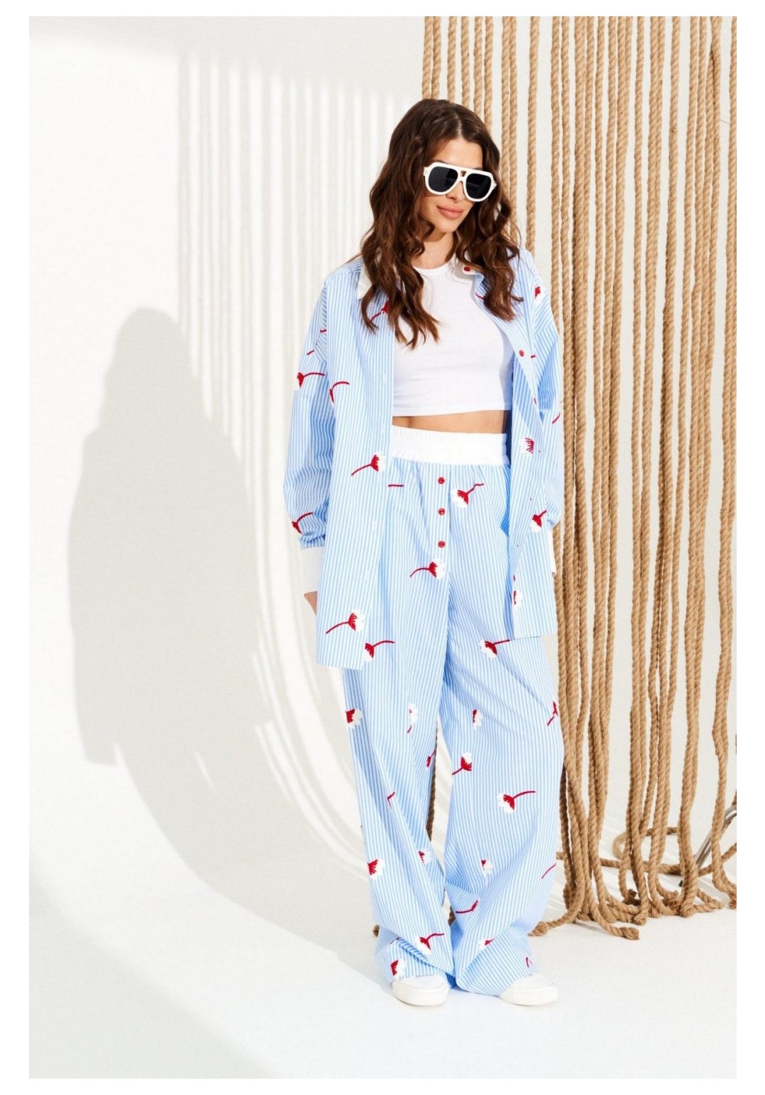 Брюки умеренного объема, прямого силуэта. На передних половинках выполнены боковые карманы с отрезным бочком и имитация гульфика с пуговицами. Пояс из контрастного материала, притачной, на резинке, с отделочными строчками. Длина на модели вдоль бокового шва с учетом пояса — 117 см (допустимое отклонение +/- 1 см)