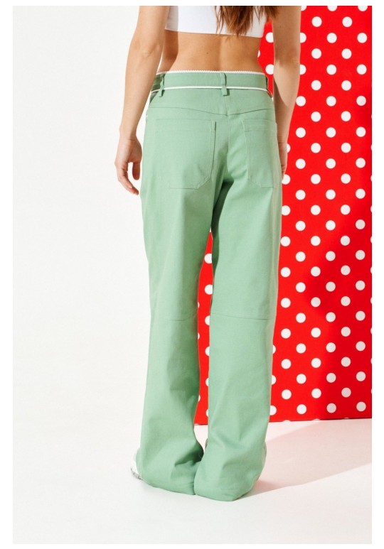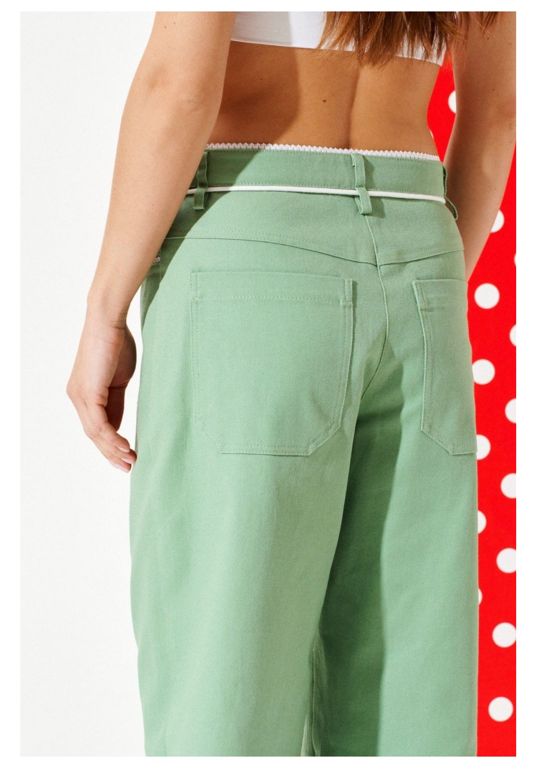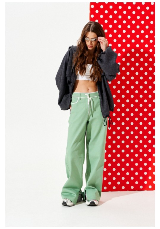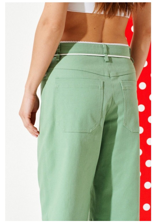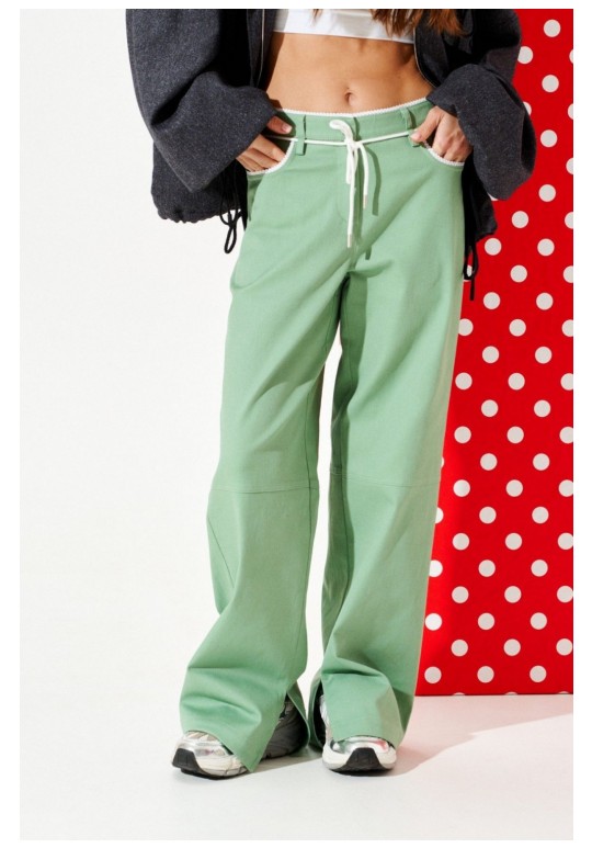 Брюки свободного объема, прямого силуэта. Застежка-гульфик на молнии. На передних половинках карманы с отрезной боковой частью. Задние половинки с притачной кокеткой и накладными карманами. Детали переда и спинки с горизонтальными подрезами на уровне колен. Пояс притачной, с застежкой на 1 обметанную петлю и пуговицу. Пояс с двойными шлевками. В шлевки продет декоративный шнур с наконечниками. Пояс и карманы на передних половинках брюк оформлены тесьмой из кружева.