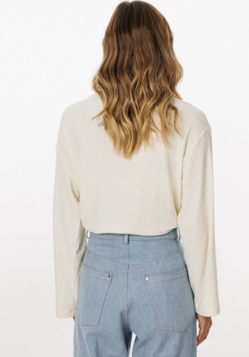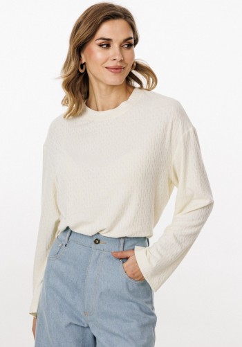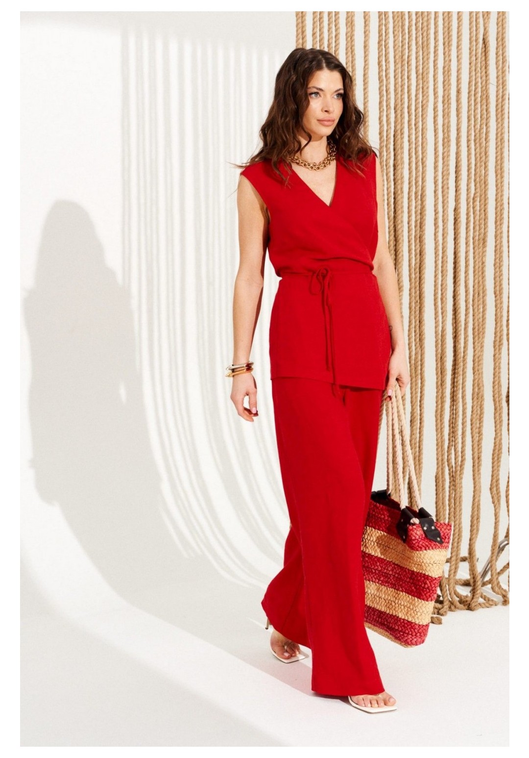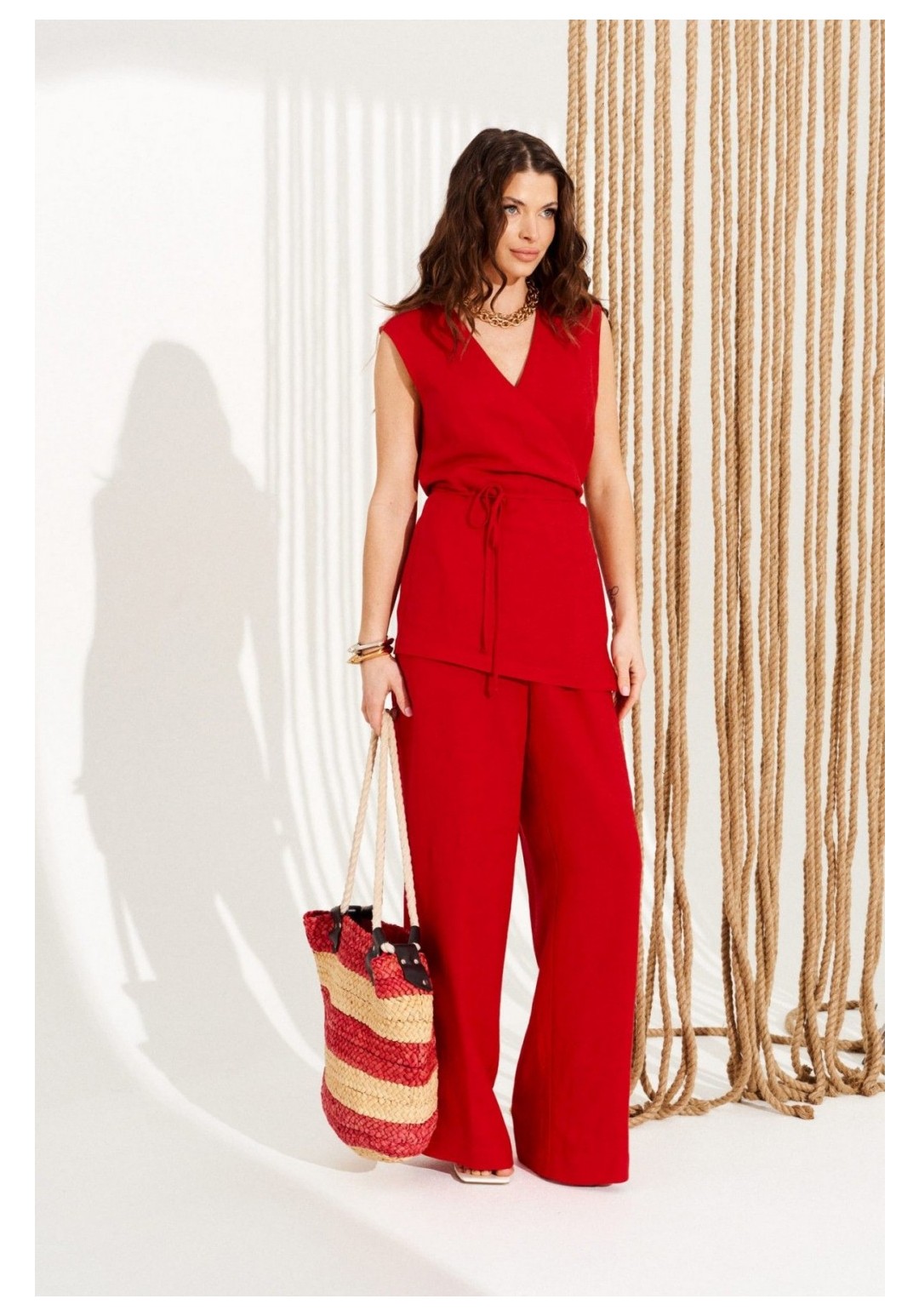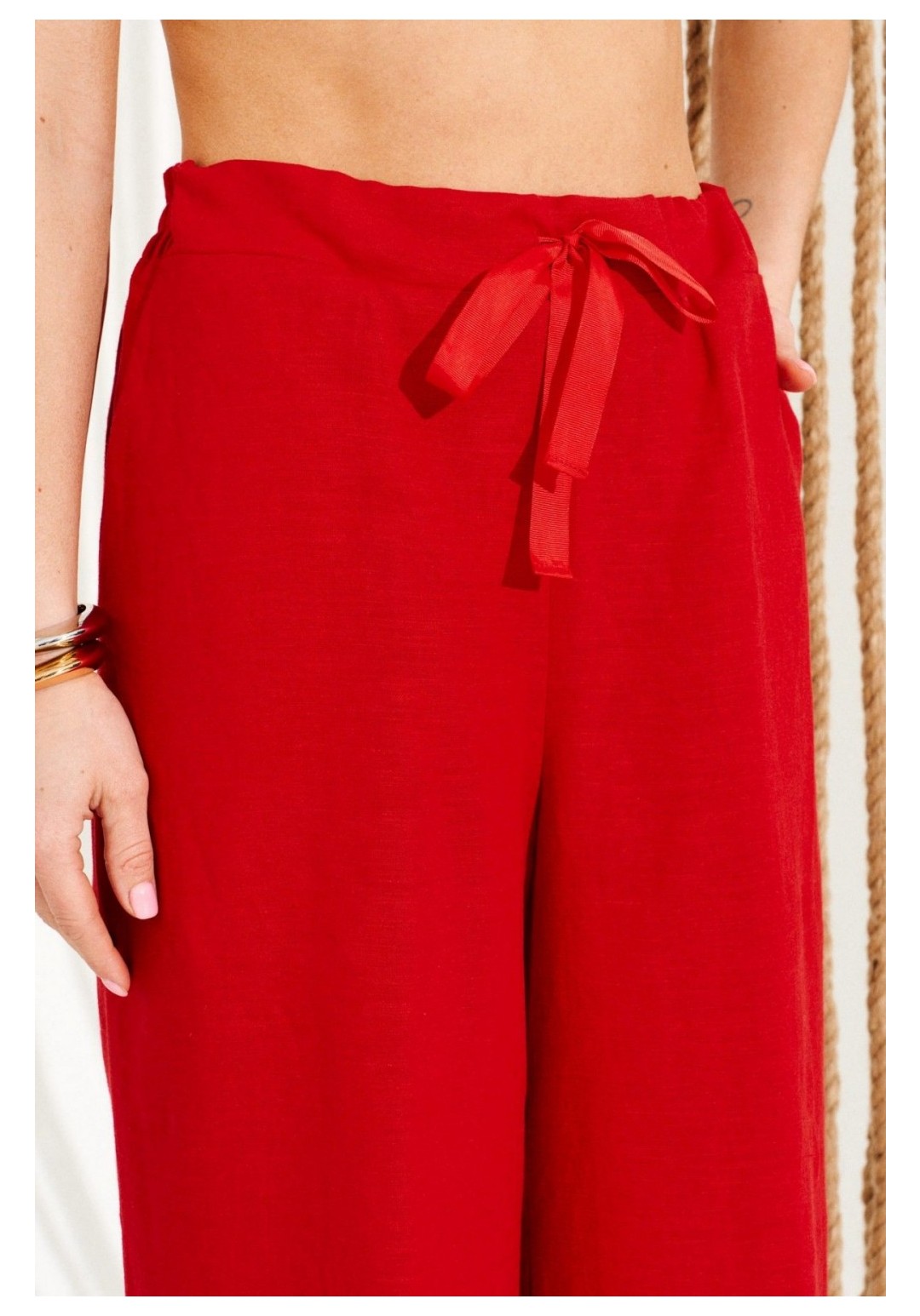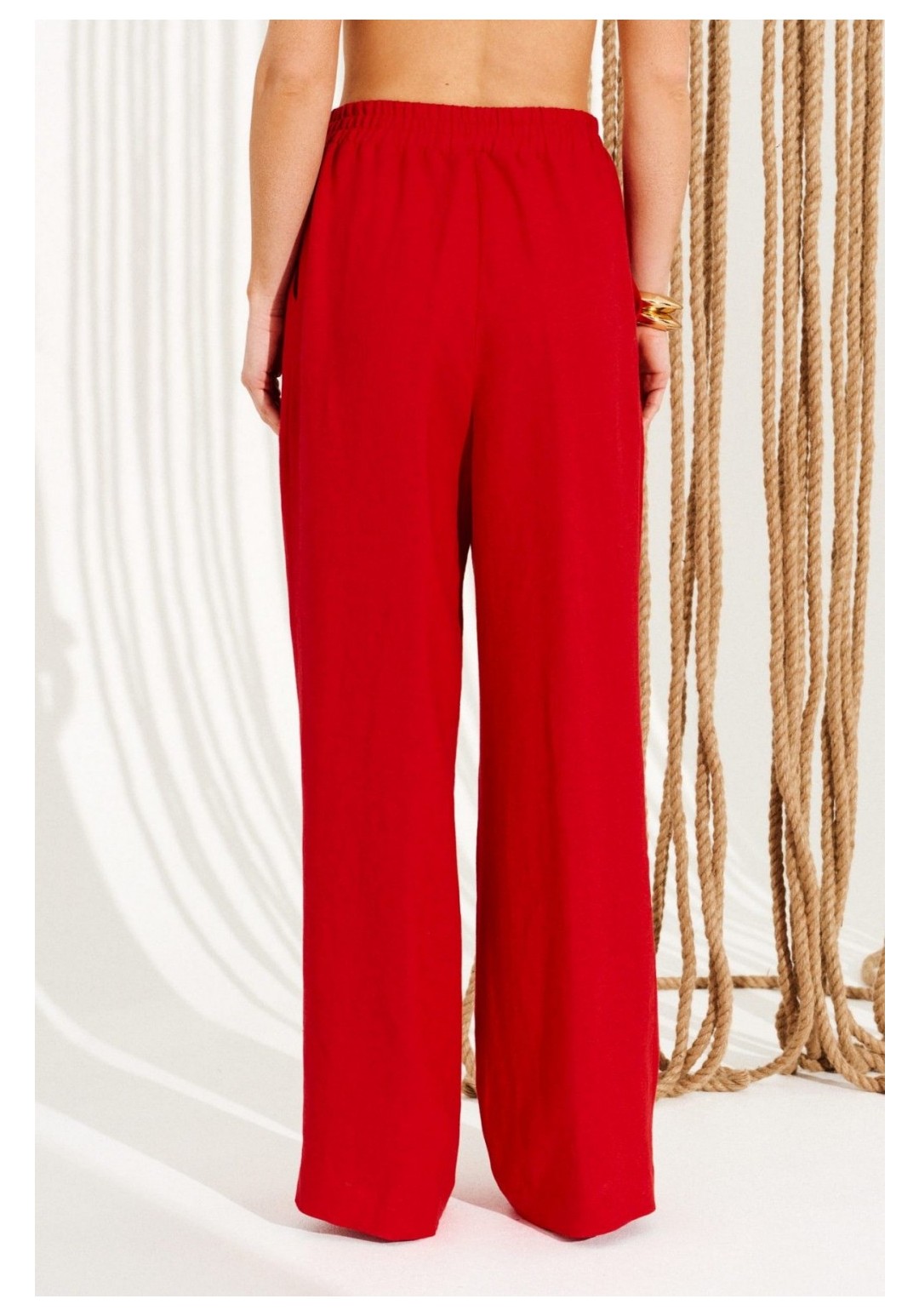 Брюки умеренного объема, прямого силуэта. На передних половинках выполнены боковые карманы с отрезным бочком. Пояс притачной, с резинкой по спинке и петлями по переду, в которые продета декоративная тесьма. Длина изделия на модели вдоль бокового шва с учетом пояса — 110,5 см (допустимое отклонение +/- 1 см)