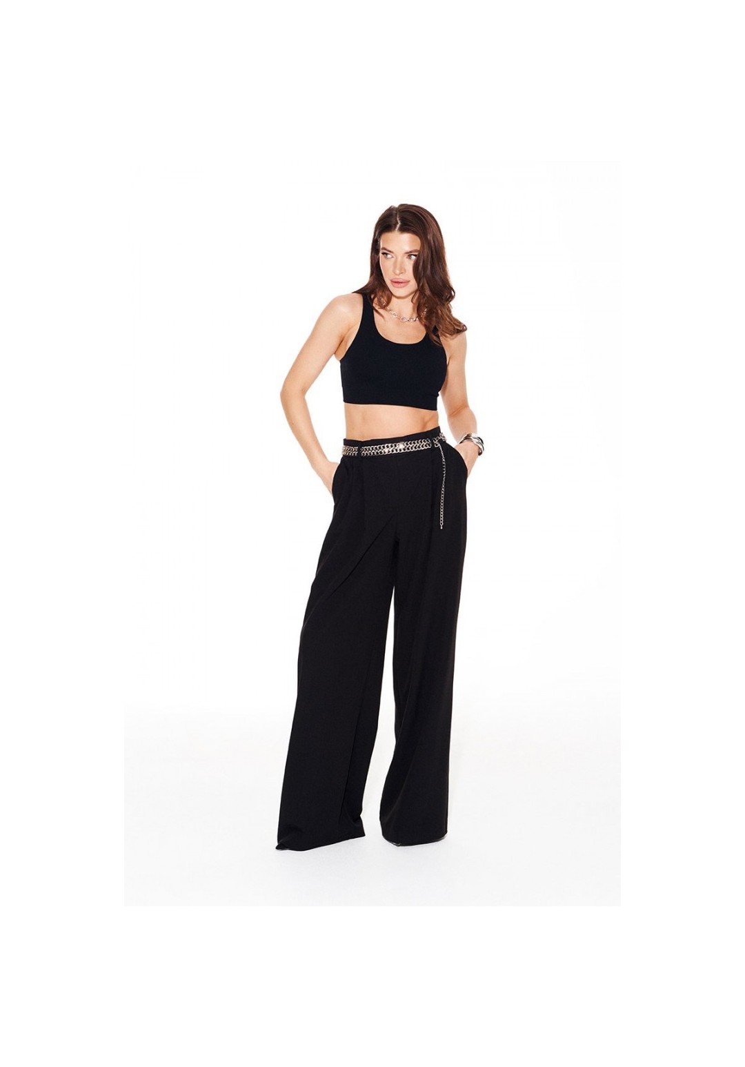 Брюки свободного объема, прямого силуэта. На передних половинках выполнены боковые карманы с отрезным бочком и односторонние складки. На задних половинках талиевые вытачки. Застежка – гульфик на молнии. Пояс притачной, с резинкой по спинке, застежка на петлю и пуговицу.