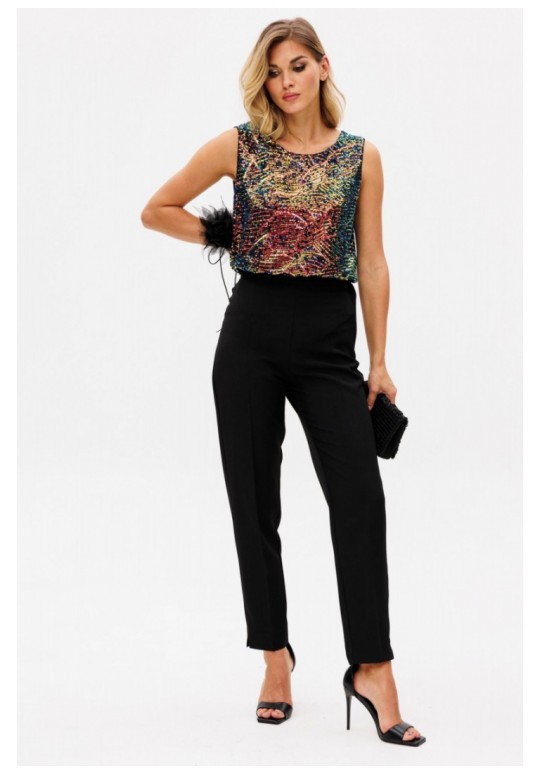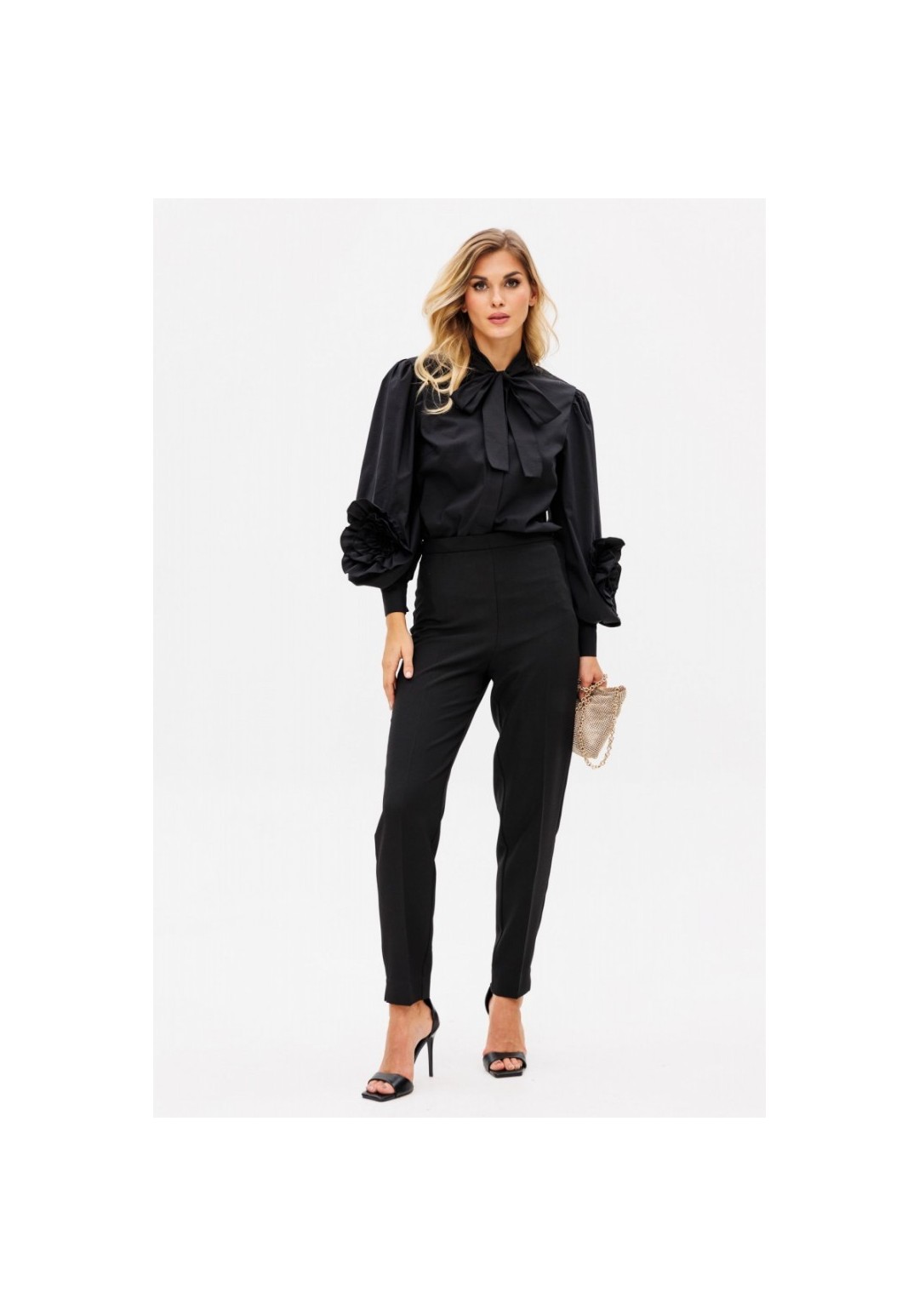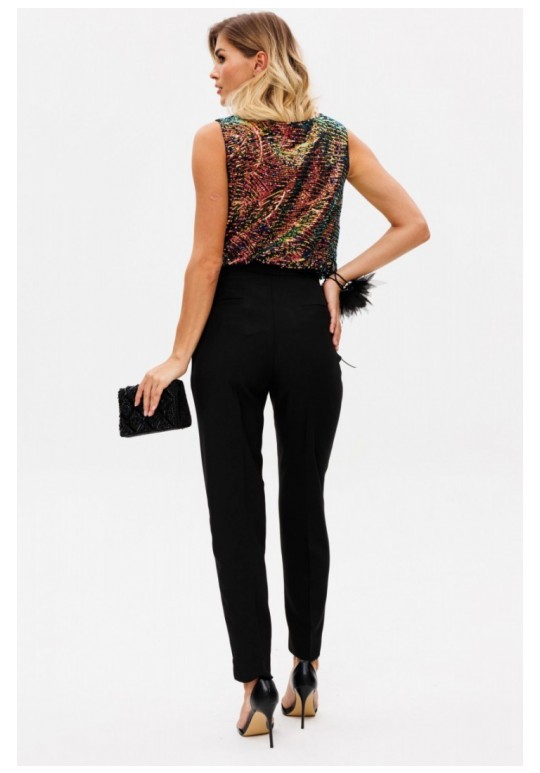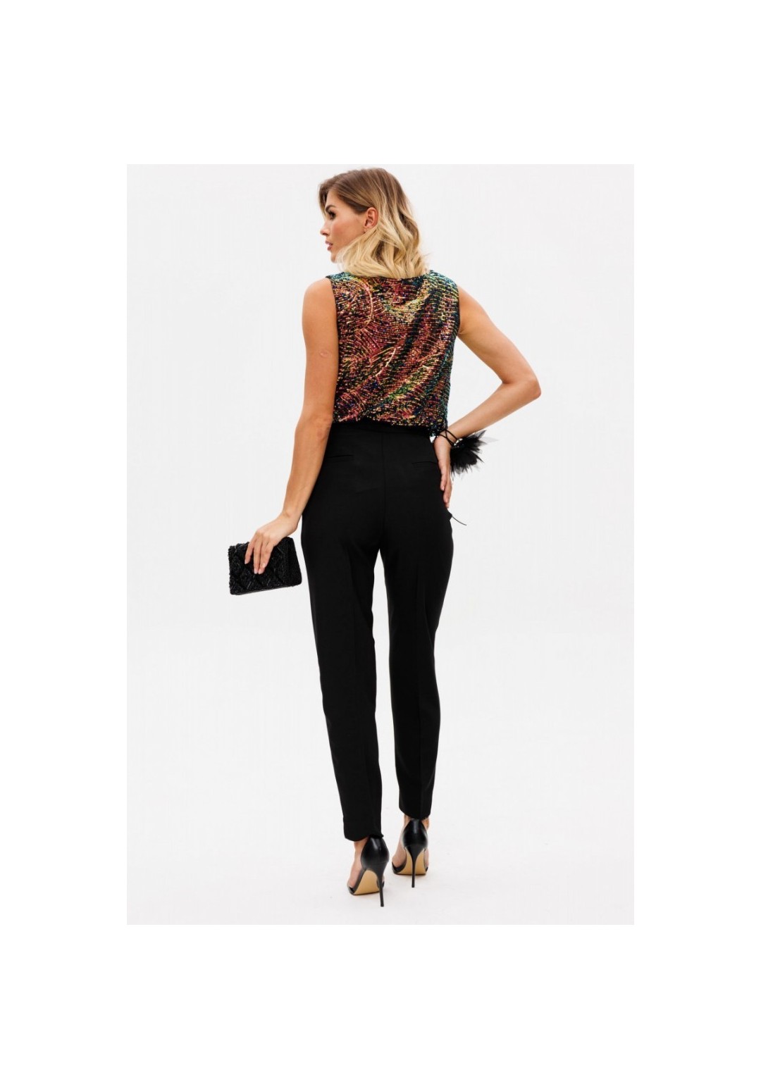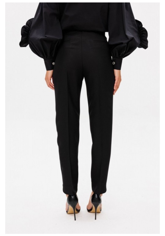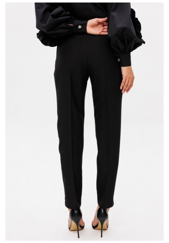 Брюки выполнены из однотонной костюмной ткани, заужены к низу, на задних половинках карманы с листочкой, застежка в боковом шве на металлическую молнию и пуговицу. По низу в боковом шве разрезы. Длина брюк р.44-54: с поясом - 100 см, без пояса - 98 см
