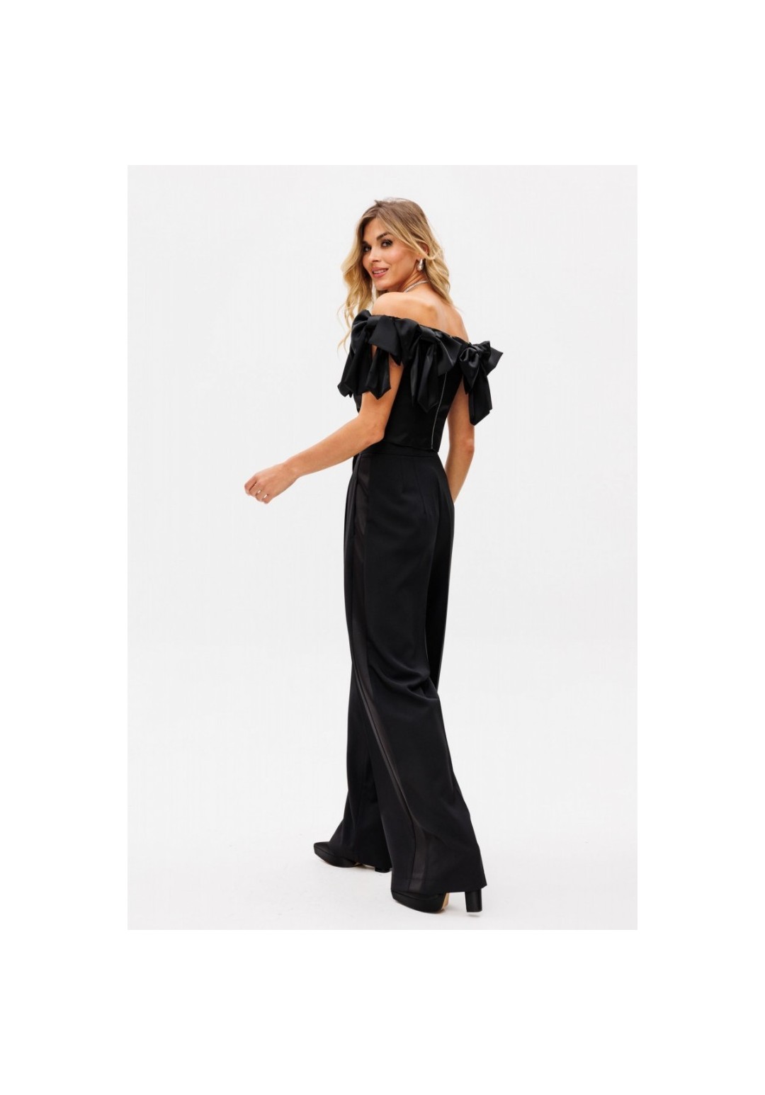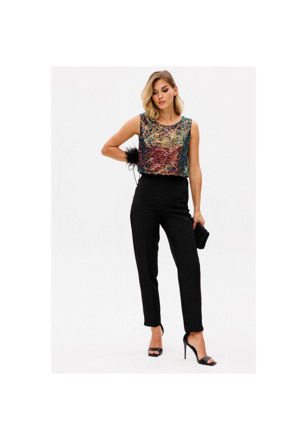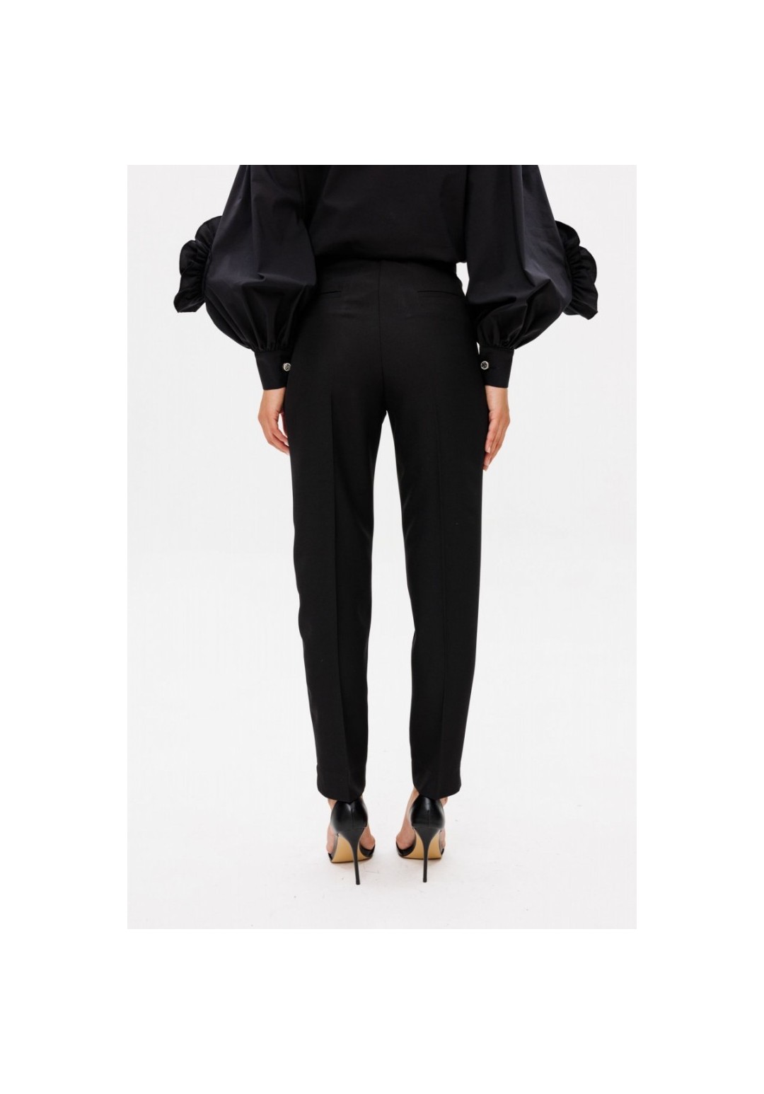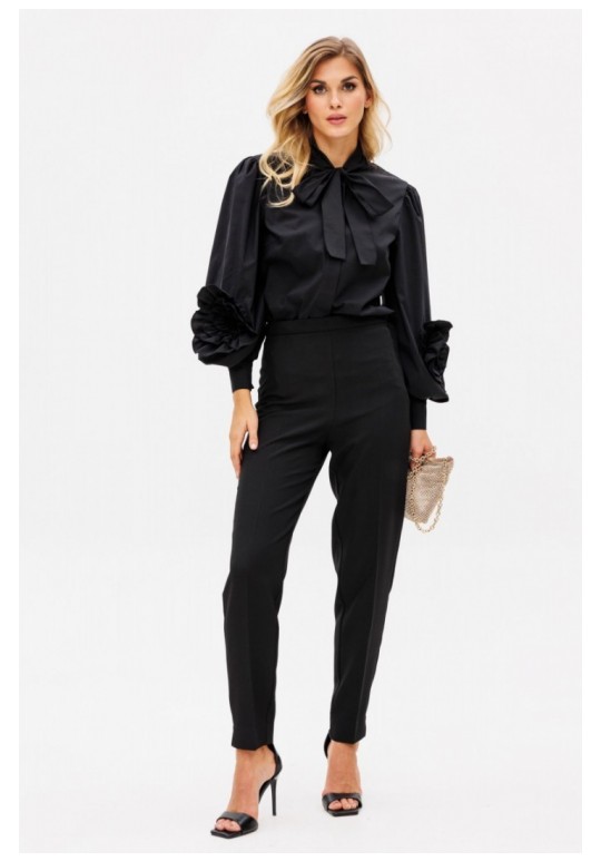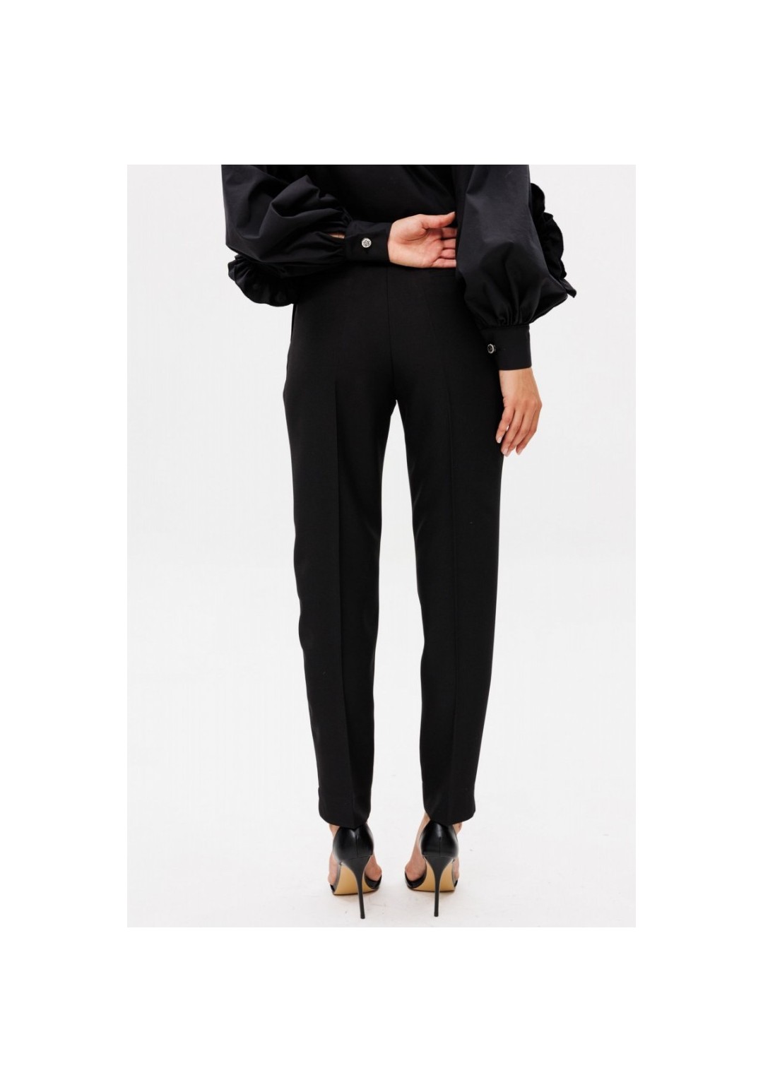 Брюки выполнены из однотонной костюмной ткани, заужены к низу, на задних половинках карманы с листочкой, застежка в боковом шве на металлическую молнию и пуговицу. По низу в боковом шве разрезы. Длина брюк р.44-54: с поясом - 100 см, без пояса - 98 см