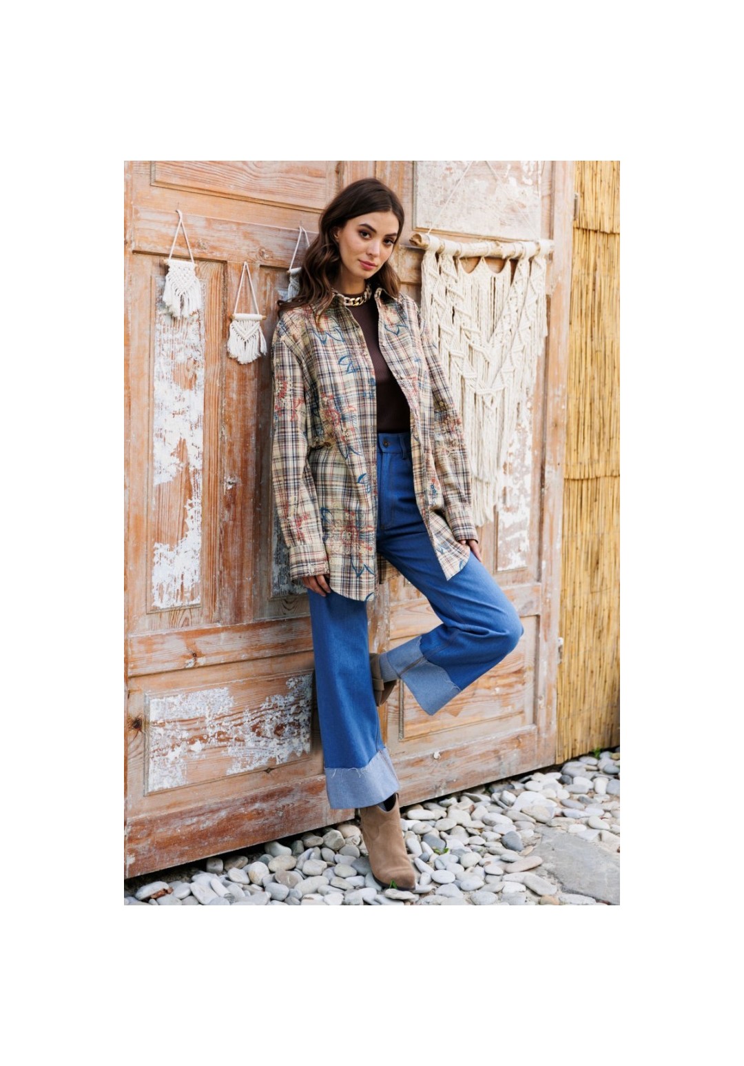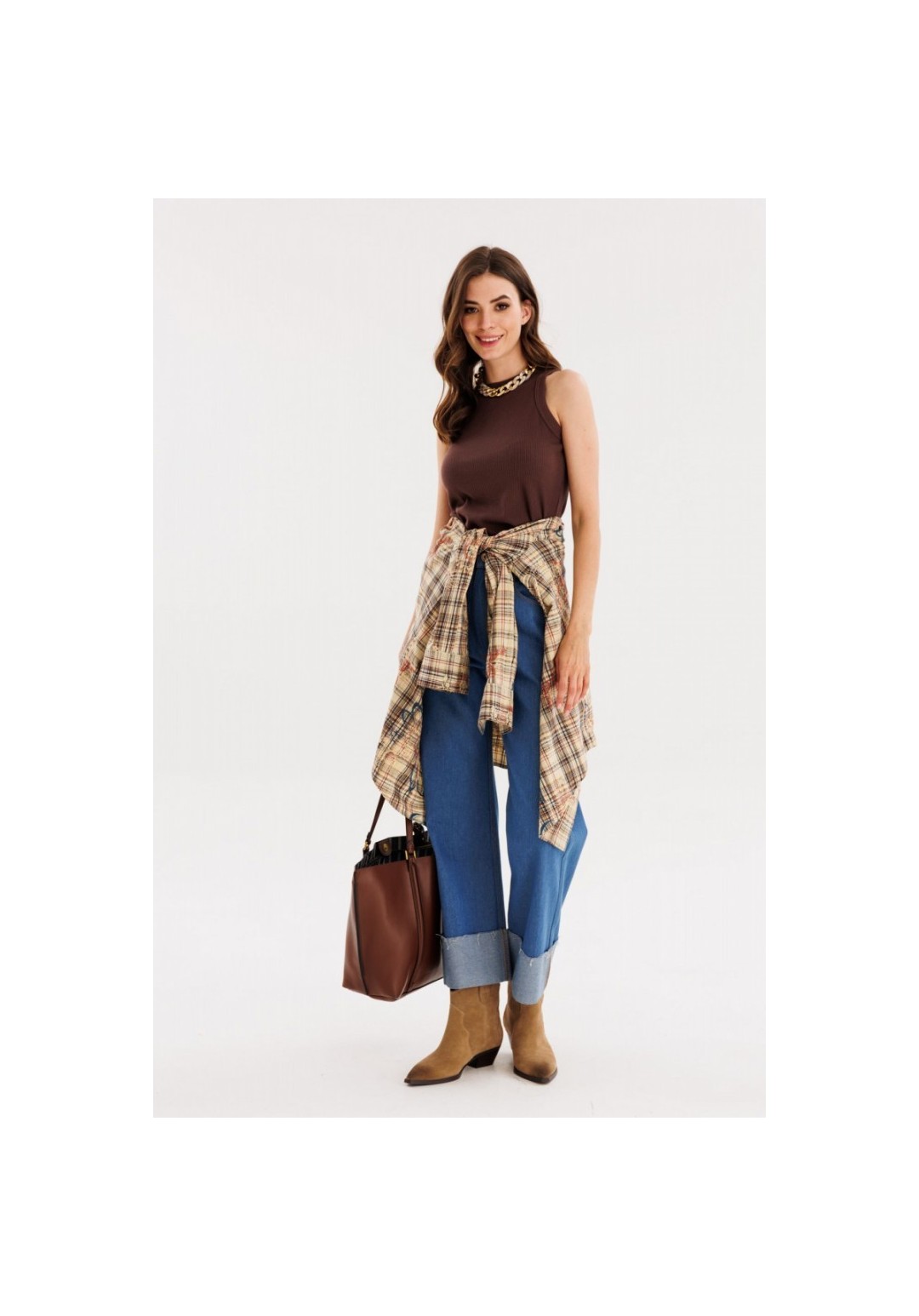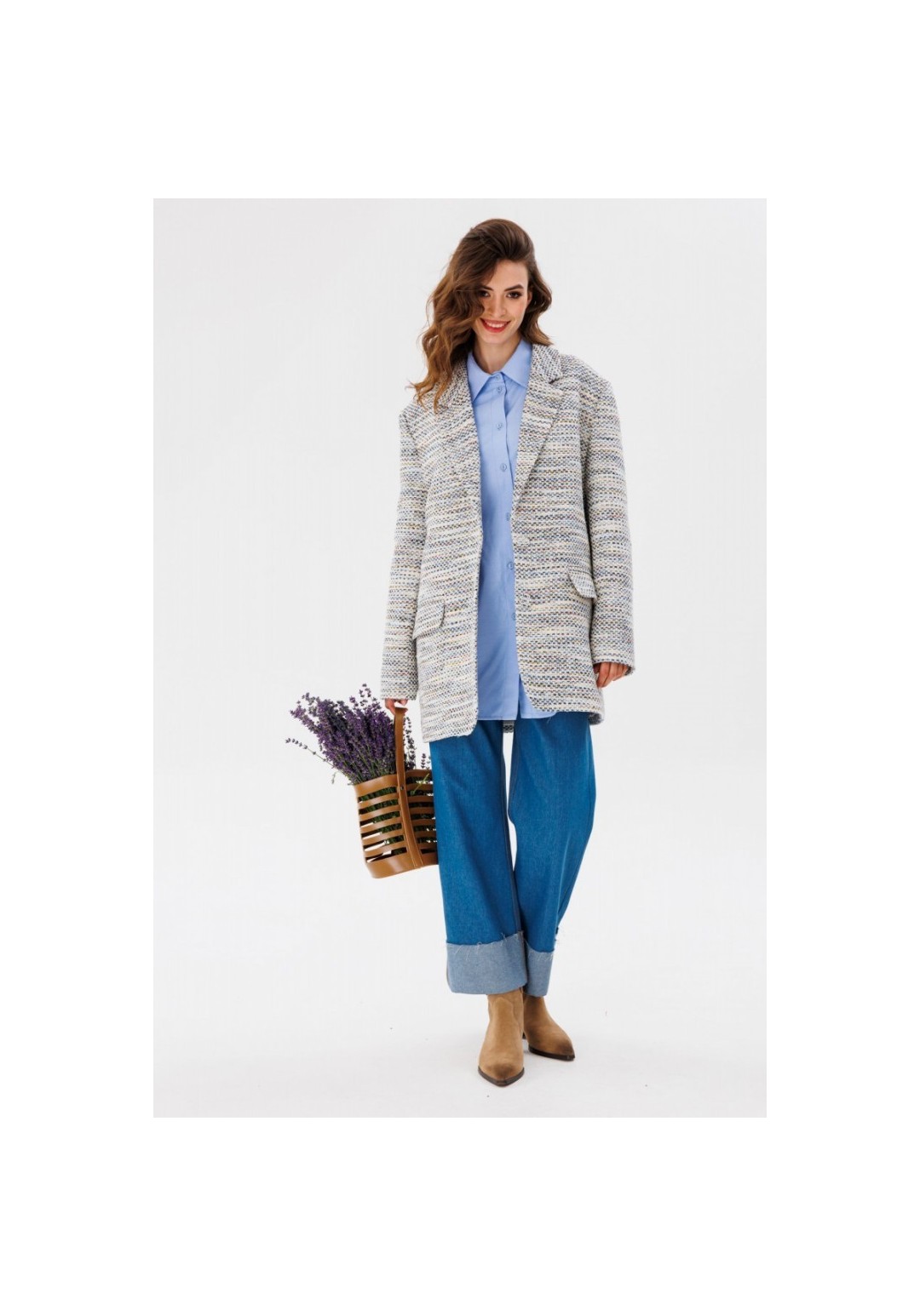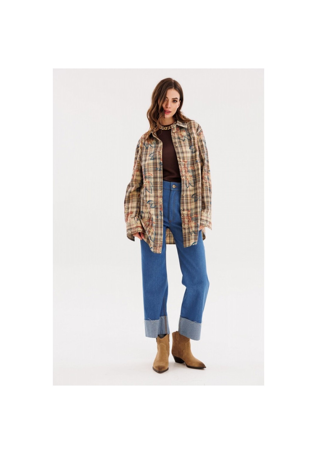 Брюки выполнены из джинса. Брюки прямого силуэта, на притачном поясе, длиной 7/8 с декоративным широким отворотом по низу. Спереди боковые карманы с фигурным входом. Застежка спереди на молнию с гульфиком и пробивную пуговицу. Сзади накладные карманы, декорированные нашивкой. Длина брюк: р. 44-48 - 99 см, р. 50-54 - 100,5 см. Гарантийный срок не установлен ГОСТ 25294 - 2003