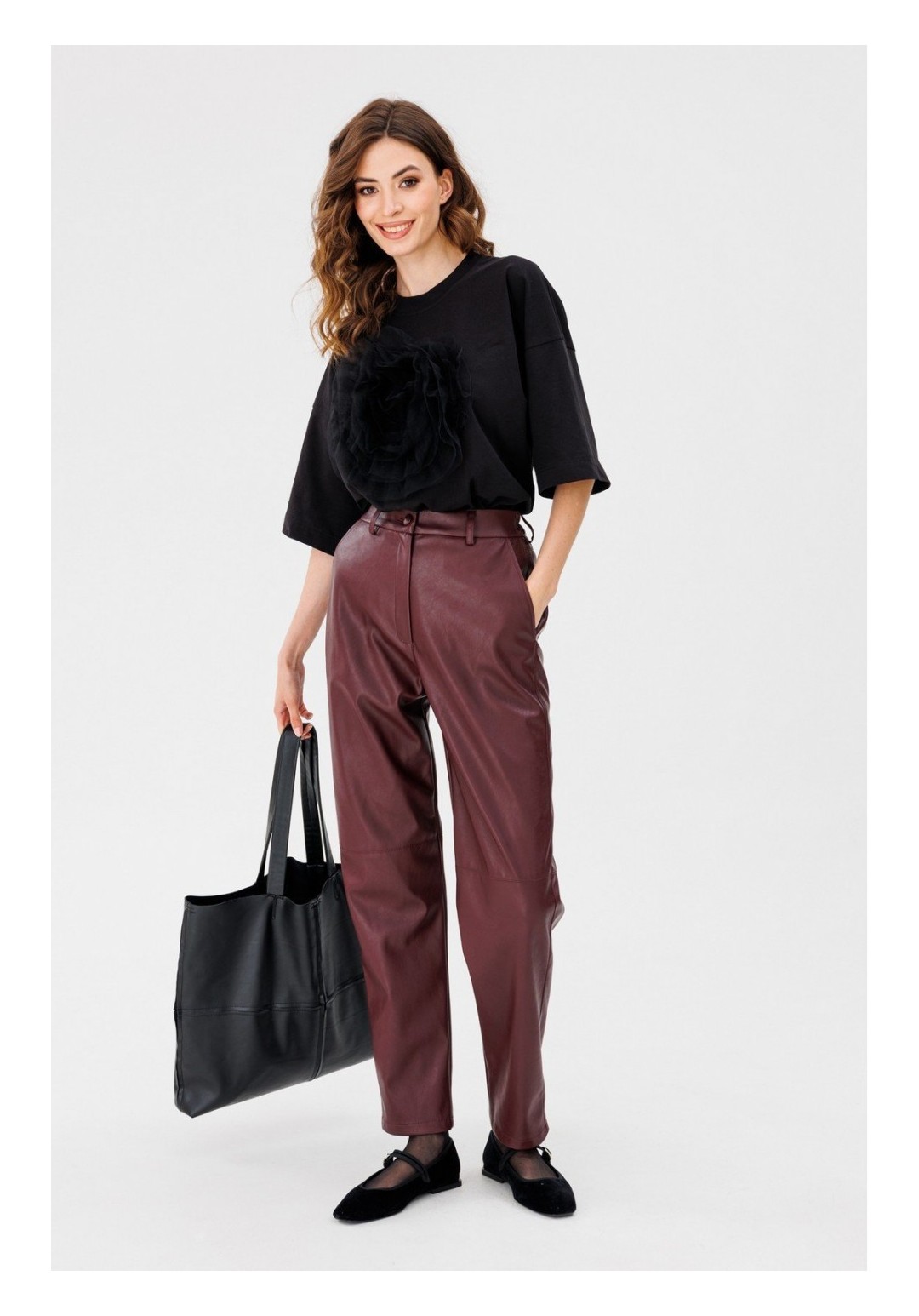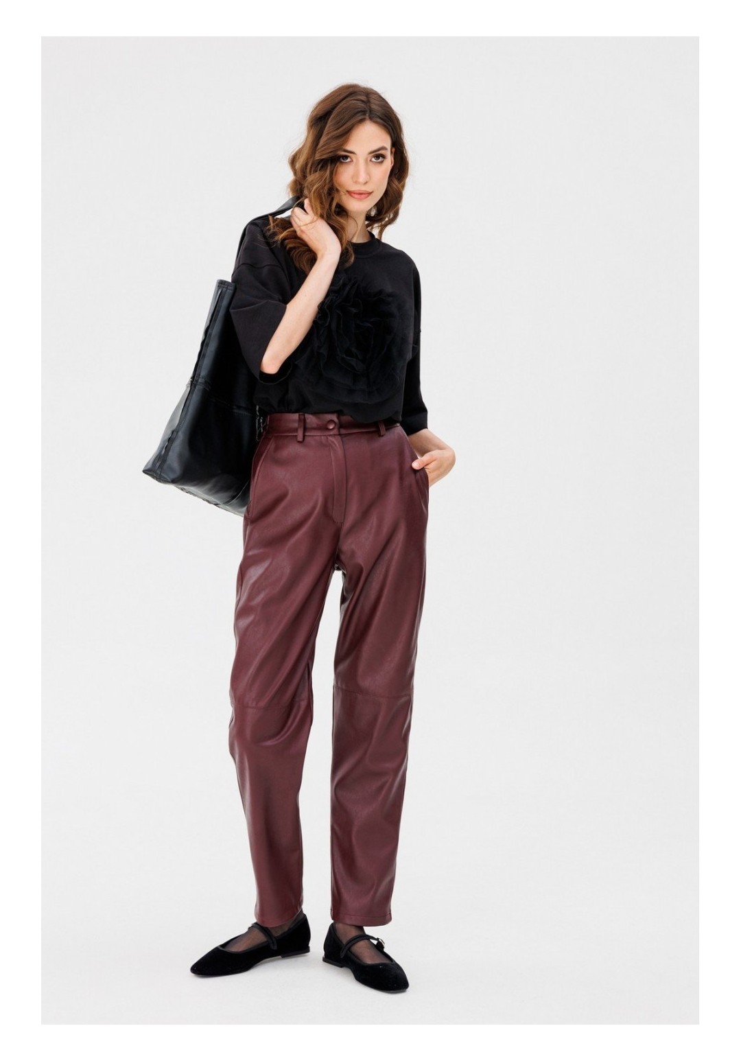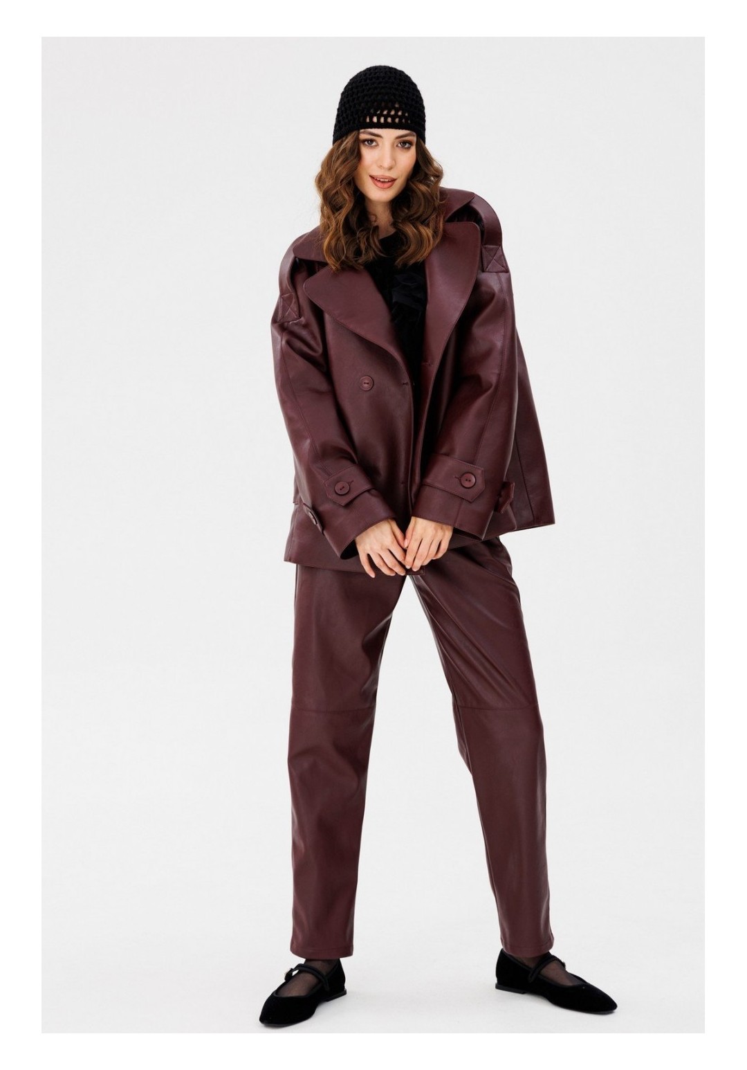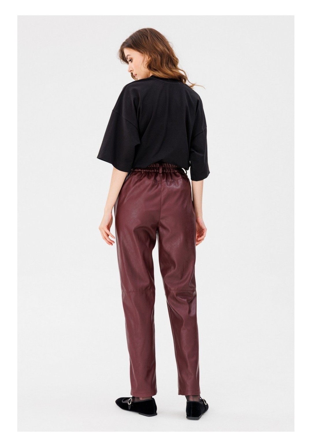 Брюки выполнены из экокожи. Брюки на притачном поясе, зауженные к низу. Спереди на уровне колен обработаны горизонтальные подрезы. Застежка спереди на молнию с гульфиком и пуговицу. В задней части пояса вставлена эластичная тесьма. Карманы боковые с наклонным входом. Длина брюк: р.44-48 - 106 см, р.50-54 - 107,5 см. Гарантийный срок не установлен ГОСТ 25294- 2003