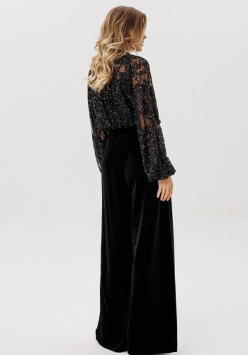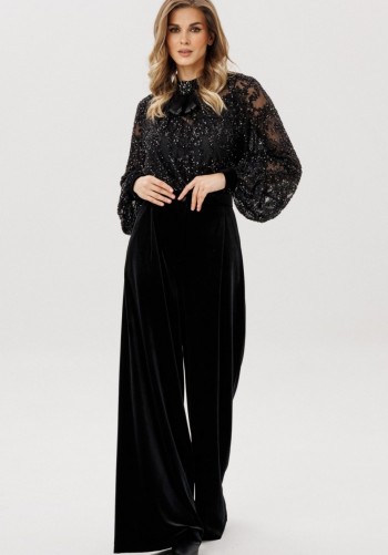 Брюки выполнены из плательно-костюмной ткани. Брюки прямого силуэта, на притачном поясе с эластичной тесьмой, длиной в пол. Спереди боковые карманы с наклонным входом. Длина брюк с поясом: р.44-48 - 112 см, р.50-54 - 113,5 см. Гарантийный срок не установлен ГОСТ 25294 - 2003
