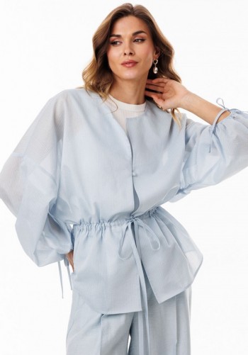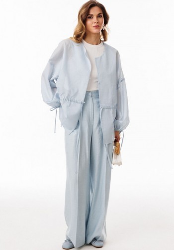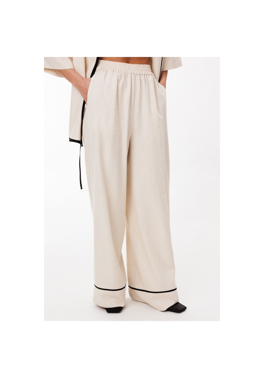Брюки выполнены из льна. Брюки прямого силуэта, длиной в пол, на притачном поясе с эластичной тесьмой. На передних частях обработаны боковые карманы с наклонным входом. Низ брюк обработан притачной манжетой с кантом из отделочной ткани. Длина брюк: р.44-48 -110,5 см, р.50-54 - 111,5 см.
