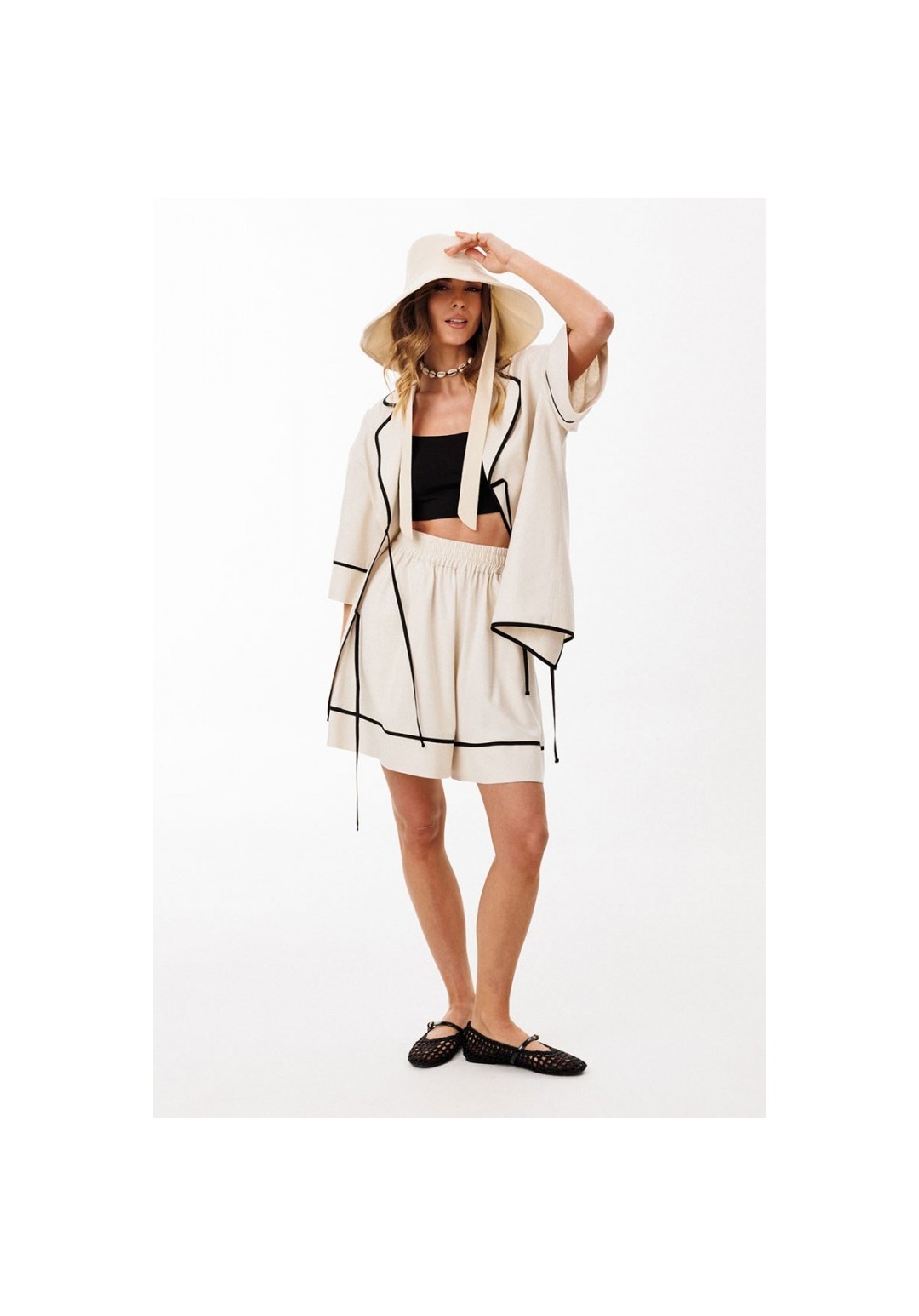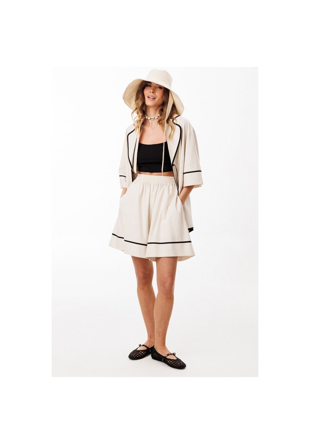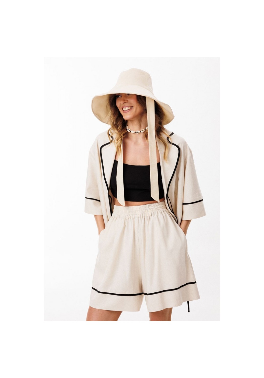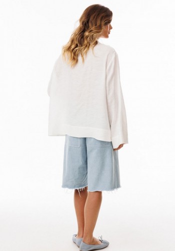 Шорты выполнены из льна. Шорты на притачном поясе с эластичной тесьмой, длиной выше линии колена. На передних и задних частях обработаны талиевые вытачки. В боковых швах обработаны карманы. Низ шорт обработан притачной манжетой с кантом из отделочной ткани. Длина шорт: р.44-48 -49 см, р.50-54 -50,5 см.