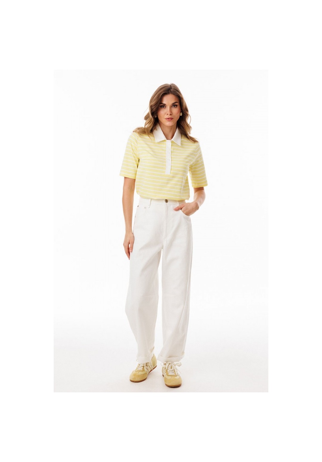 Джинсы-багги выполнены из джинса. Брюки на притачном поясе, длиной до линии щиколотки, расширенные от бедер и слегка зауженные к низу. Спереди боковые карманы с фигурным входом. Застежка на пуговицу и металлическую молнию с гульфиком. На задних частях кокетки и накладные карманы. На передней и задней части коленные вытачки. Длина брюк: р.44-48 - 102 см, р. 50-54 - 103,5 см.