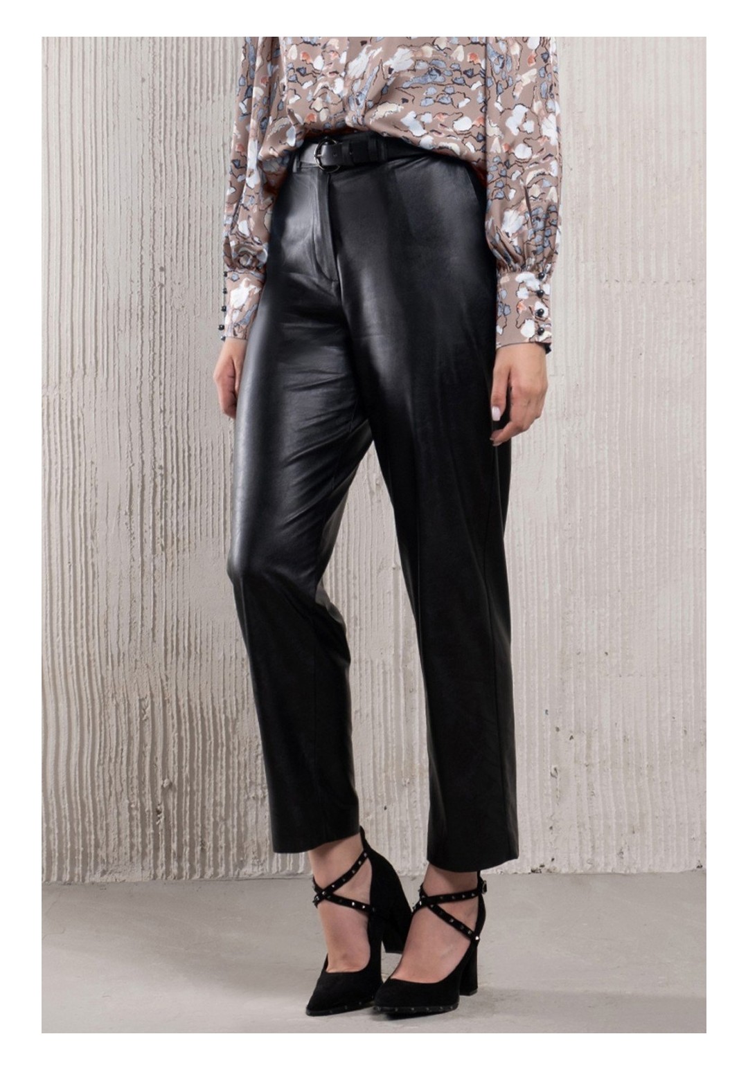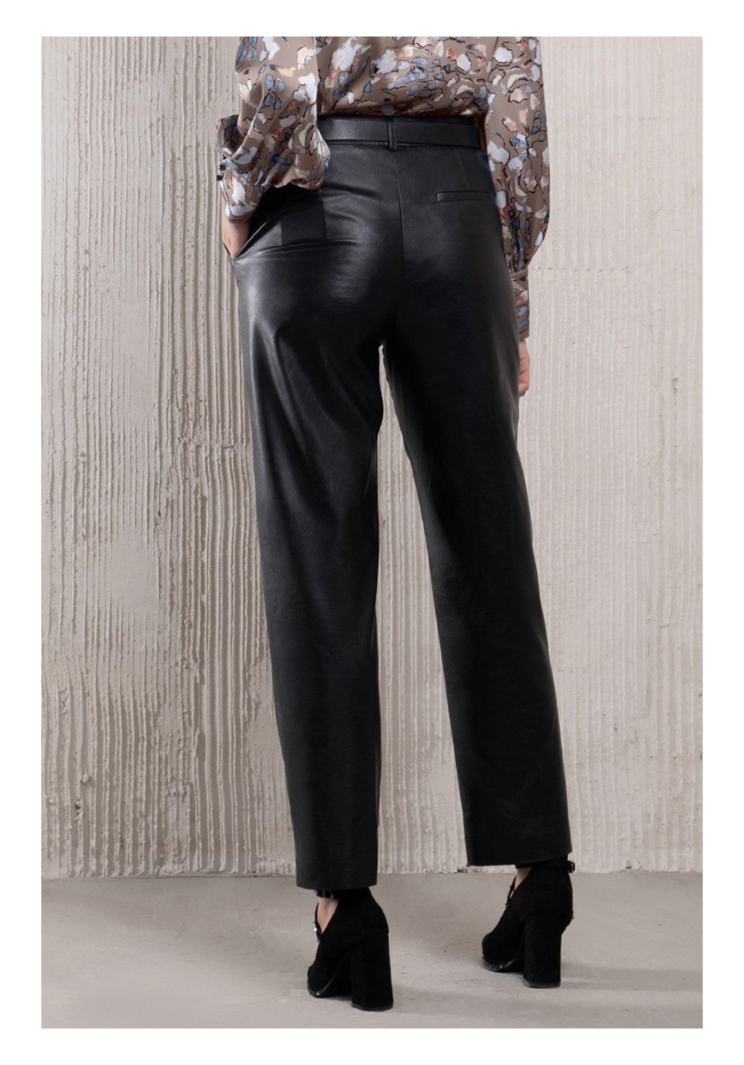Брюки из эко-кожи классического покроя, немного зауженные к книзу. Ткань средней плотности, тянется. Застежка на переде. Ремень в комплект не входит. На переде удобные карманы.