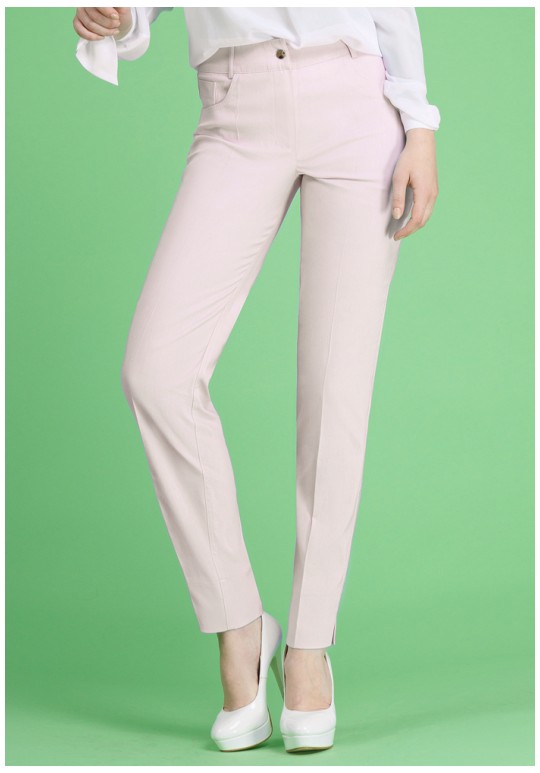 Брюки женские из плотной хлопковой ткани, прилегающего силуэта, с накладными карманами сзади, и обманками по переду. Брюки на притачном поясе. С застежкой петля-пуговица. Низ брюк декорирован разрезами.