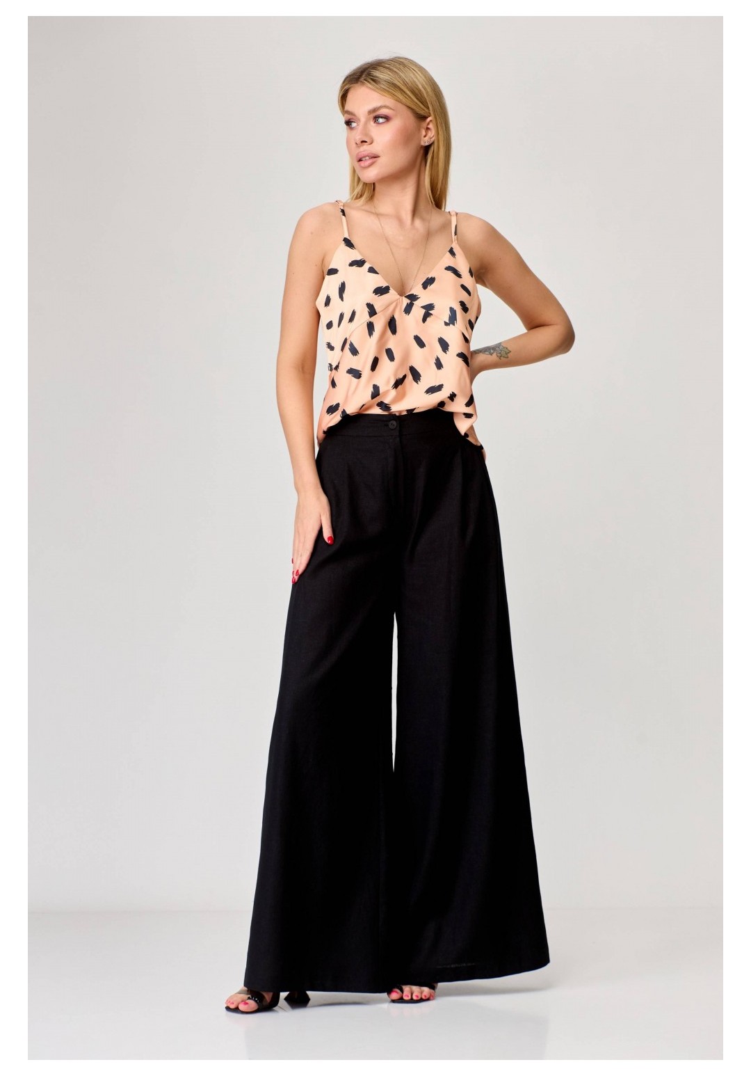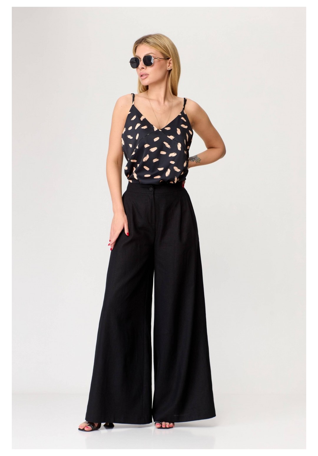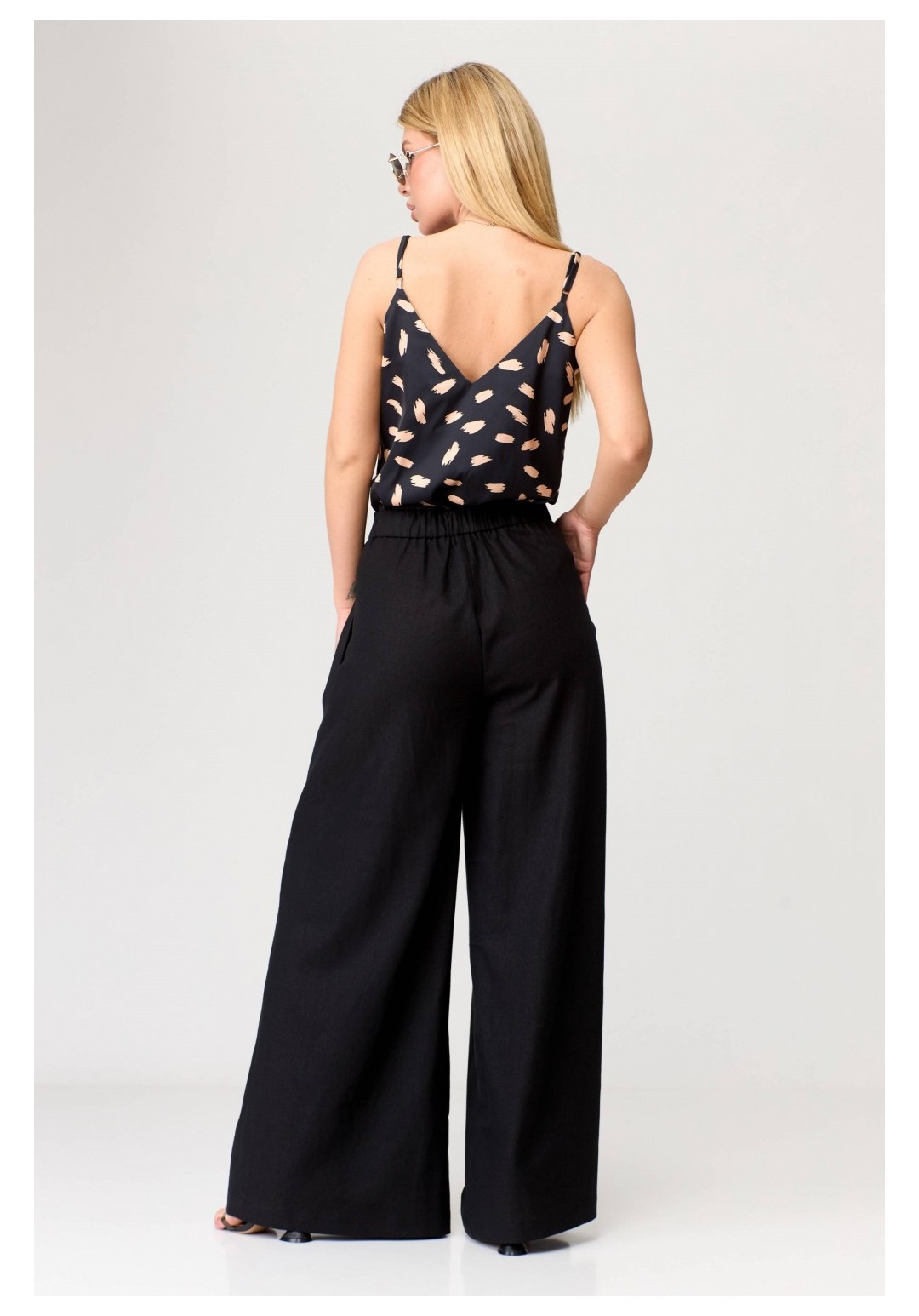 Брюки-палаццо расширенного к низу силуэта, на притачном поясе, с эластичной тесьмой (резинкой) сзади. В боковых швах карманы наклонной формы. Передние половинки с односторонними заложенными складками, застежка на функциональную тесьму-молнию. Рост: 164,170 Размерный ряд: 42-58 Состав: лён 100%