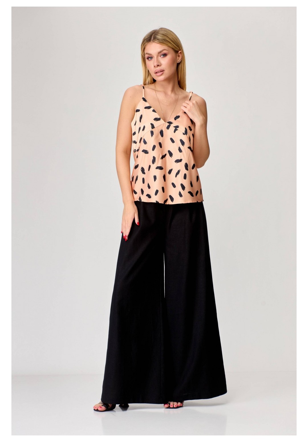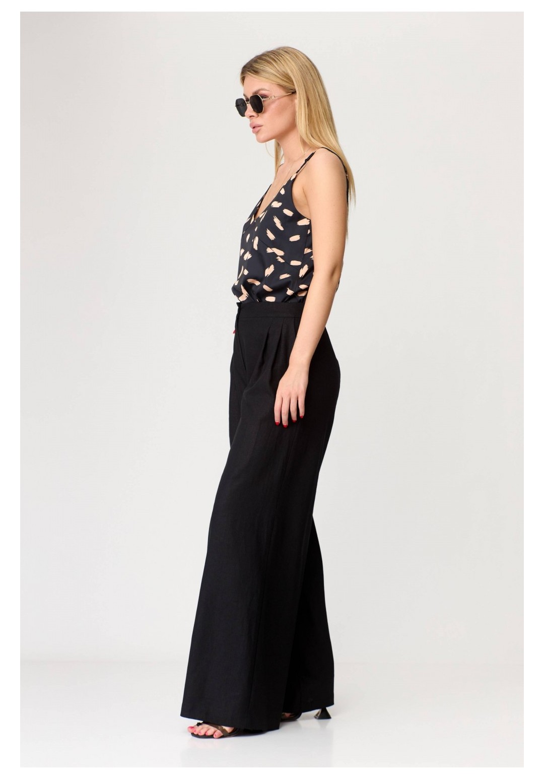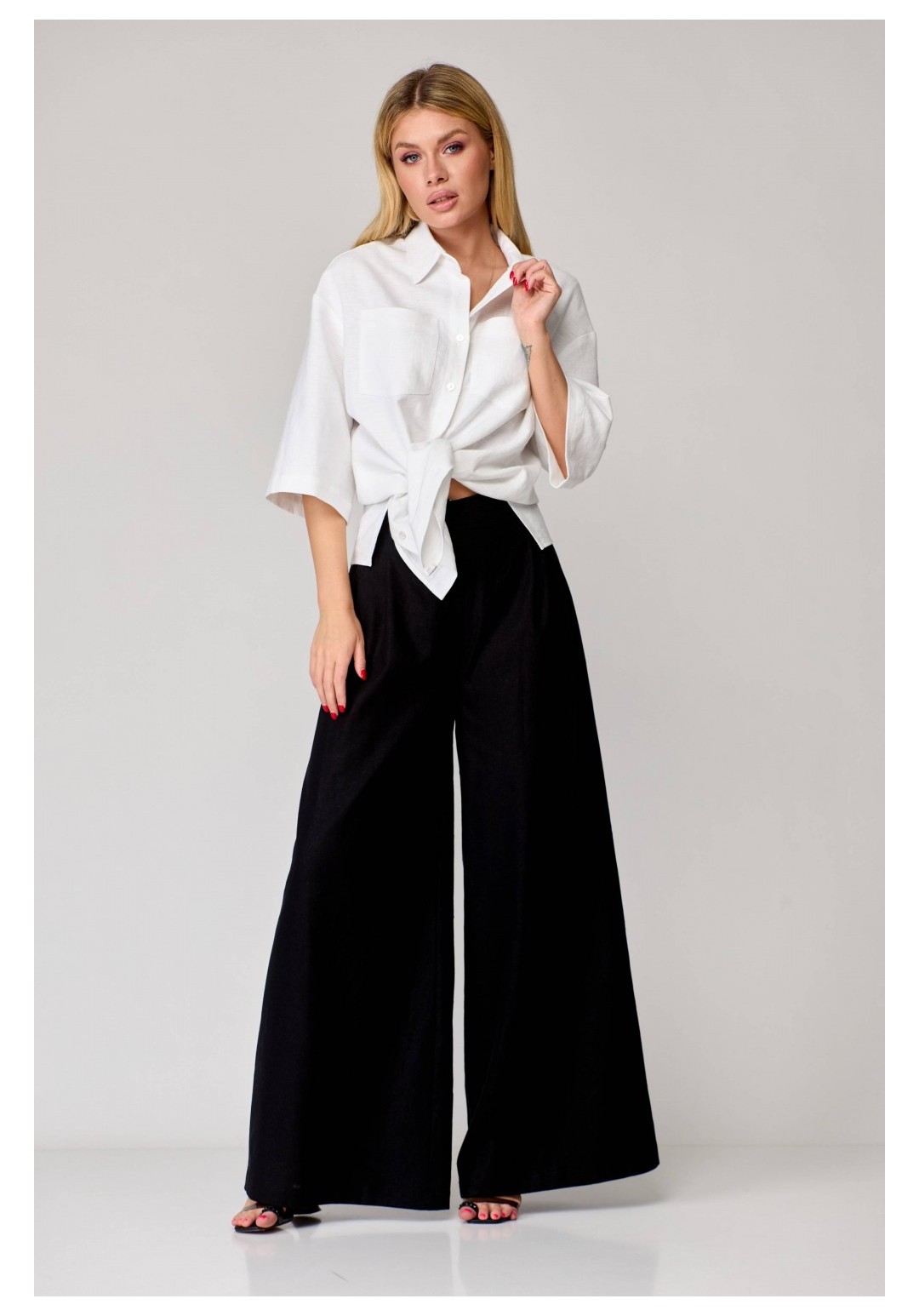 Брюки-палаццо расширенного к низу силуэта, на притачном поясе, с эластичной тесьмой (резинкой) сзади. В боковых швах карманы наклонной формы. Передние половинки с односторонними заложенными складками, застежка на функциональную тесьму-молнию. Рост: 164,170 Размерный ряд: 42-58 Состав: лён 100%