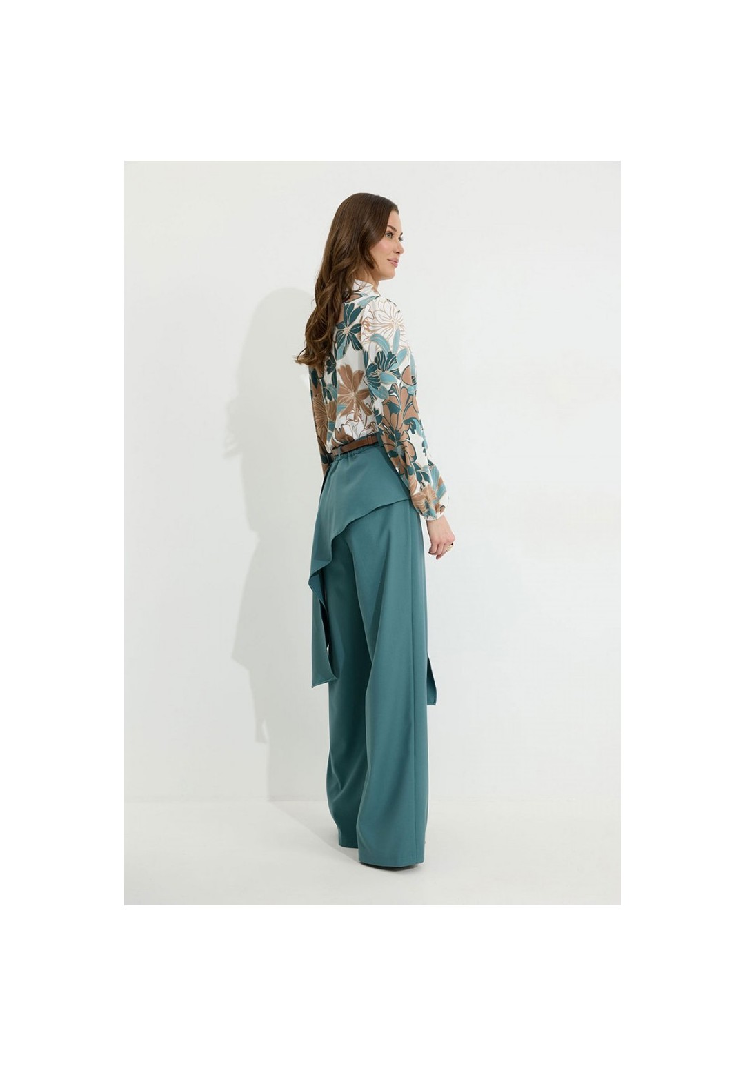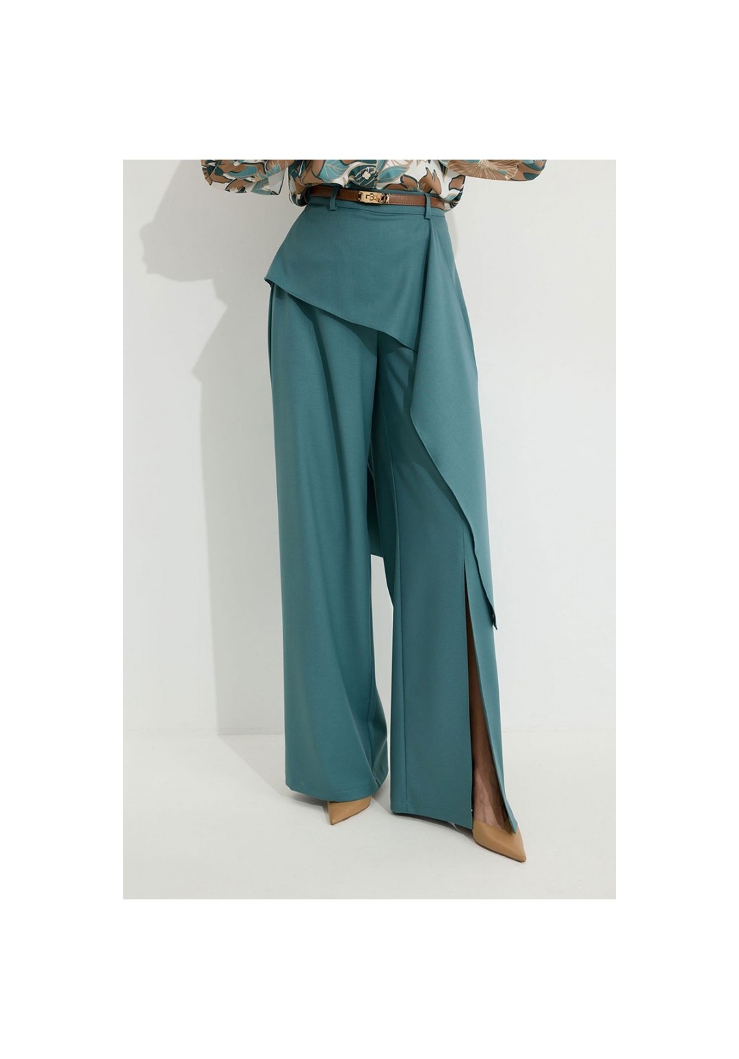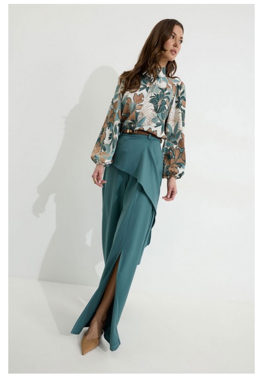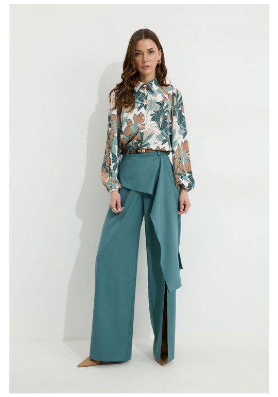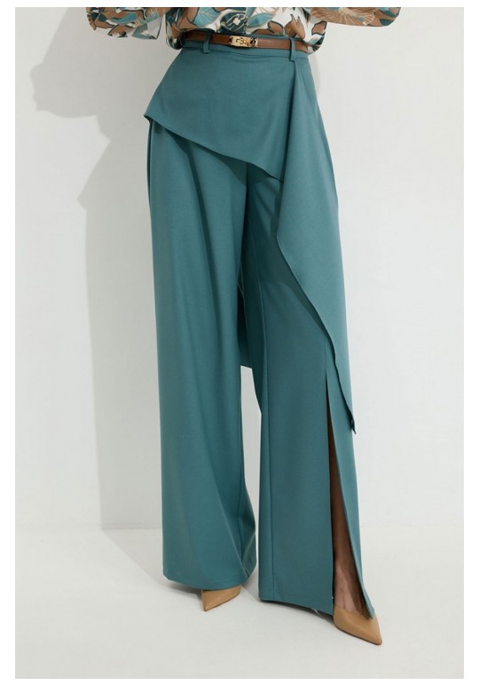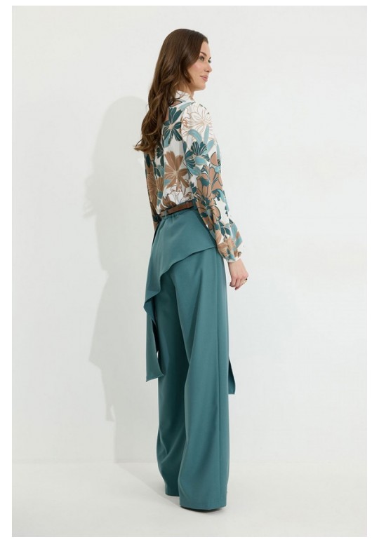 Брюки прямого силуэта из костюмной ткани. По верху брюк притачной пояс со шлевками для ремня. По переду и спинке декоративная отлетная деталь. На левой передней половинке брюк разрез . В левом боковом шве потайная молния. По задним половинкам брюк на поясе резинка от вытачки до вытачки. Обращаем ваше внимание, что фурнитура может отличаться от фото. !Декоративный пояс в комплект не входит ! Подходит на рост 164-170 см. Длина брюк (44-48р – 112+4см пояс)(50-54р - 113+4см пояс).