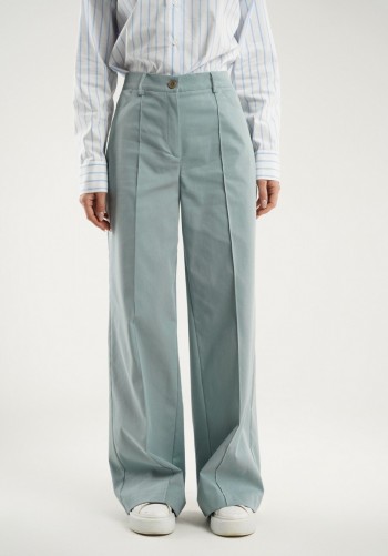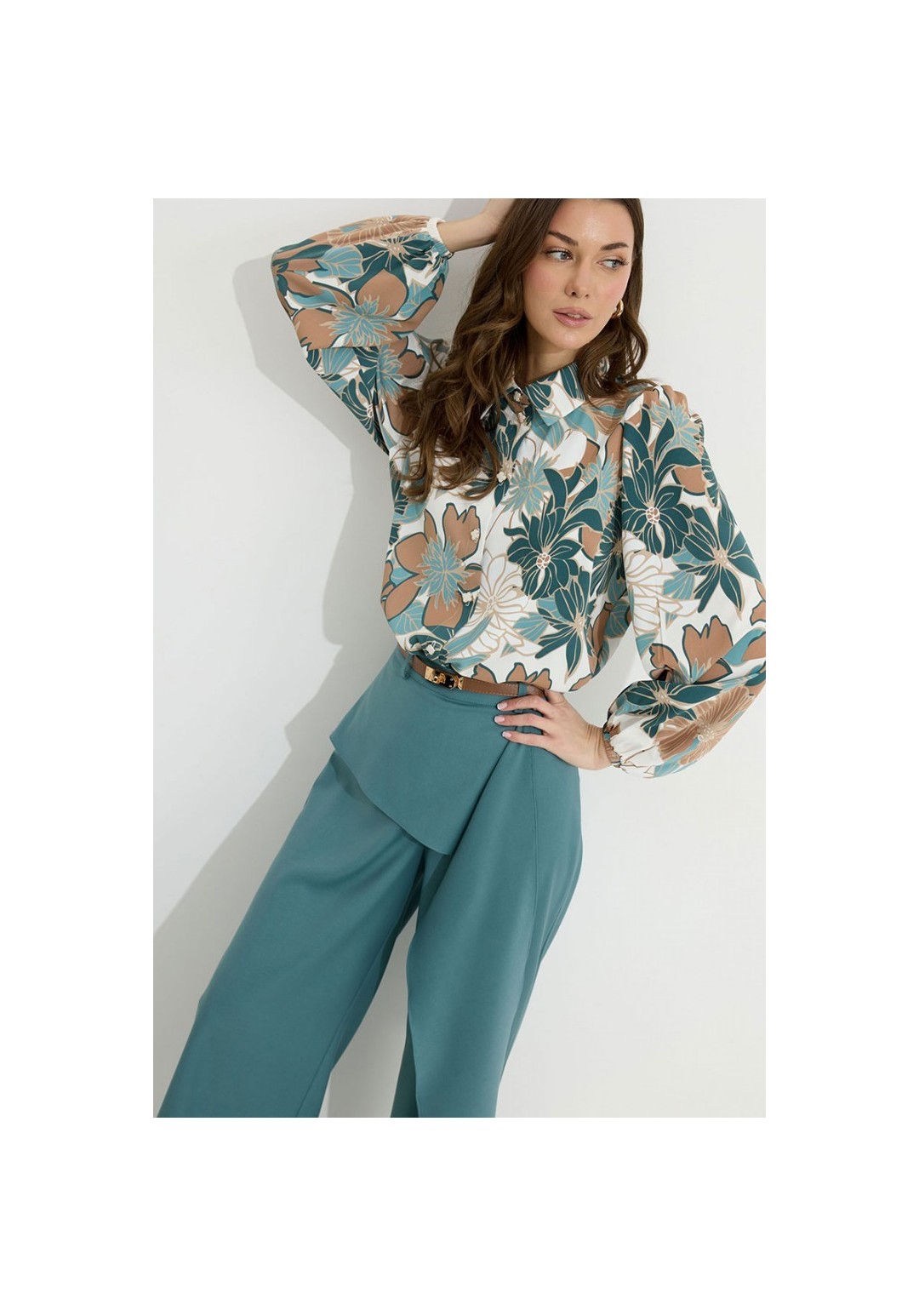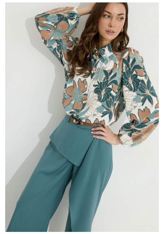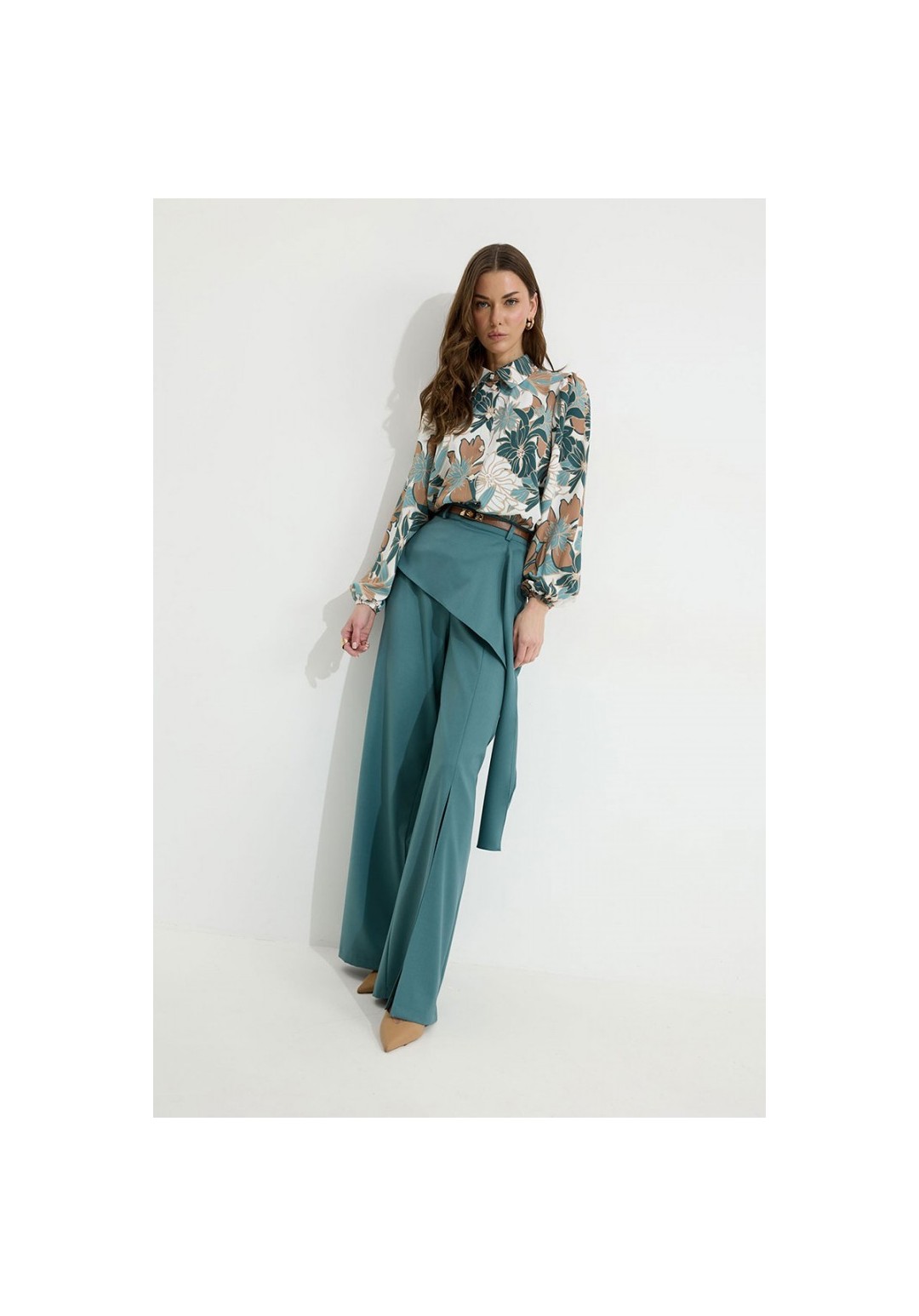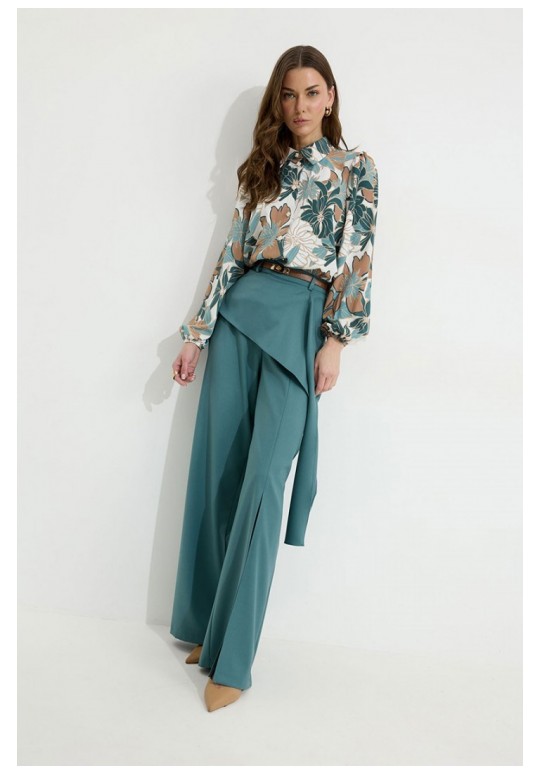 Брюки прямого силуэта из костюмной ткани. По верху брюк притачной пояс со шлевками для ремня. По переду и спинке декоративная отлетная деталь. На левой передней половинке брюк разрез . В левом боковом шве потайная молния. По задним половинкам брюк на поясе резинка от вытачки до вытачки. Обращаем ваше внимание, что фурнитура может отличаться от фото. !Декоративный пояс в комплект не входит ! Подходит на рост 164-170 см. Длина брюк (44-48р – 112+4см пояс)(50-54р - 113+4см пояс).