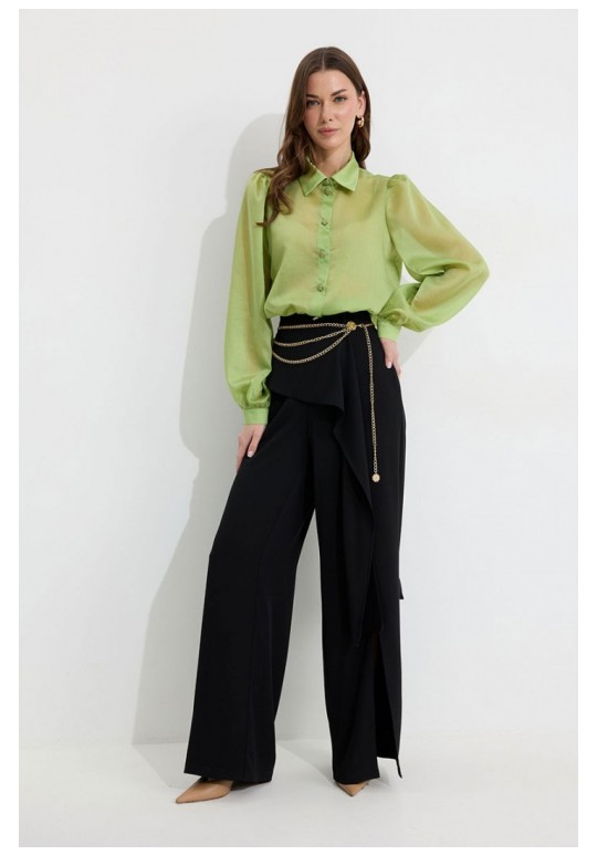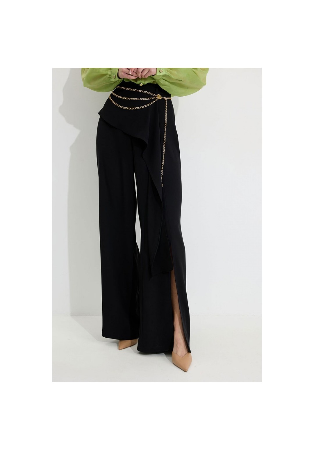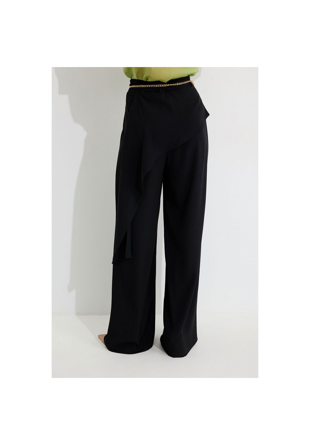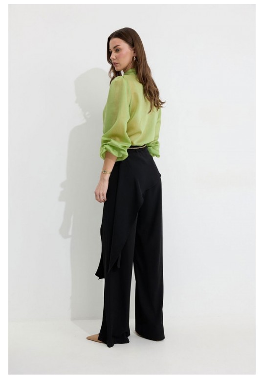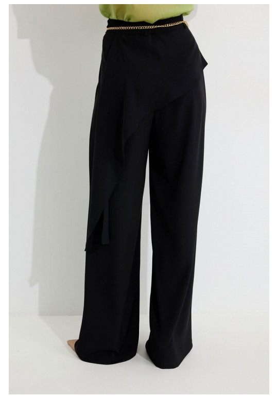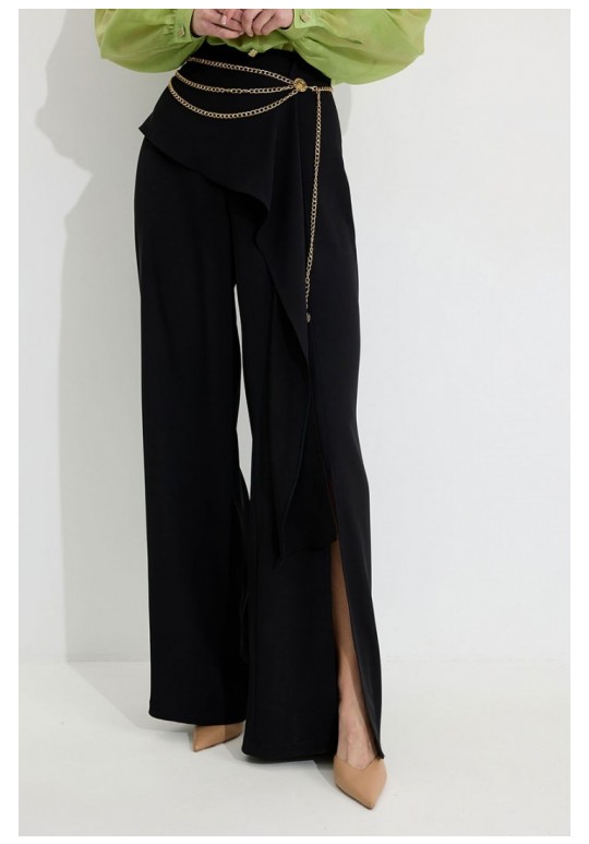 Брюки прямого силуэта из костюмной ткани. По верху брюк притачной пояс со шлевками для ремня. По переду и спинке декоративная отлетная деталь. На левой передней половинке брюк разрез . В левом боковом шве потайная молния. По задним половинкам брюк на поясе резинка от вытачки до вытачки. Обращаем ваше внимание, что фурнитура может отличаться от фото. !Декоративный пояс в комплект не входит ! Подходит на рост 164-170 см. Длина брюк (44-48р – 112+4см пояс)(50-54р - 113+4см пояс).