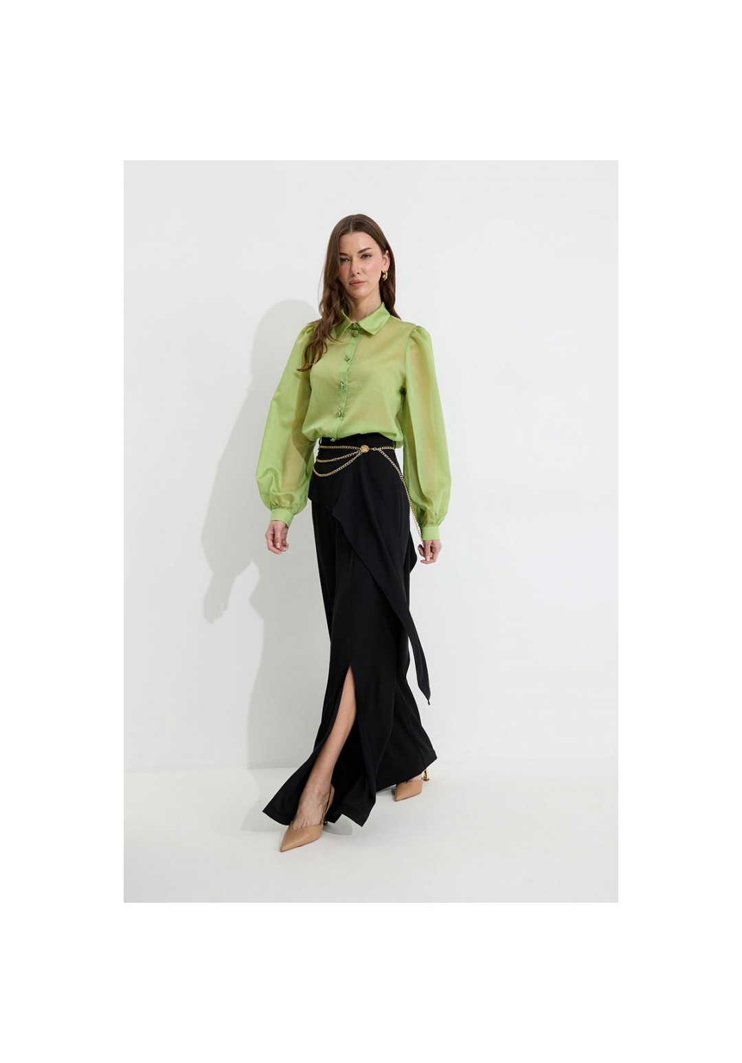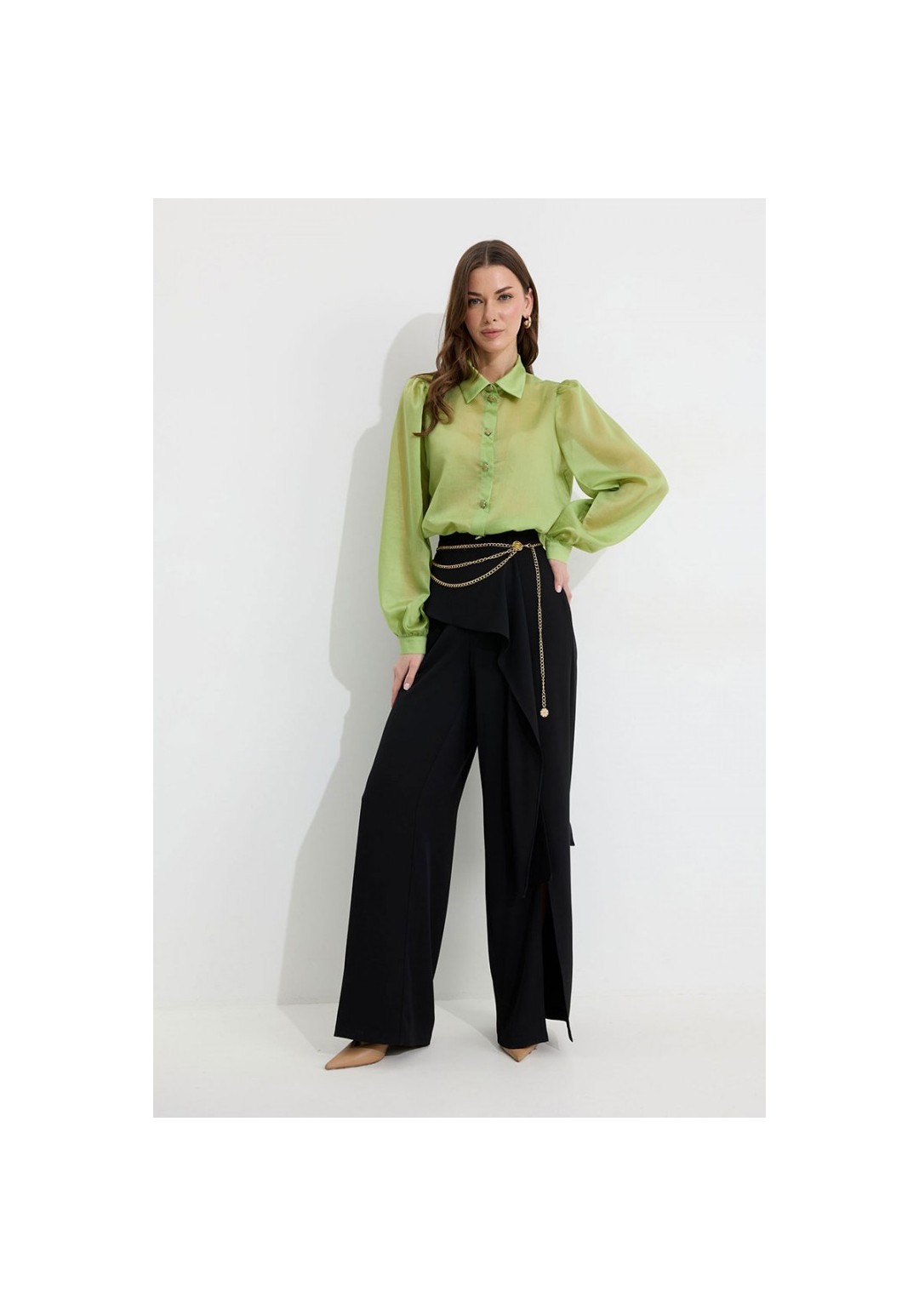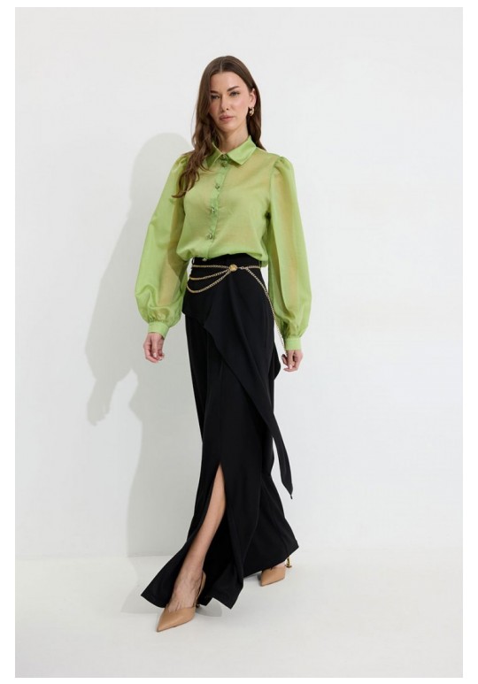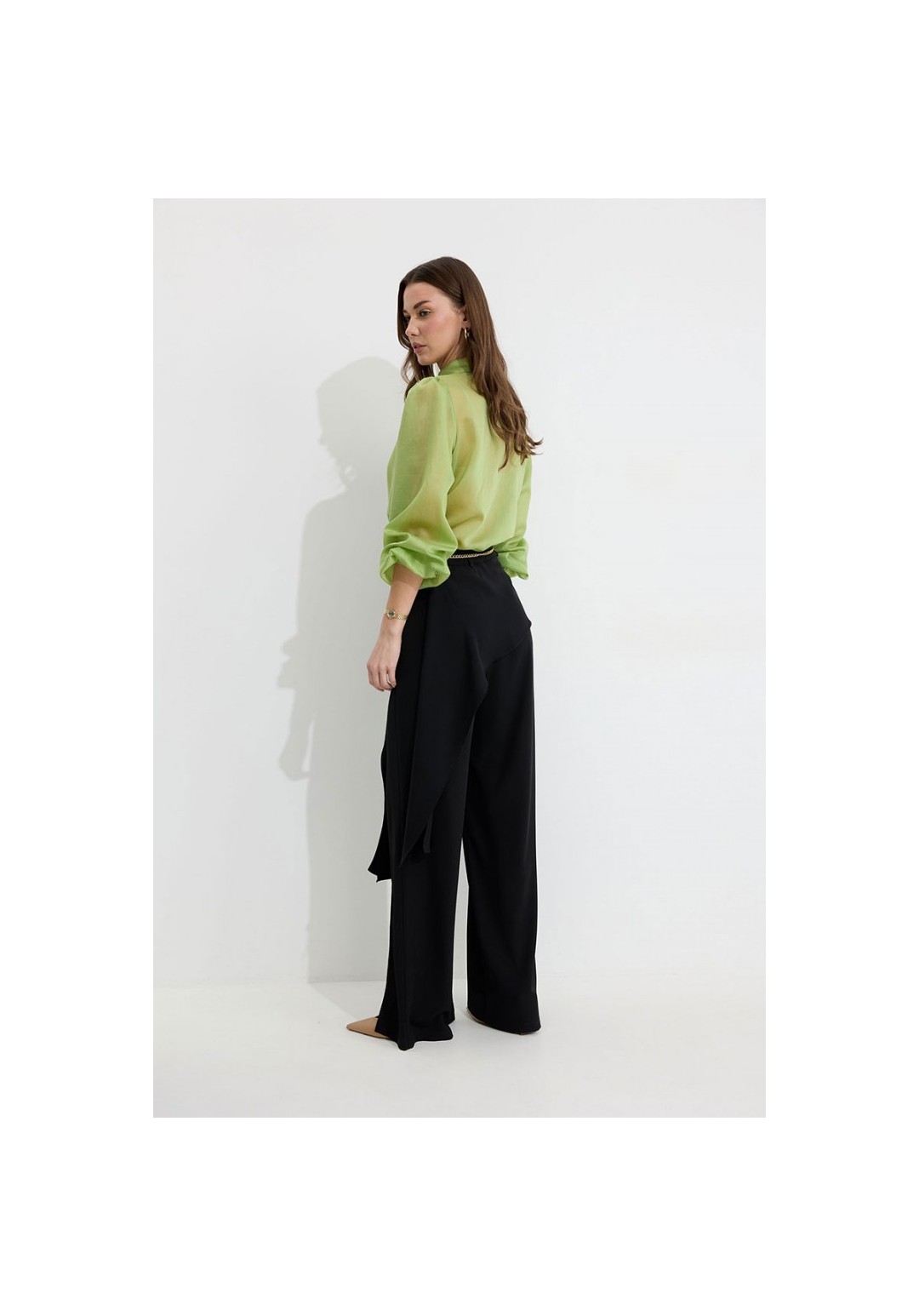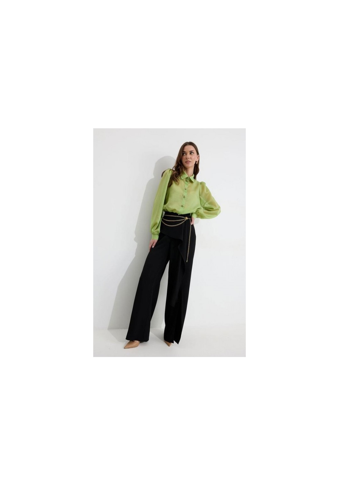 Брюки прямого силуэта из костюмной ткани. По верху брюк притачной пояс со шлевками для ремня. По переду и спинке декоративная отлетная деталь. На левой передней половинке брюк разрез . В левом боковом шве потайная молния. По задним половинкам брюк на поясе резинка от вытачки до вытачки. Обращаем ваше внимание, что фурнитура может отличаться от фото. !Декоративный пояс в комплект не входит ! Подходит на рост 164-170 см. Длина брюк (44-48р – 112+4см пояс)(50-54р - 113+4см пояс).