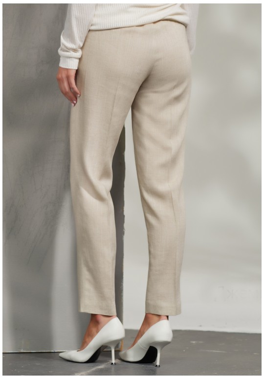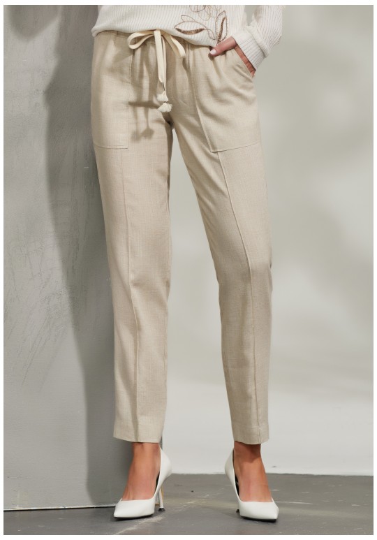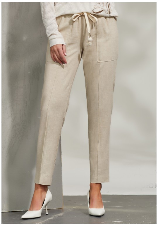 Брюки средней посадки слегка заужены к низу. На поясе резинка с регулируемым шнурком и боковые карманы.