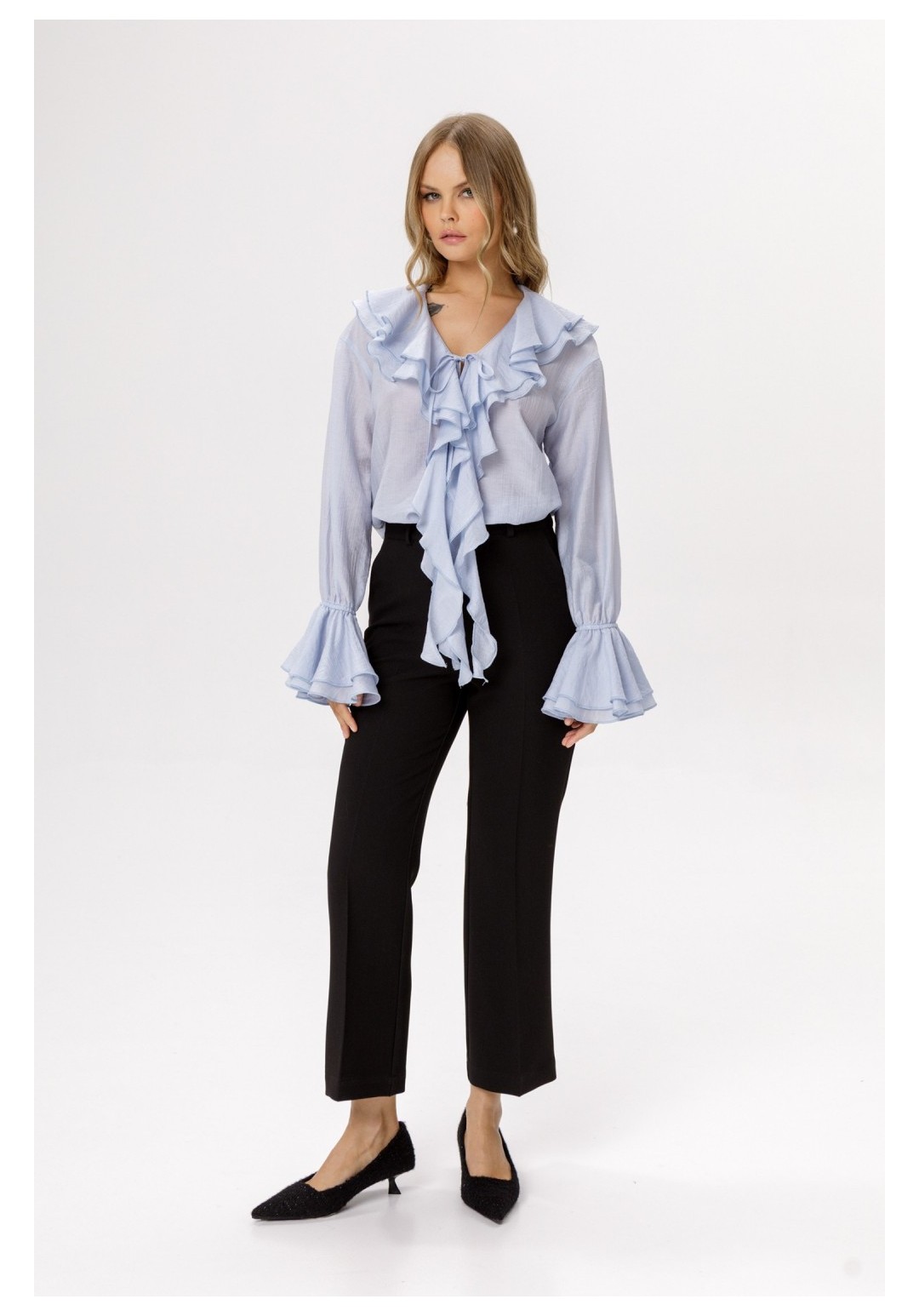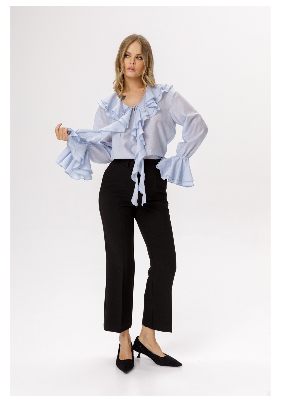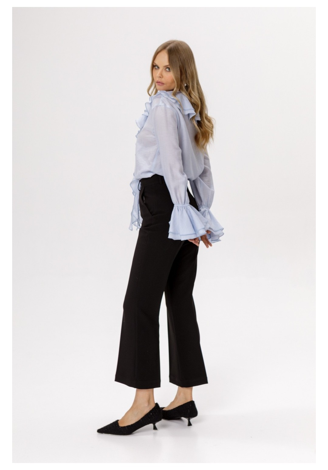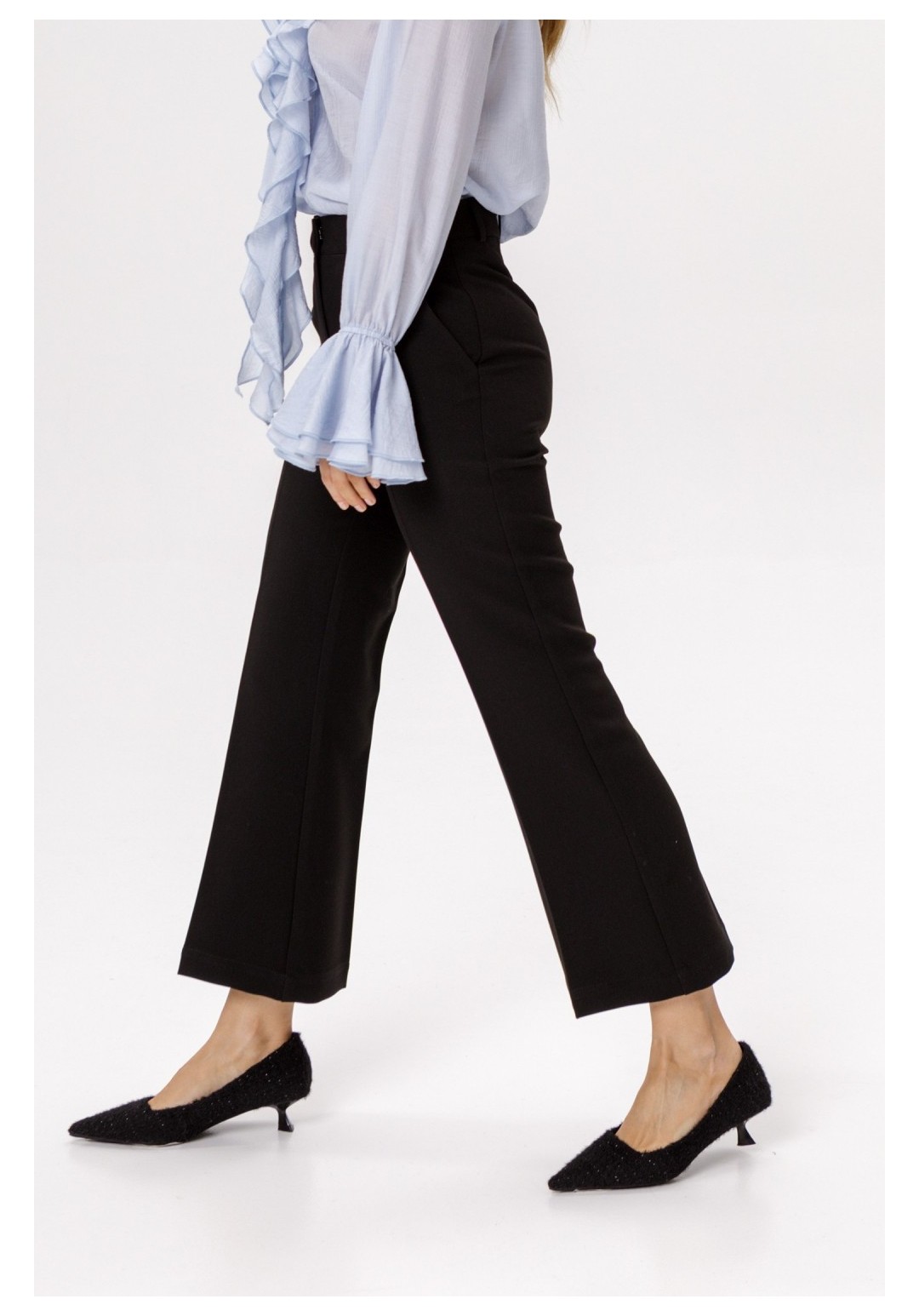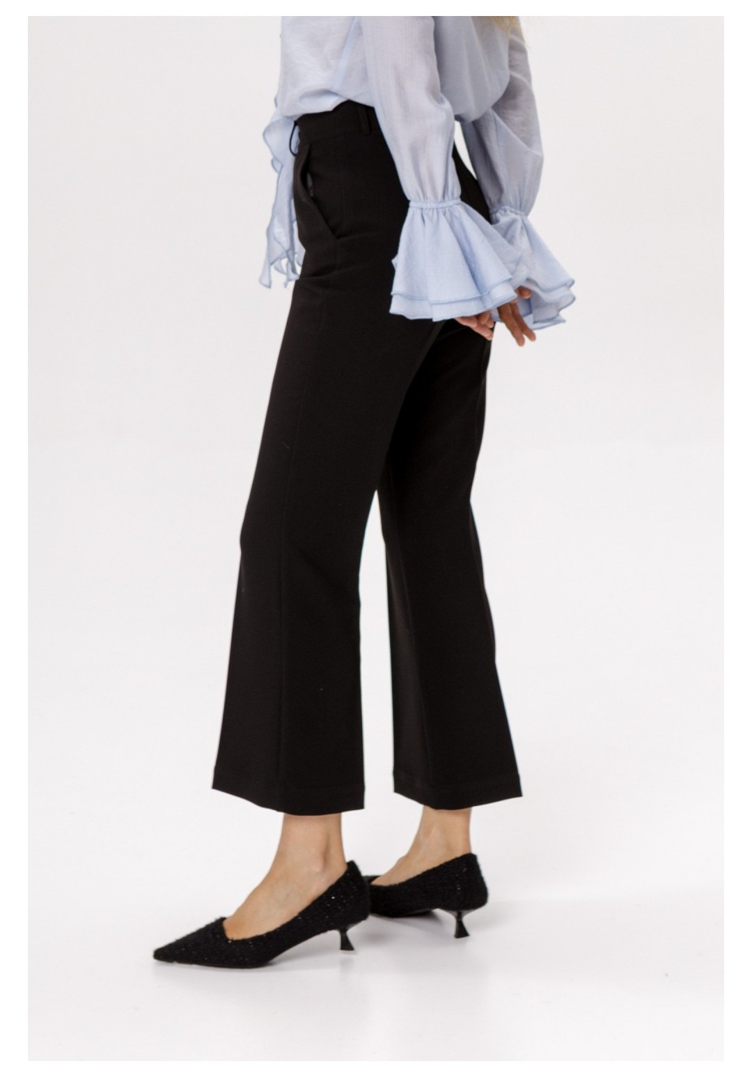 Укороченные брюки-клёш со стрелками (приобрести блузу с фото можно по арт. 6561). Детали: брюки клёш с притачным поясом со шлёвками, наклонные карманы в боковых швах, застёжка на молнию и крючок, талиевые вытачки на передних и задних половинках брюк. Длина по боковому шву с поясом около 96 см в размерах 40-46 и около 98 см в размерах 48-52. Длина по внутреннему шву около 67 см