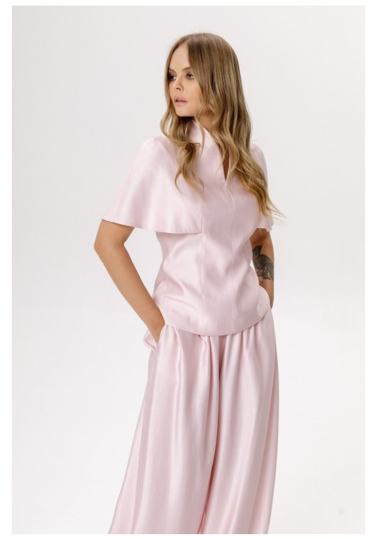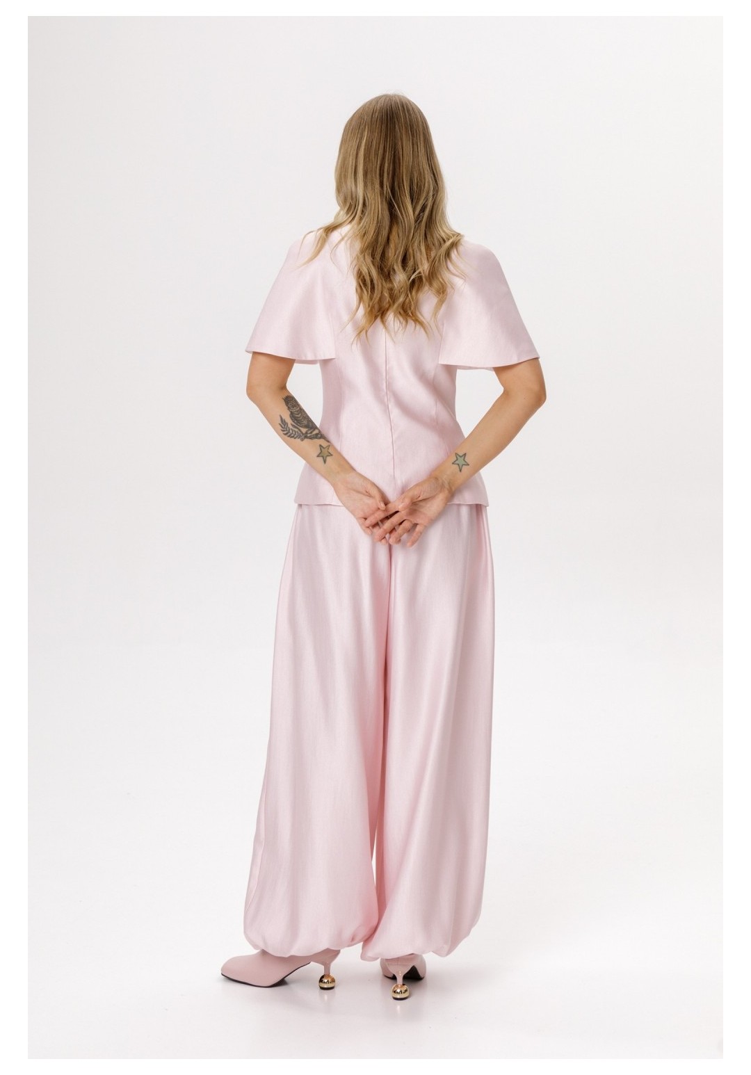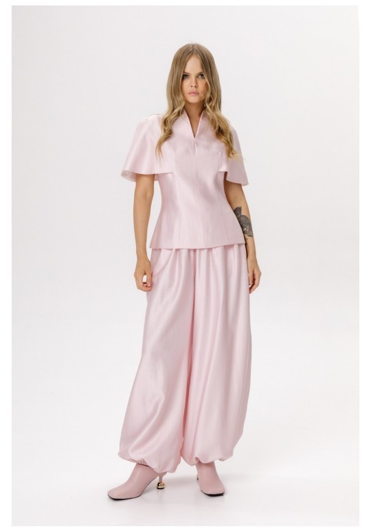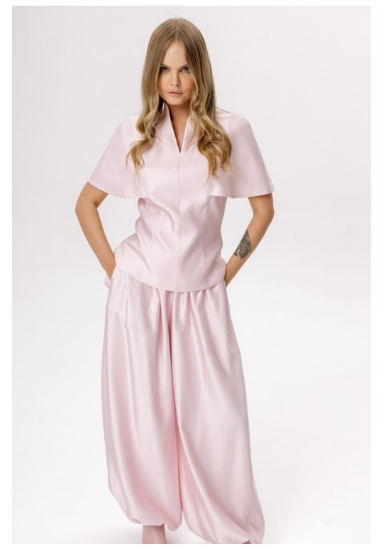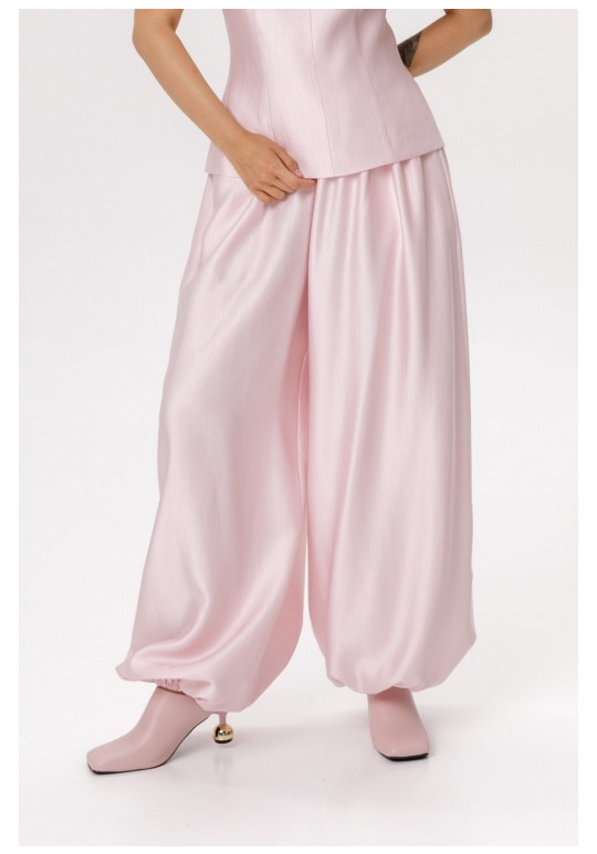 Широкие брюки-алладины (приобрести блузу с фото можно по арт.6583). Детали: брюки О-силуэта, притачной пояс, пояс и манжеты по низу на резинке, карманы в боковых швах. Длина по боковому шву с поясом около 110 см в размерах 40-52. Длина по внутреннему шву около 75 см (приобрести блузу с фото можно по арт.6583)