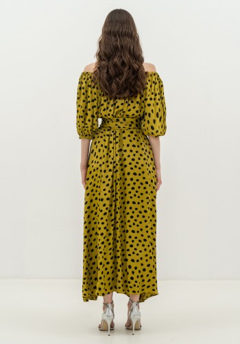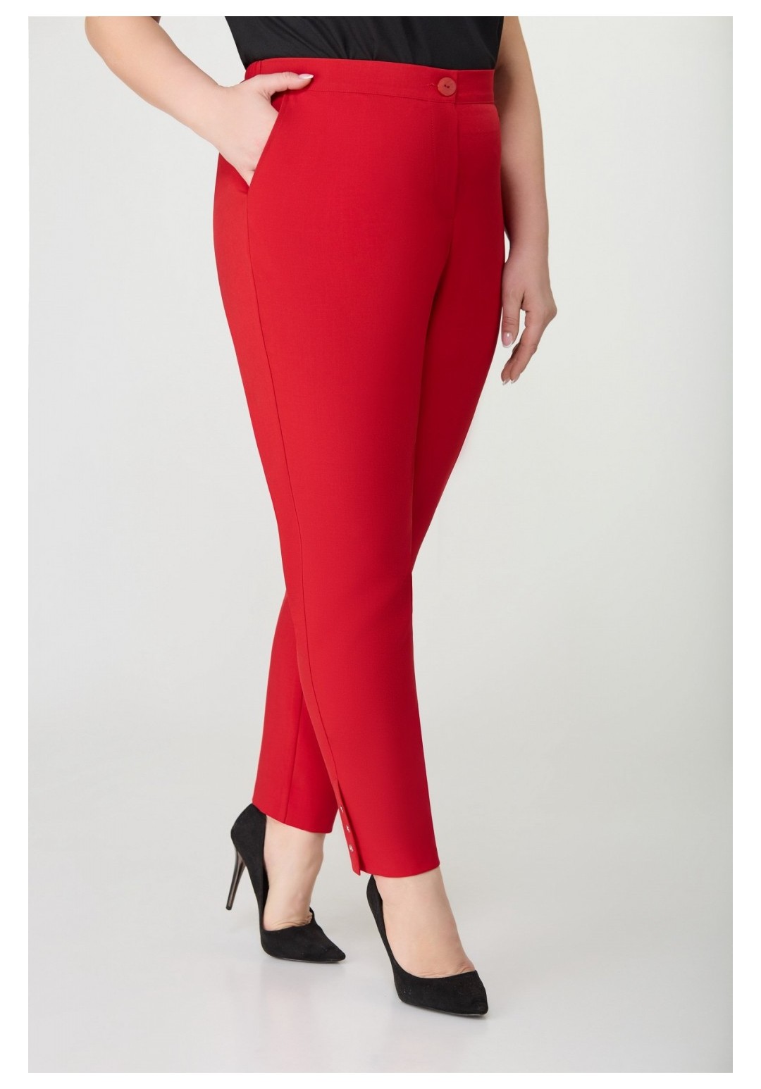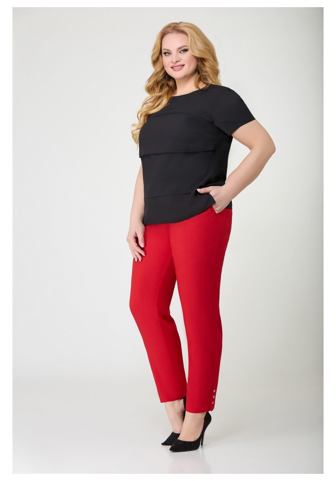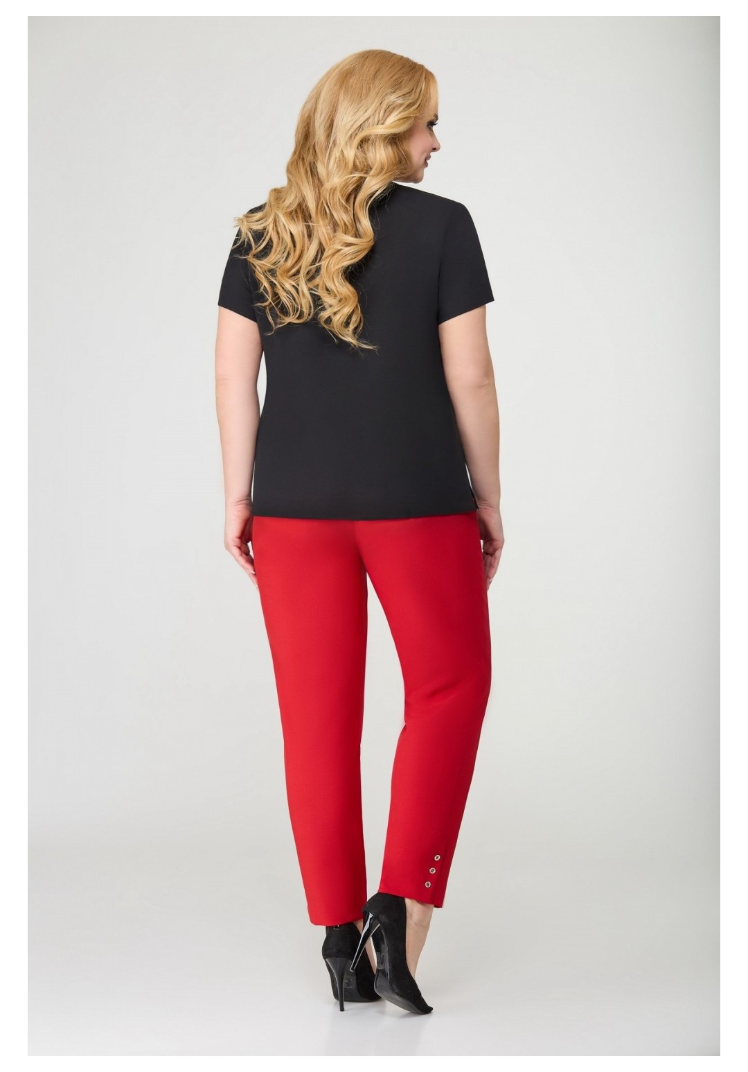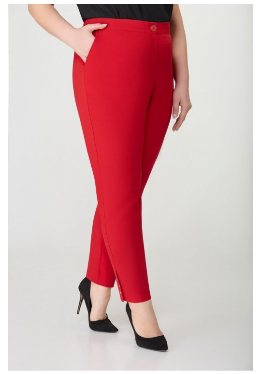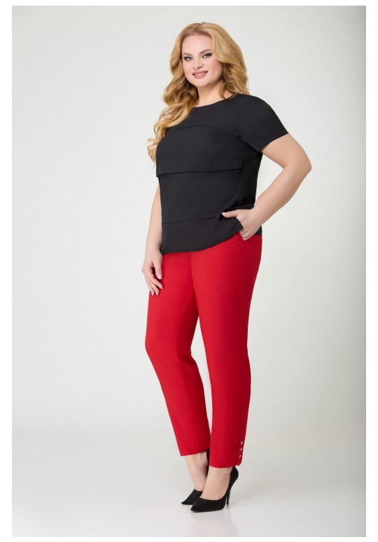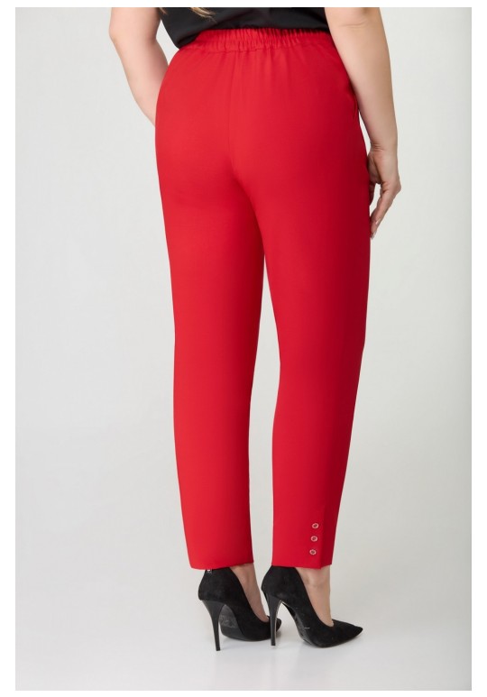 Брюки женские прямые, слегка заужены к низу, по переду обработаны карманы с отрезными бочками. Пояс притачной с резинкой по спинке. По низу в боковом шве выполнена шлица и закреплена тремя пуговицами. Длина по боковому шву 104 см.