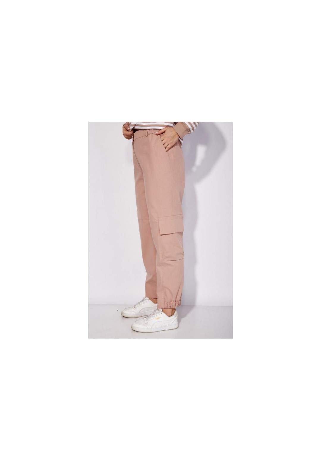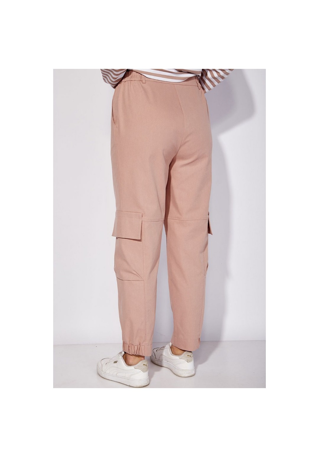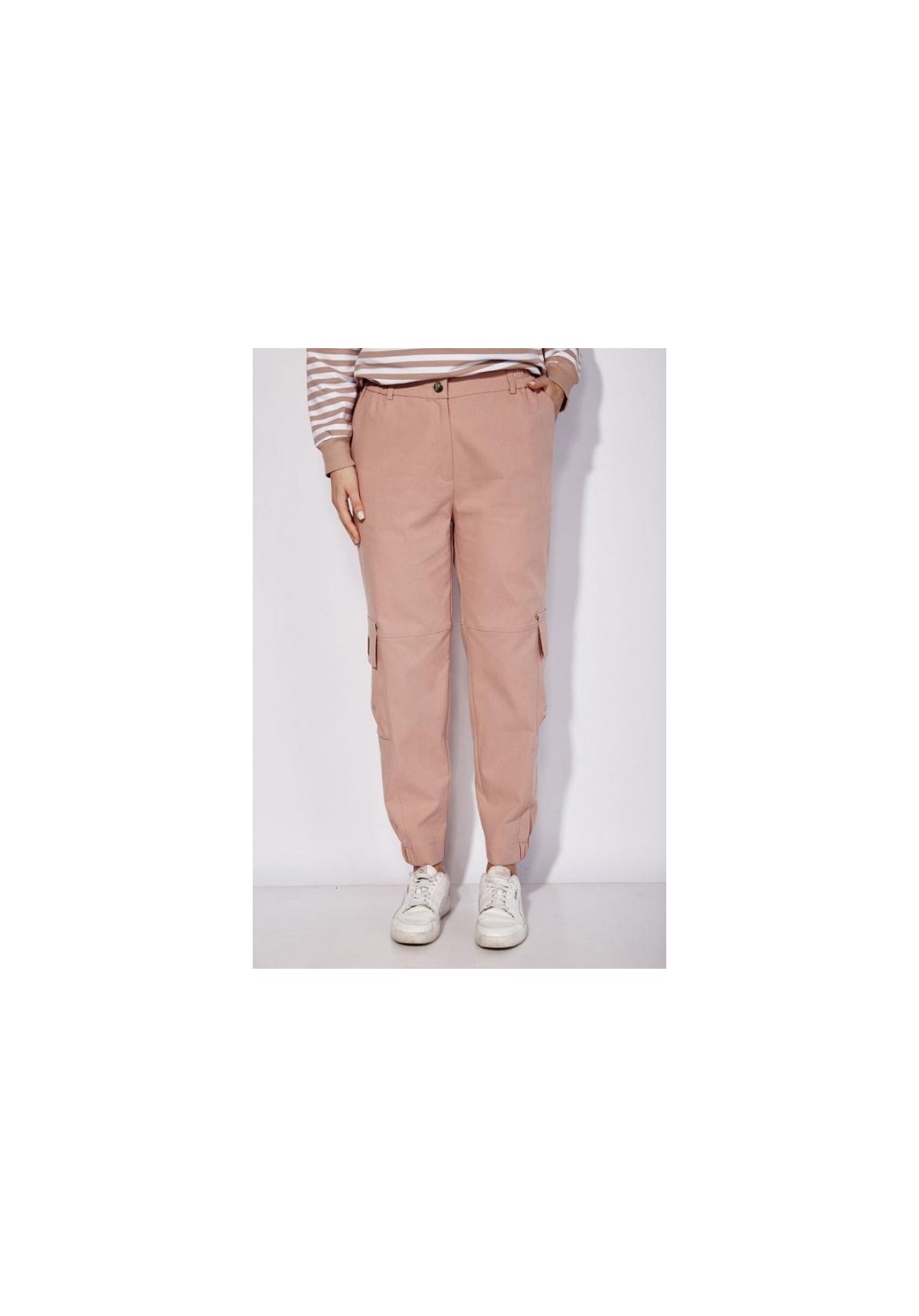 Брюки карго, прямого силуэта, по низу частично на резинке. По переду наклонные карманы. Выше колена горизонтальный подрез и в нижней части вертикальные рельефы с отделочными строчками. По бокам карманы с клапанами и декоративной нашивкой. Застежка спереди на молнию Пояс притачной, с резинками по бокам и шлевками. Застежка пояса спереди на петлю и пуговицу.